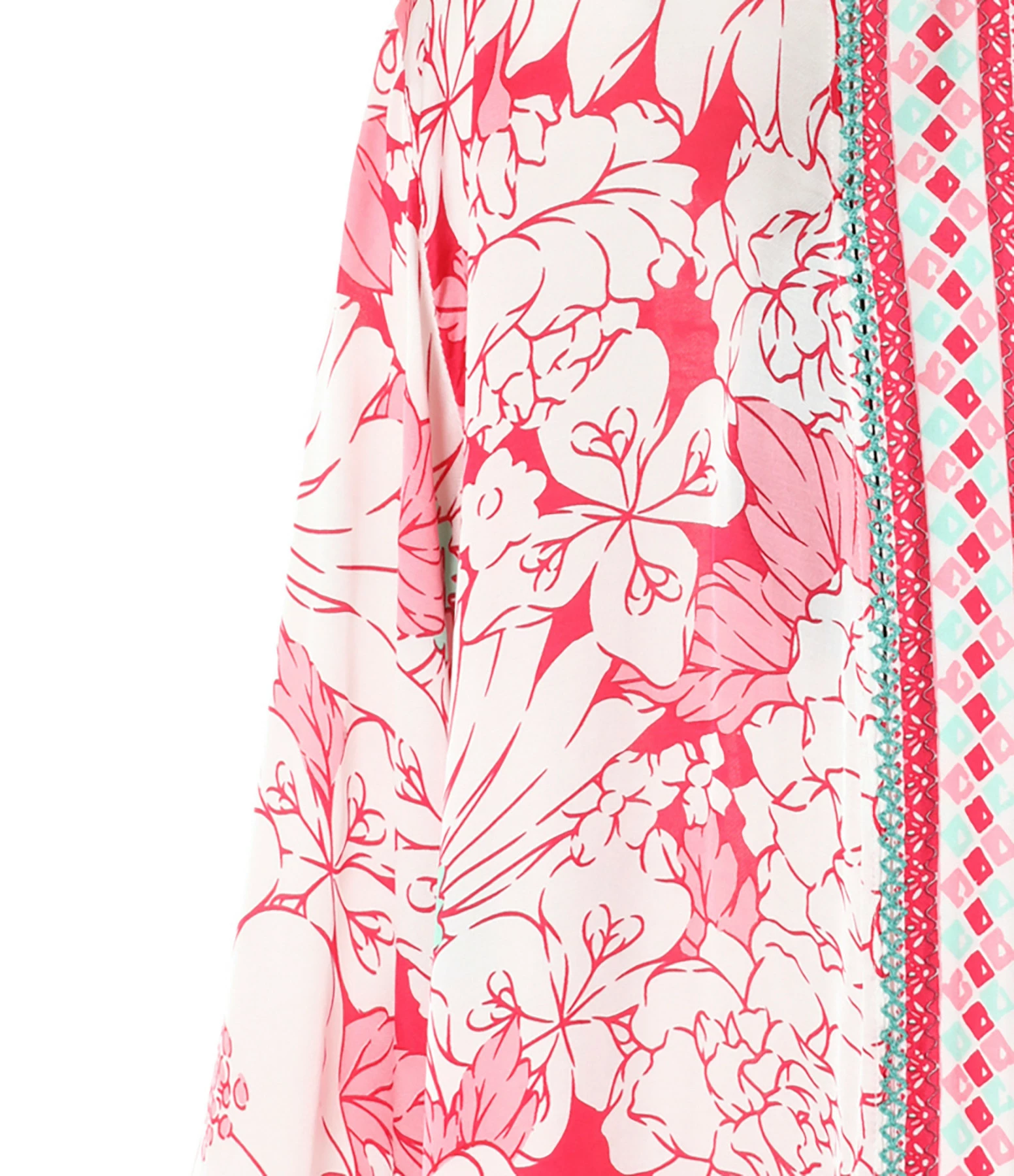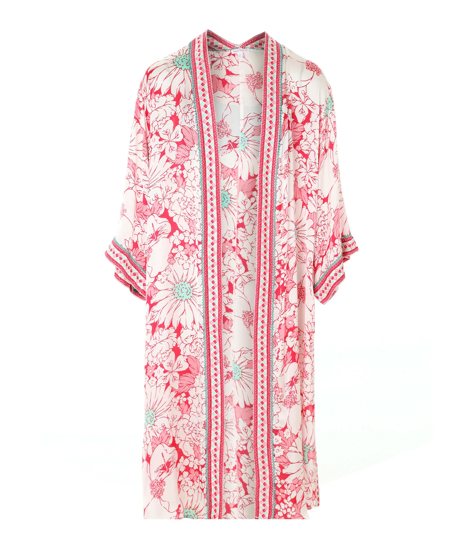 Kimono à imprimé fleuris rose et blanc. Manches courtes. Coupe droite. Base droite avec fentes de 49 cm sur les côtés.