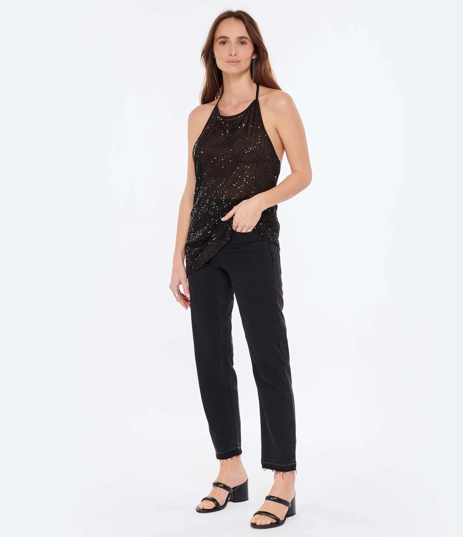 Top dos nu à sequins noirs. Jeu de transparence. Cordons à nouer dans la nuque.