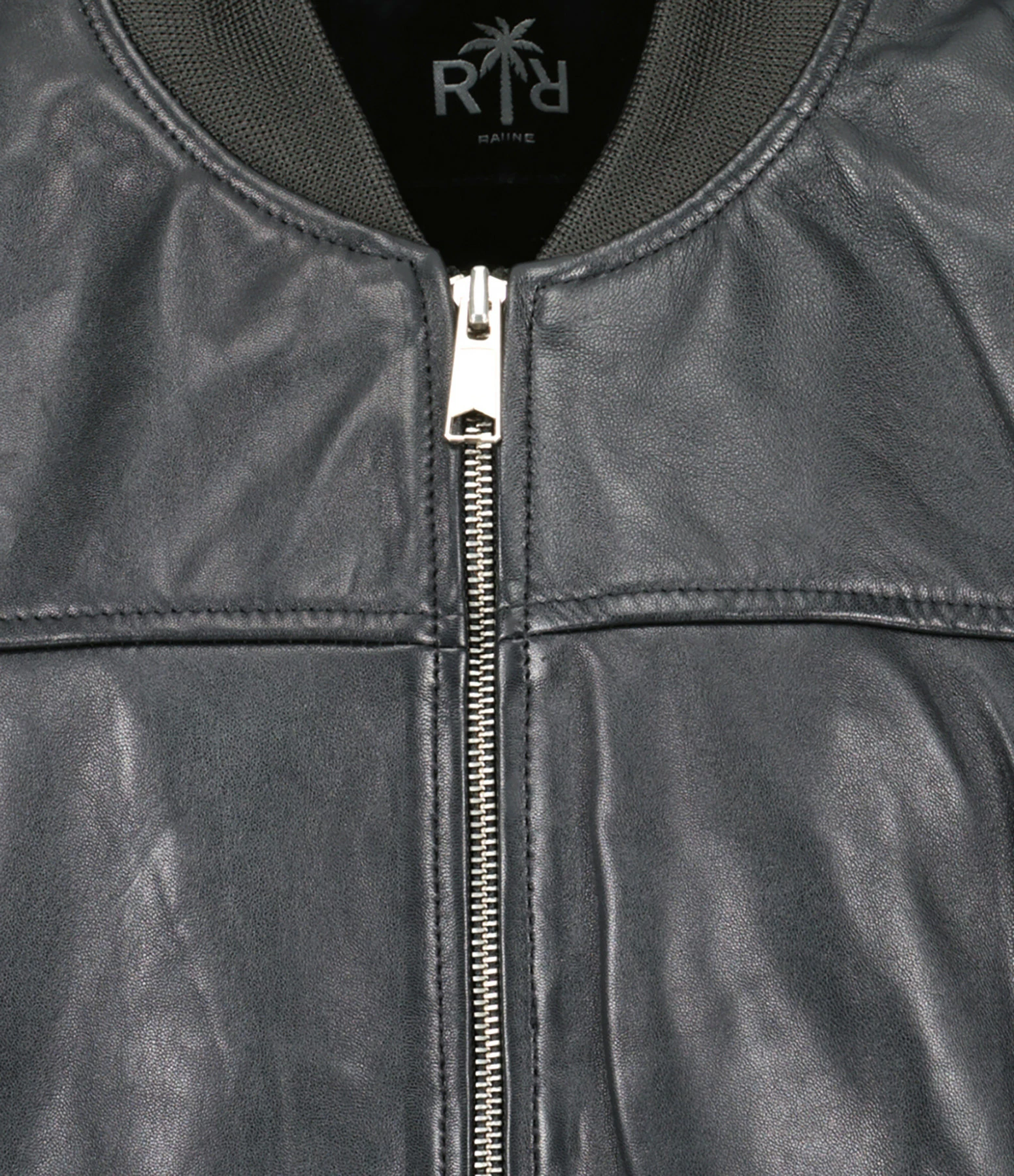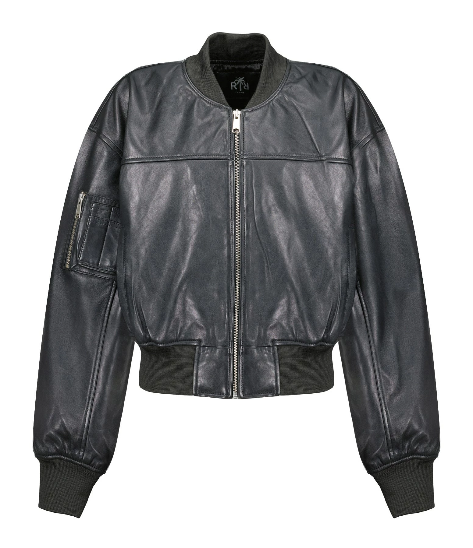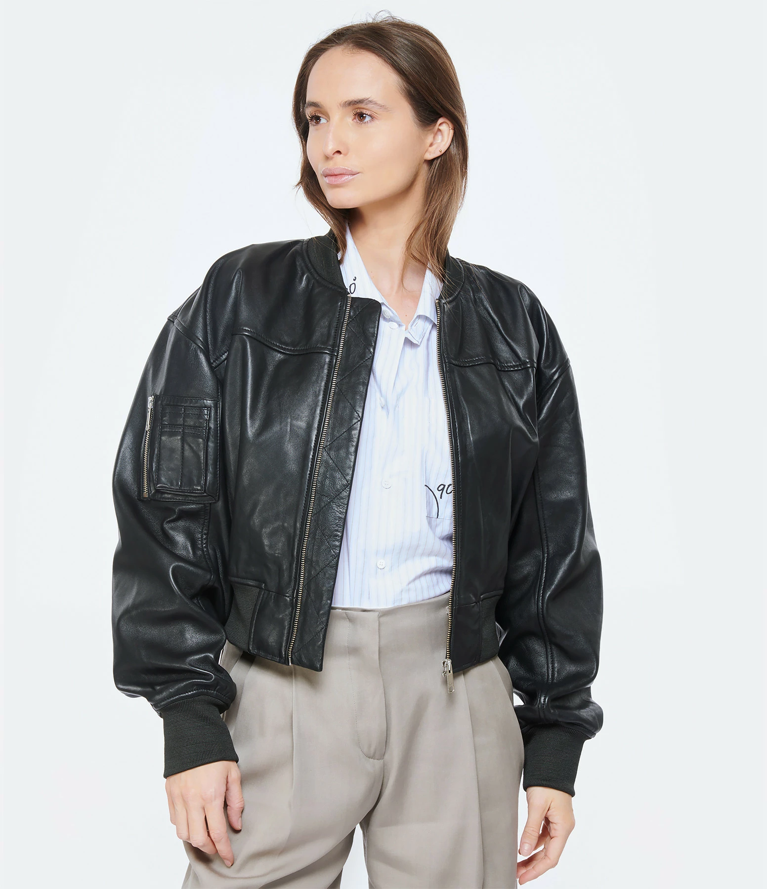 Bomber en cuir noir. Fermeture zippée sur le devant. Manches longues. Col rond. Deux poches sur le devant. Coupe droite. Base droite.
