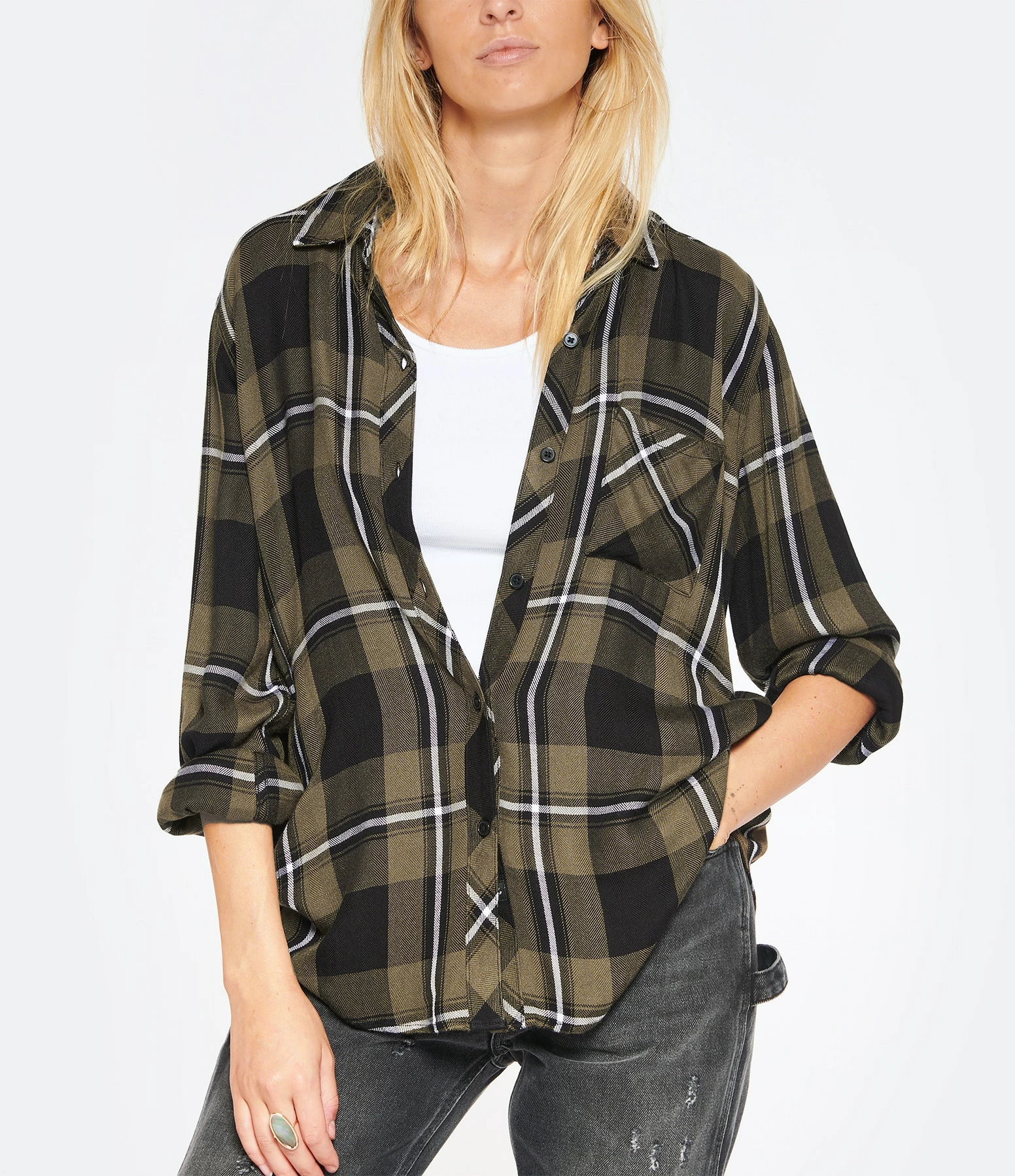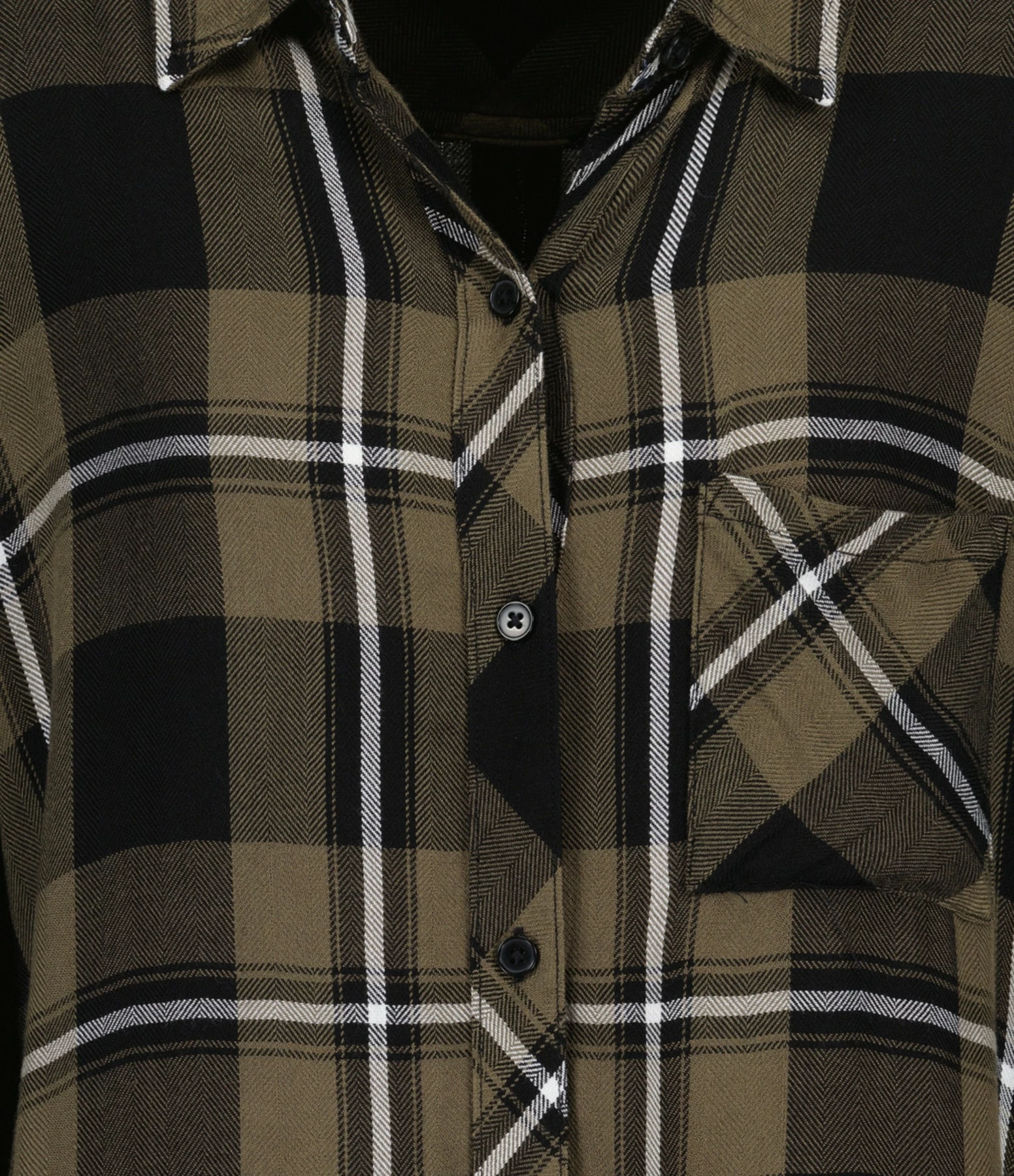 Chemise à carreaux kaki et noire. Col chemise. Manches longues. Fermeture boutonnée. Une poche plaquée poitrine. Coupe droite. Base arrondie.