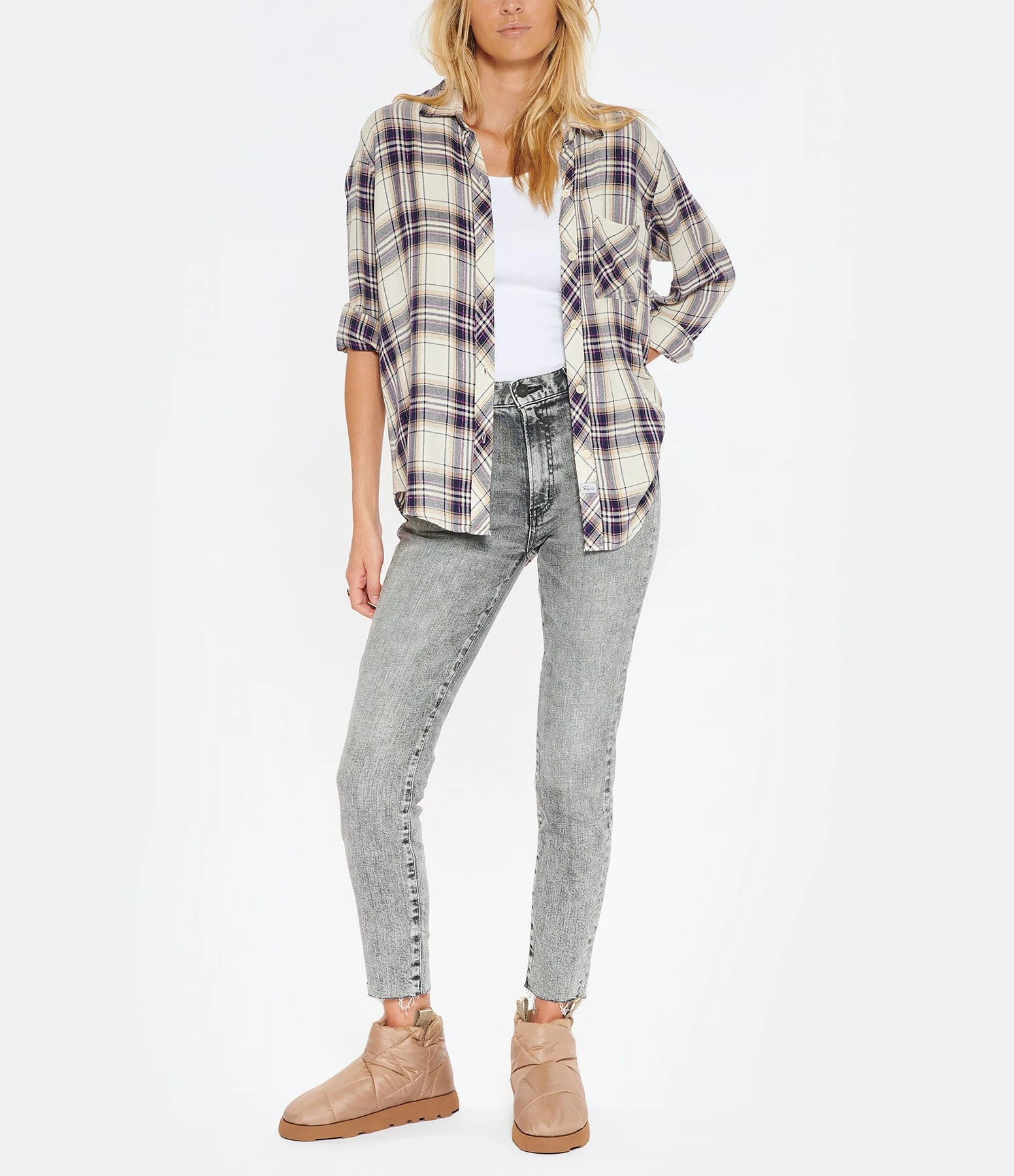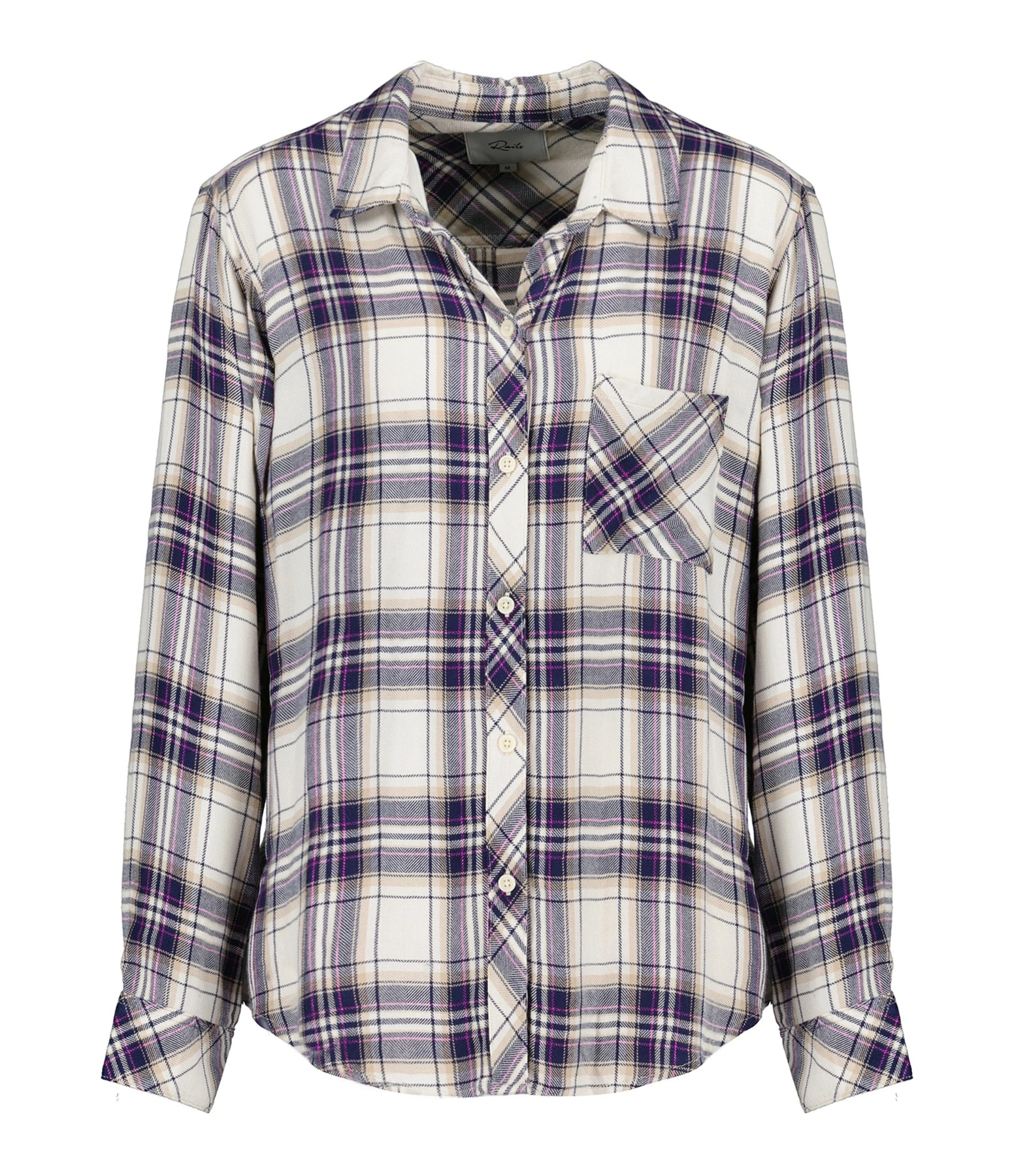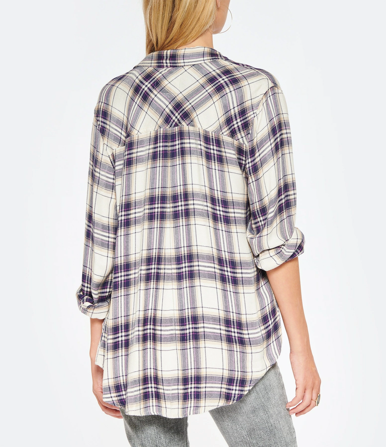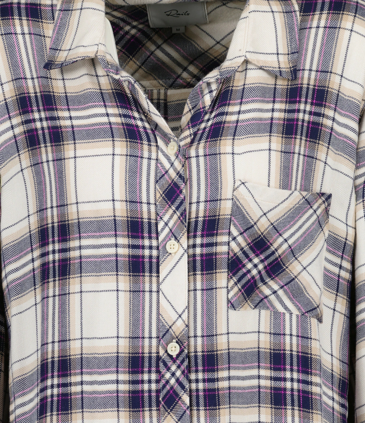 Chemise à carreaux beige et bleu marine. Col chemise. Manches longues. Fermeture boutonnée. Une poche plaquée poitrine. Coupe droite. Base arrondie.
