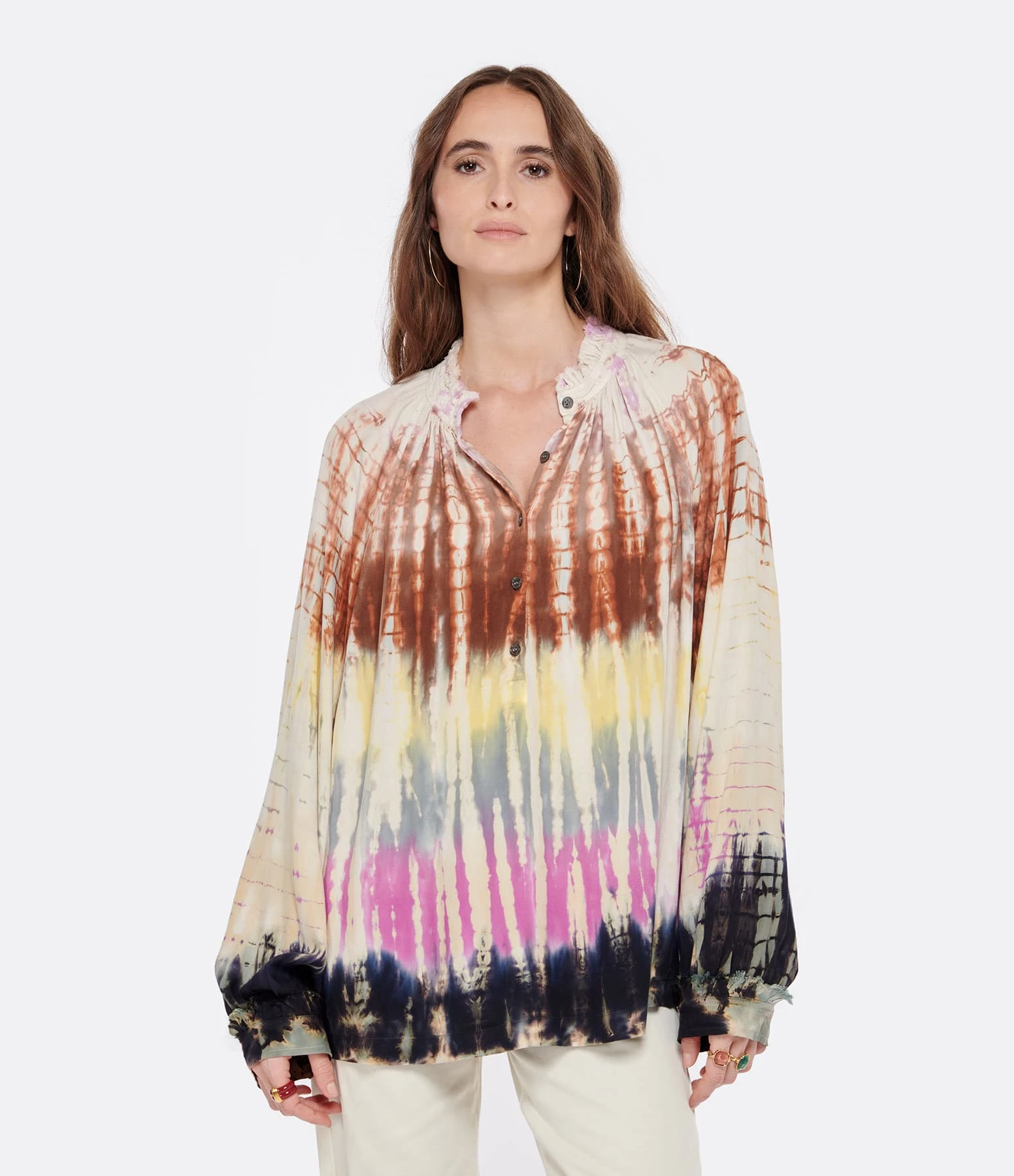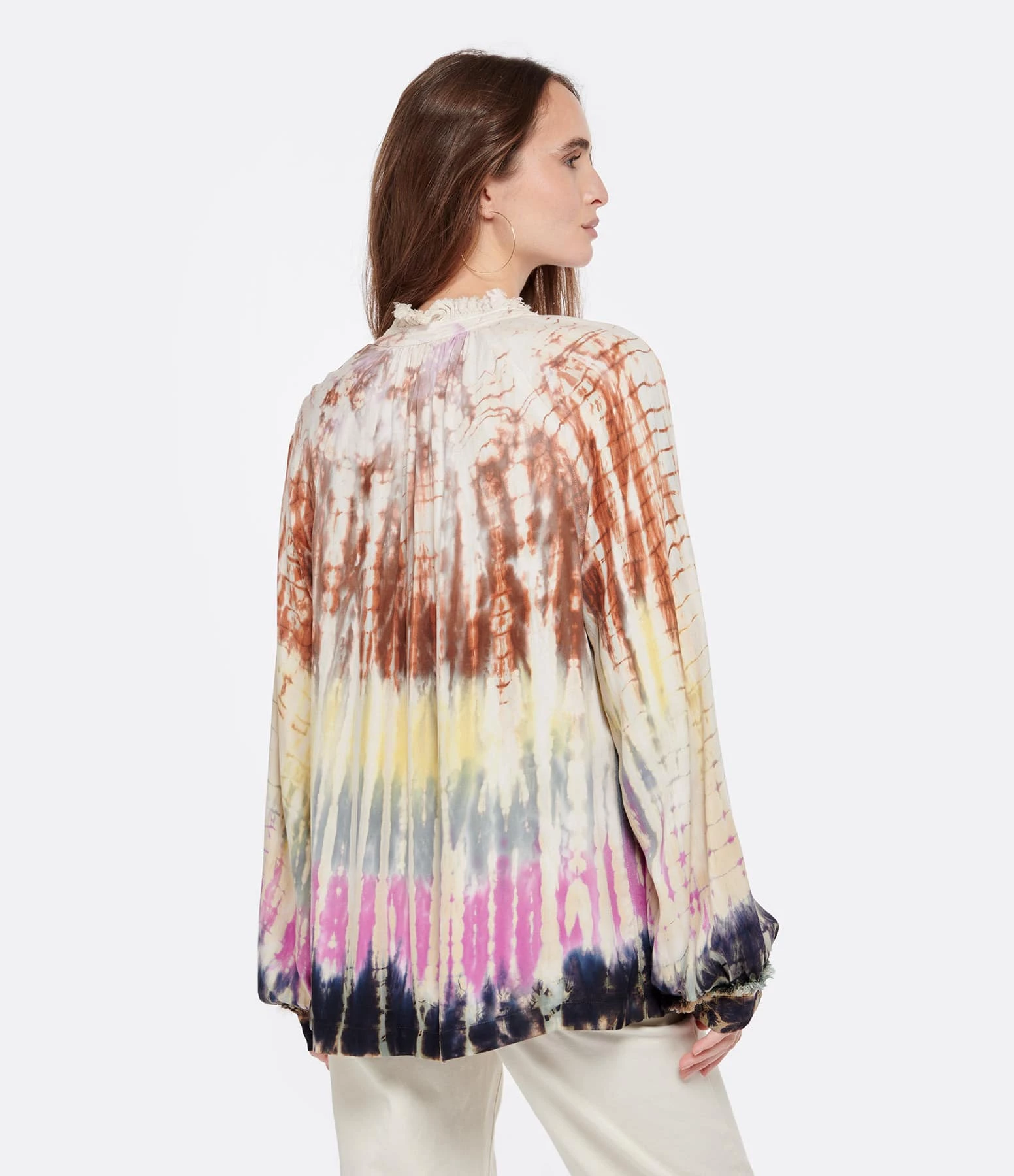 Blouse en coton effet Tie and Dye multicolores. Col rond boutonné. Manches longues. Coupe ample. Base droite.
