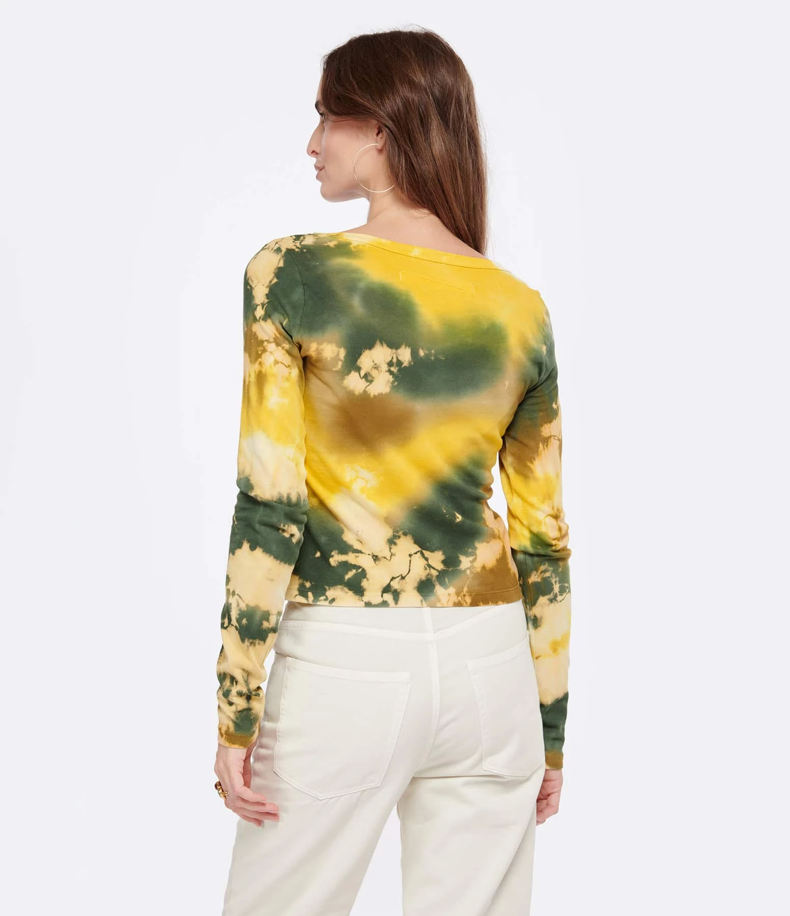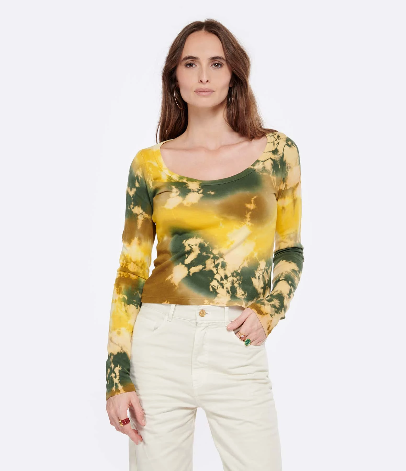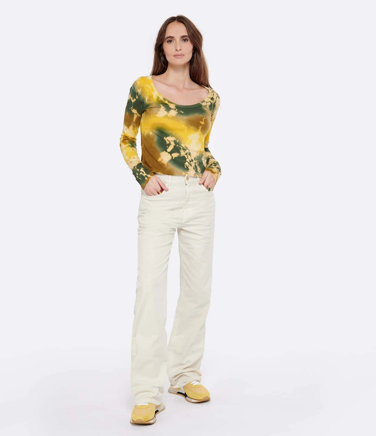 Tee-shirt en coton effet Tie and Dye multicolore majeur jaune. Col rond. Manches longues. Coupe droite. Base droite.