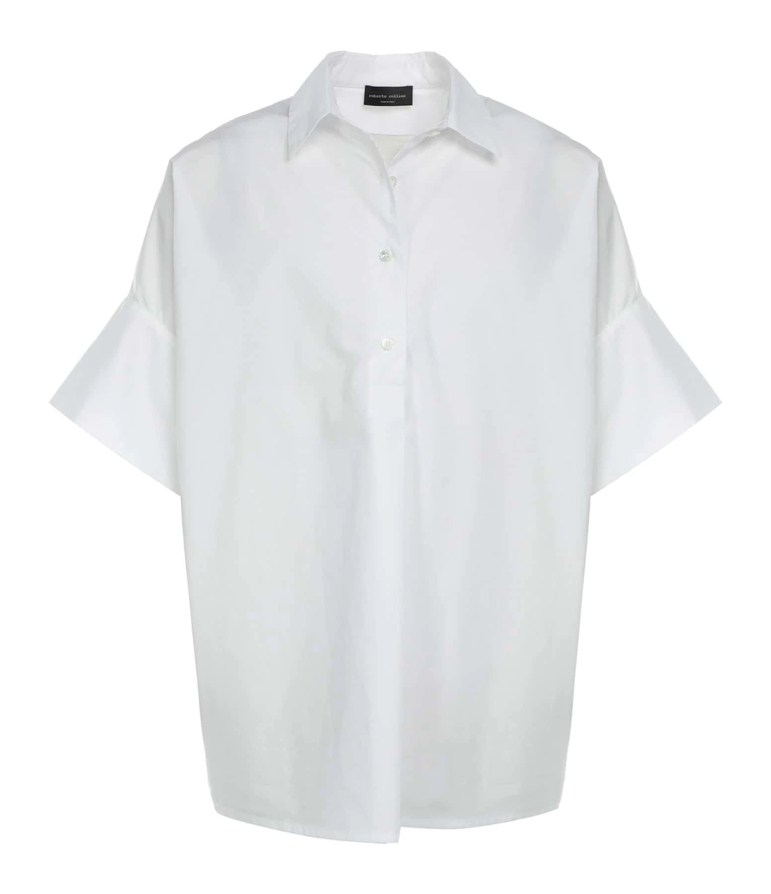 Blouse en coton blanc. Col chemise. Manches courtes effet chauve souris. Fermeture boutonnée. Coupe ample. Base droite.