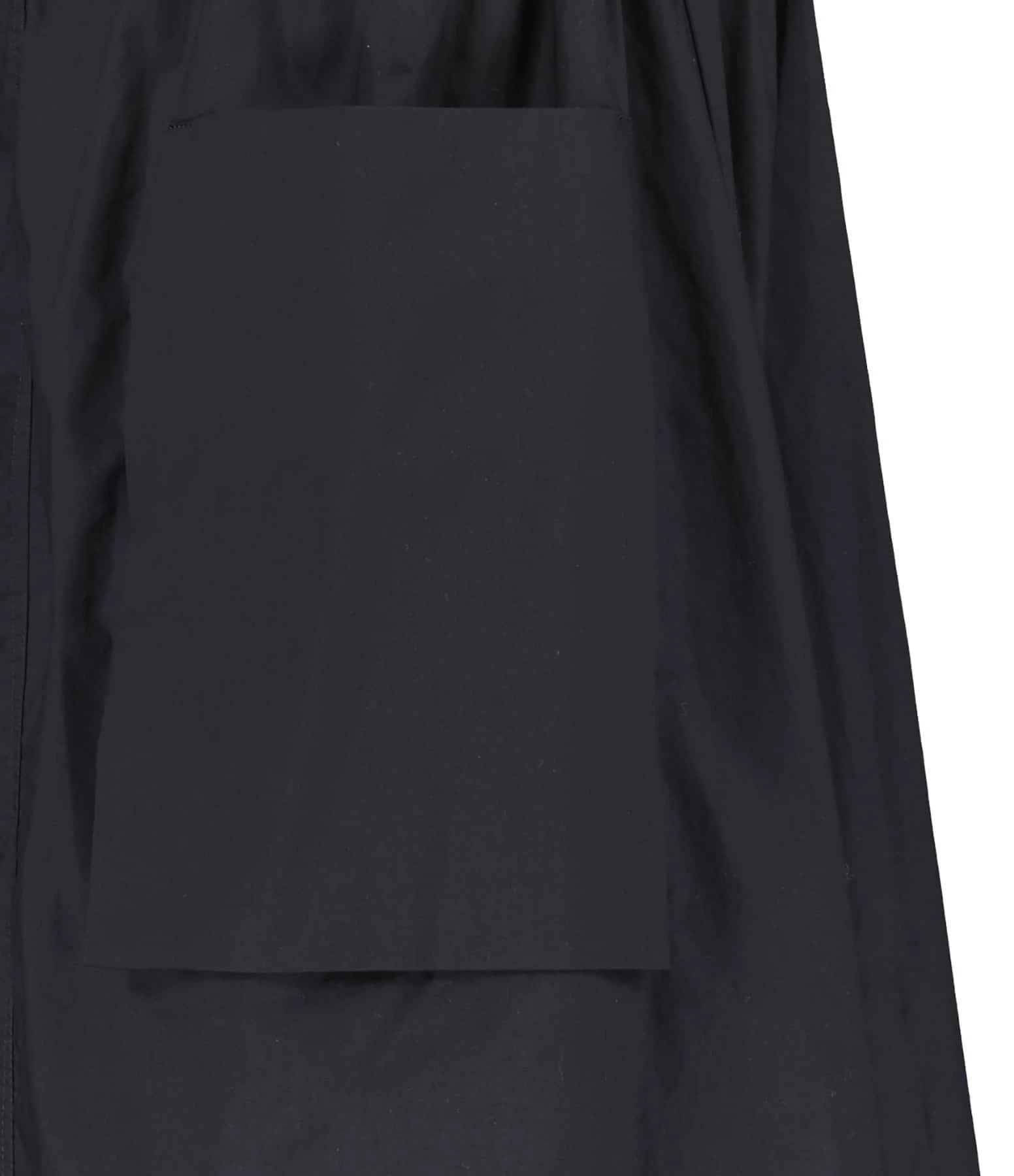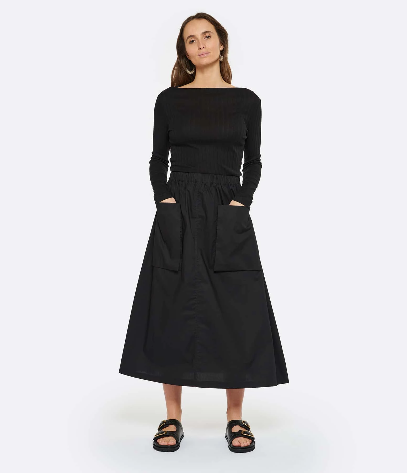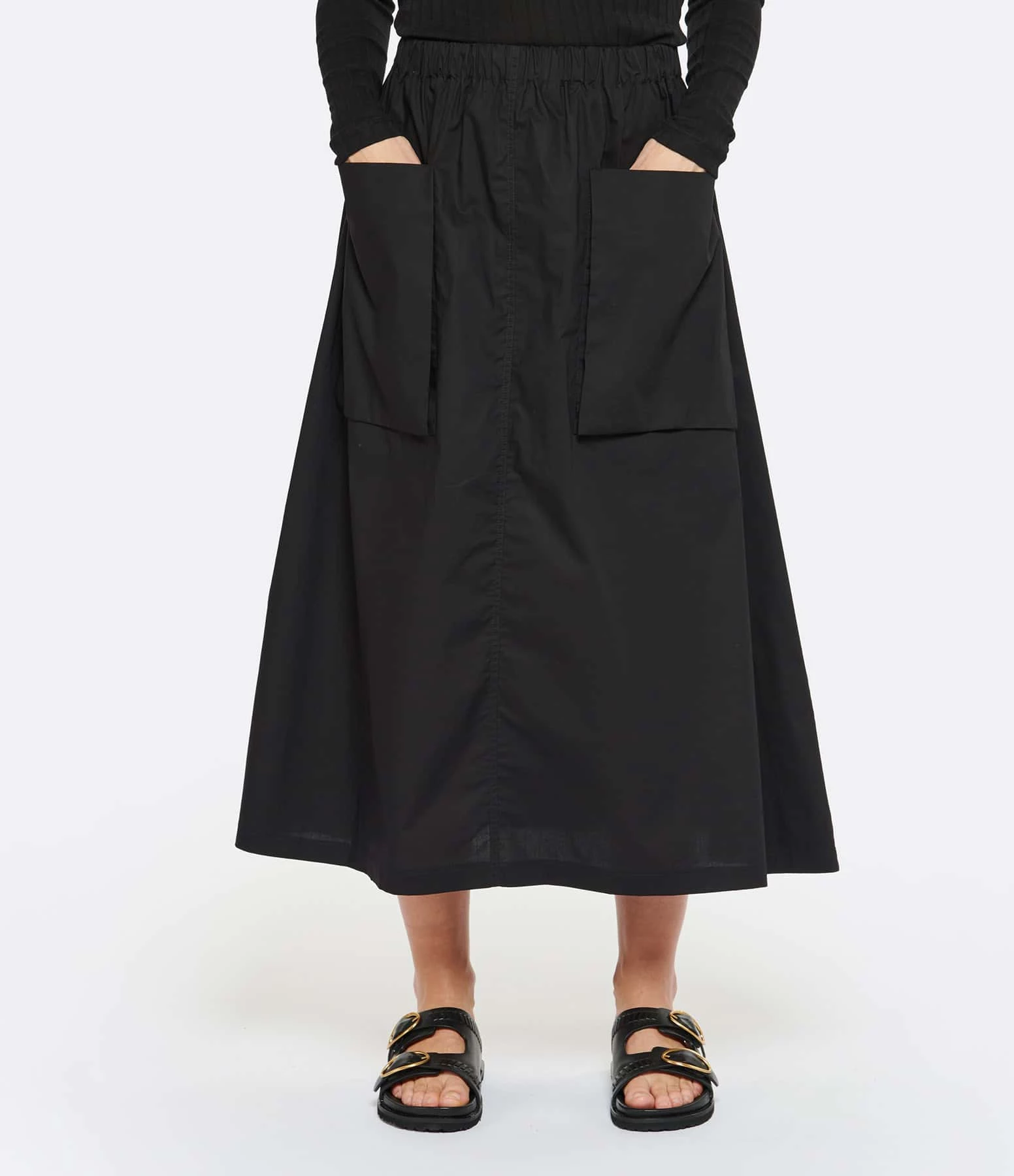 Jupe mi-longue noire. Deux poches plaquées sur le devant. Taille élastiquée. Coupe évasée. Base droite.