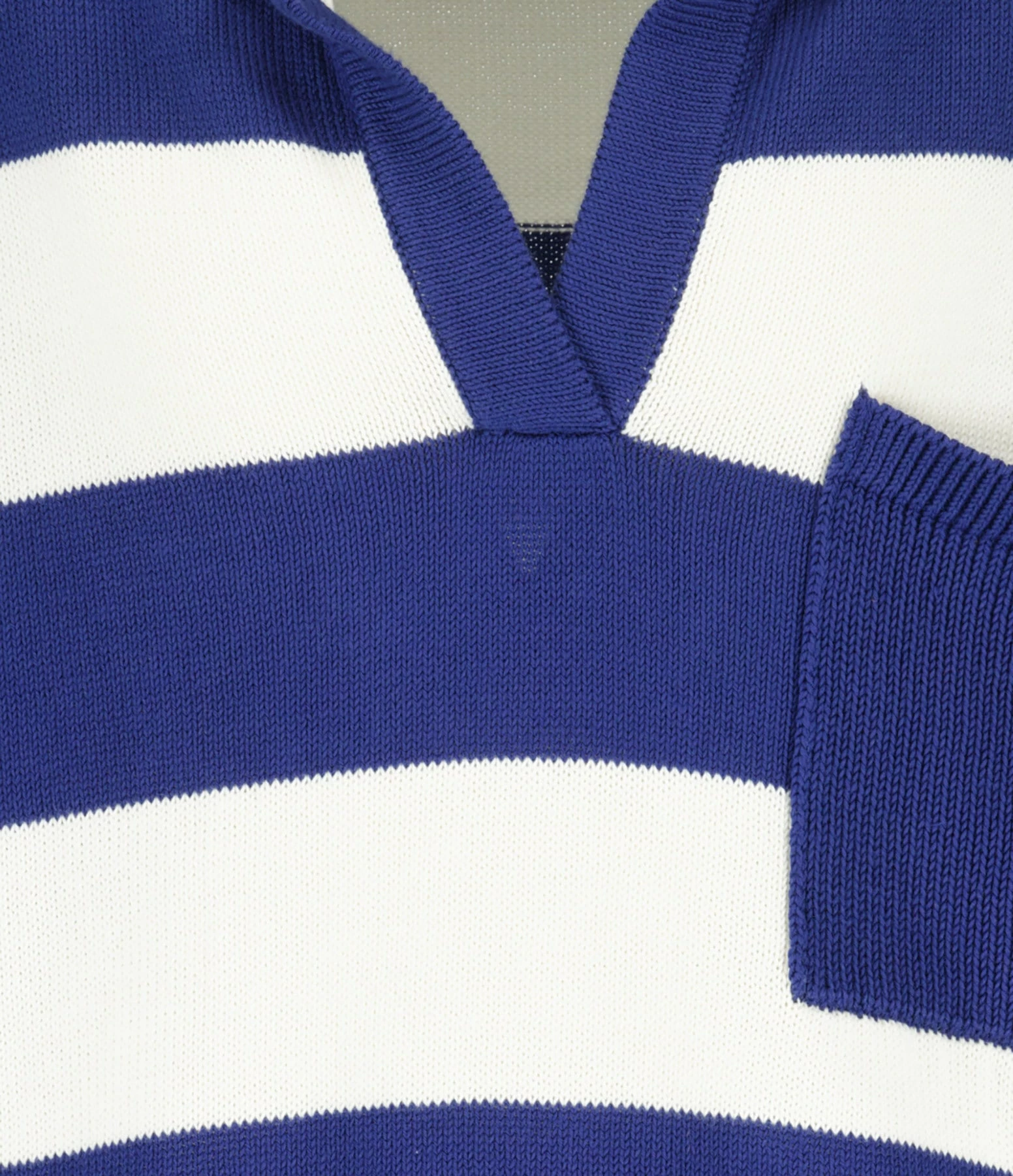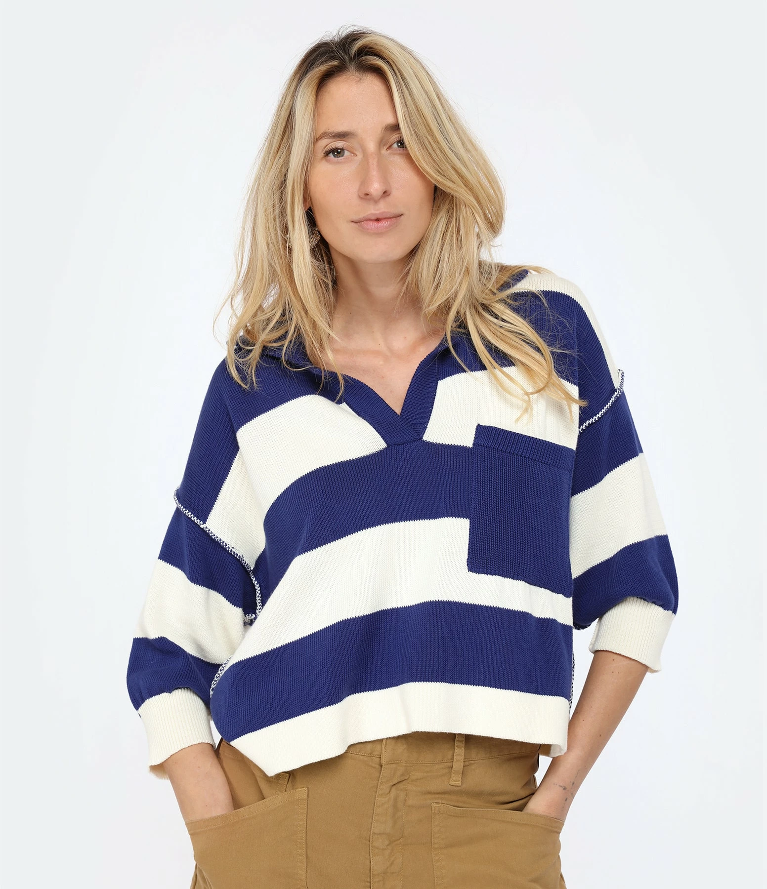 Pull court en coton bleu marine et écru à rayures. Col polo. Manches trois-quarts. Une poche plaquée poitrine. Coupe droite. Base droite.