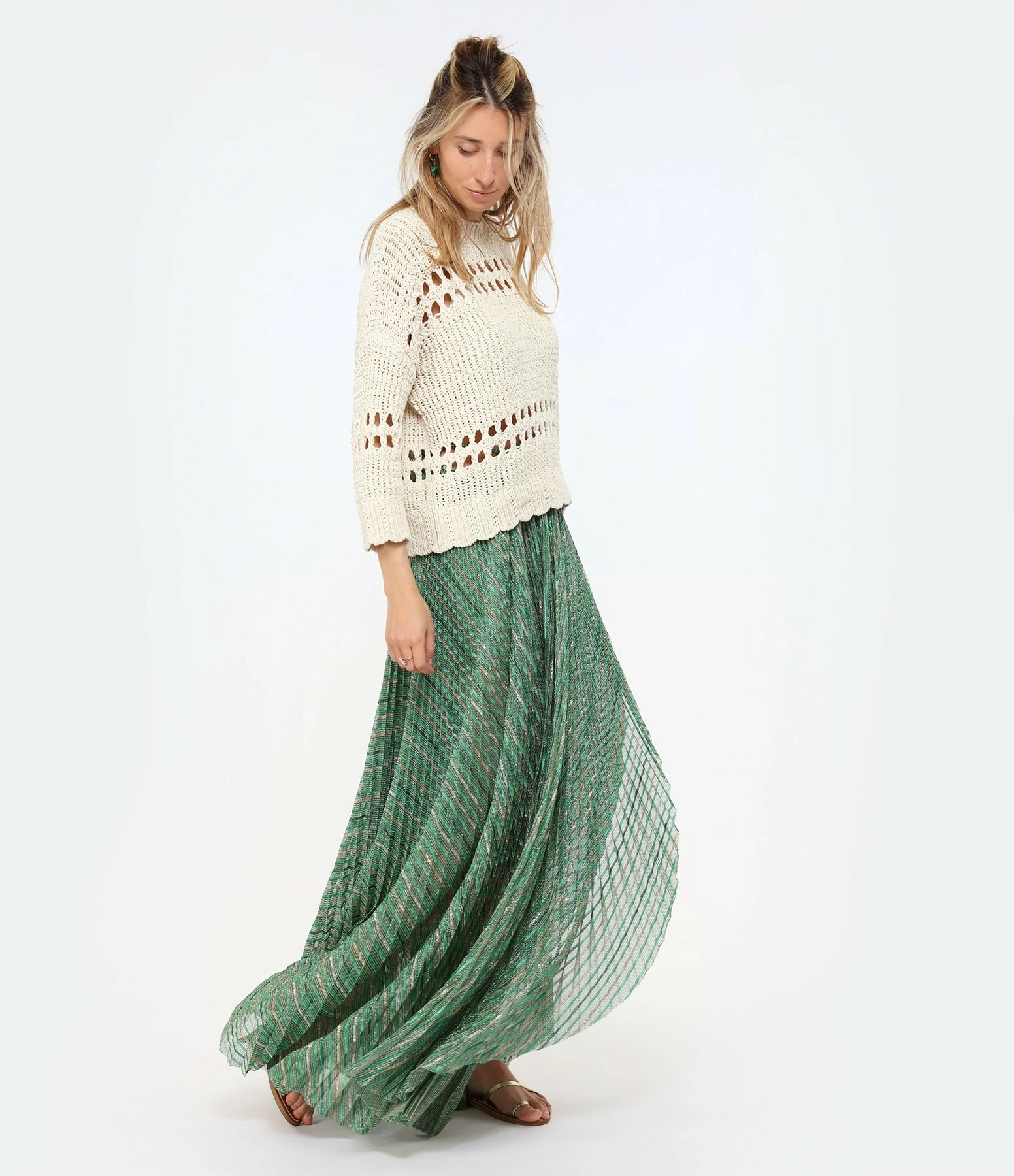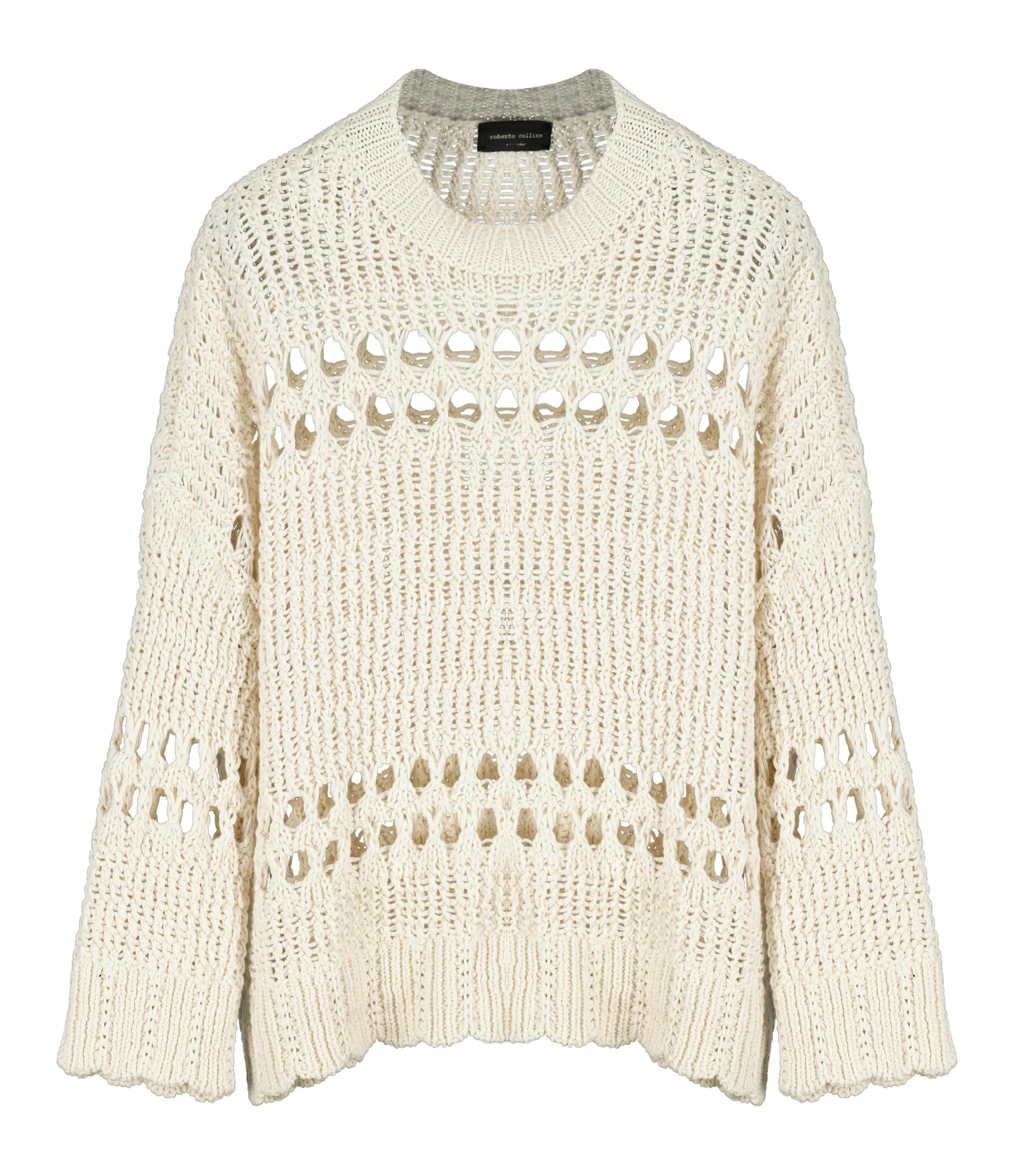 Pull en crochet écru. Manches trois-quarts. Ajouré à certains endroits. Col rond. Coupe droite. Base droite.