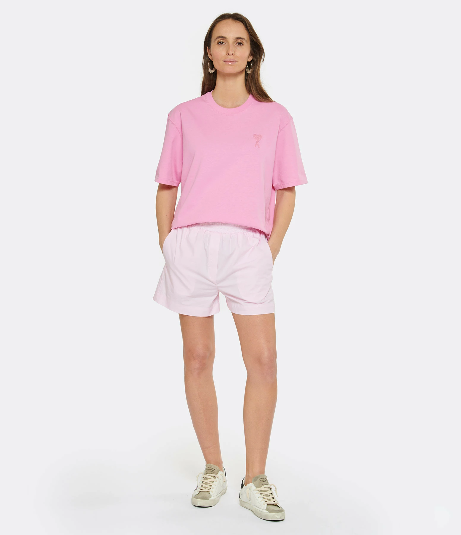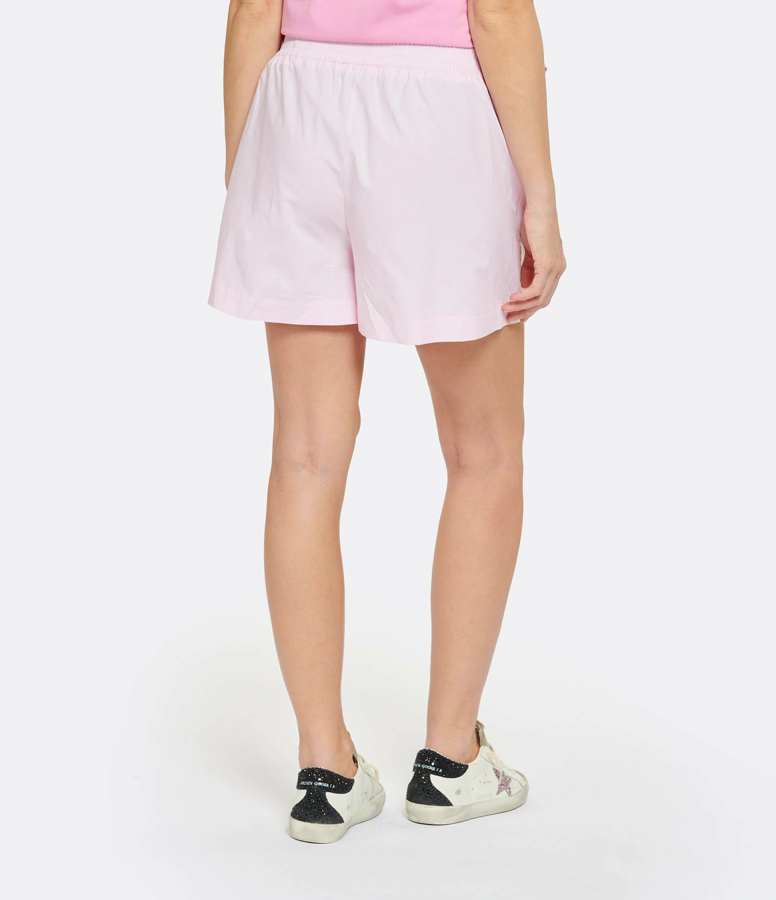 Short en coton rose. Taille élastiquée. Deux poches à l’avant.