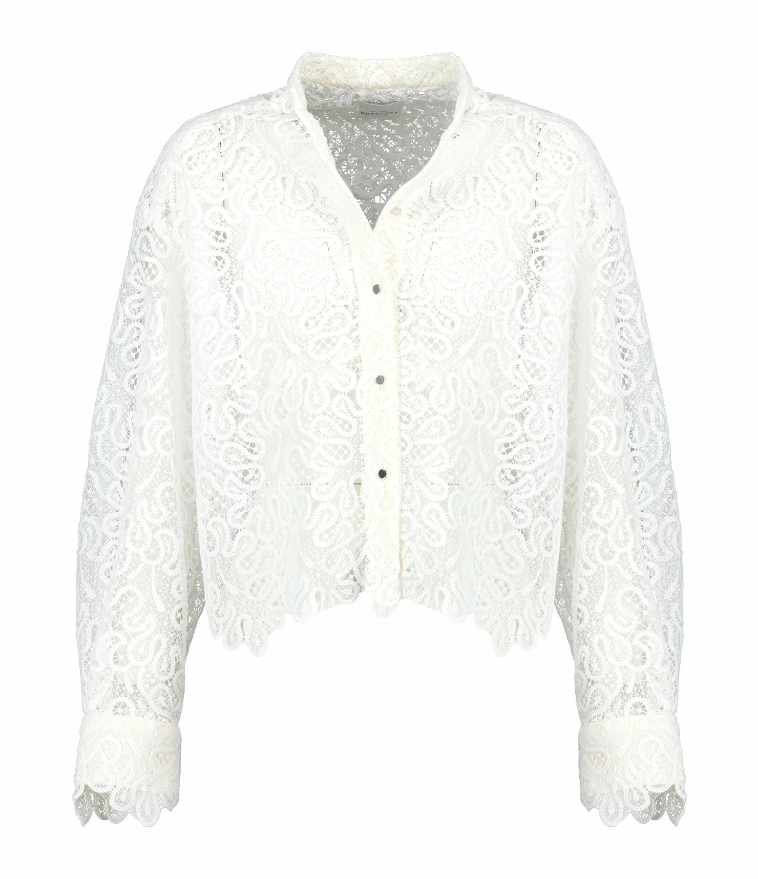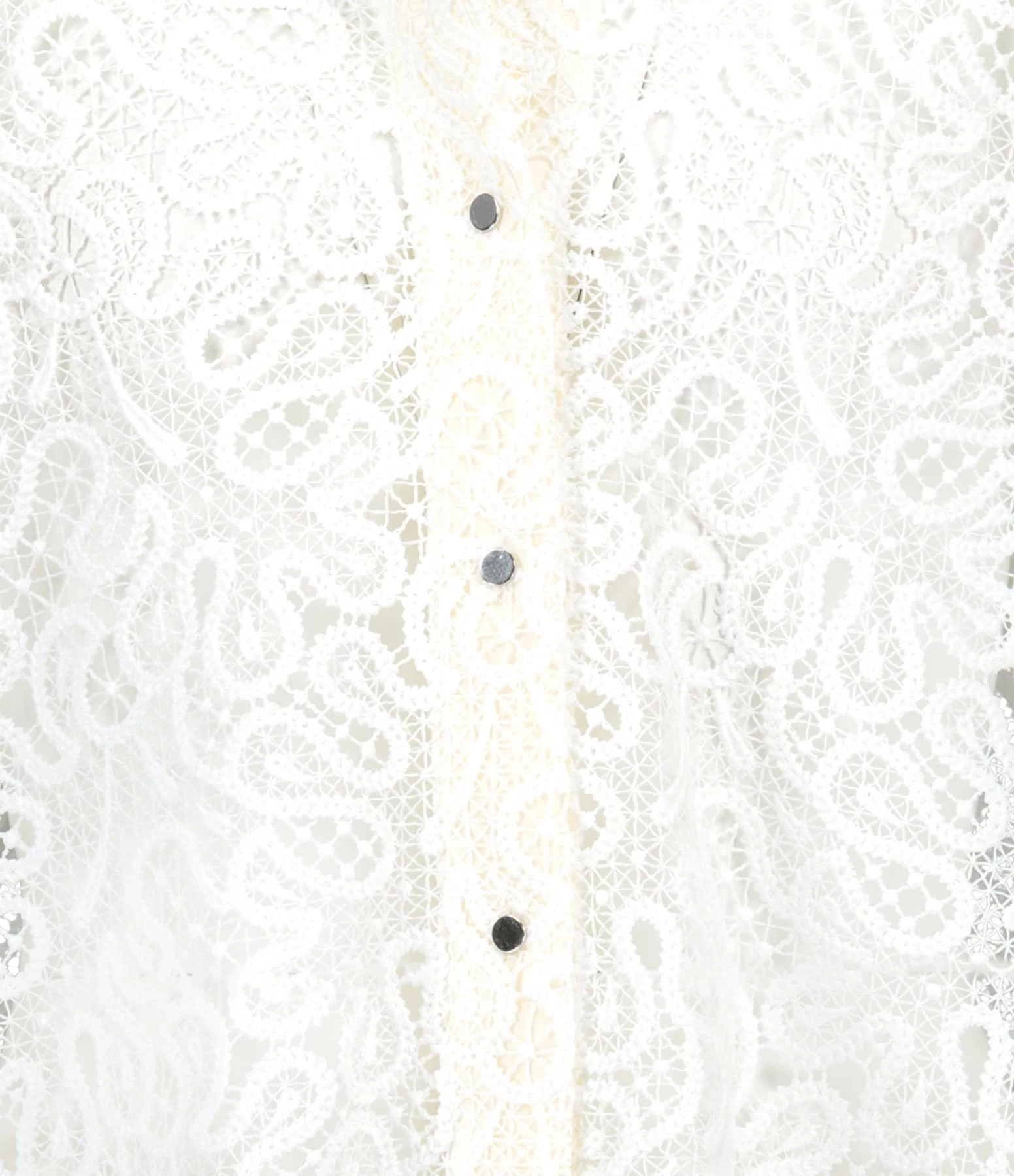 Chemise en dentelle blanche. Ajourée. Col rond. Fermeture par boutons argentés sur le devant. Manches longues avec poignets resserrés par boutons. Coupe droite. Base dentellée.
