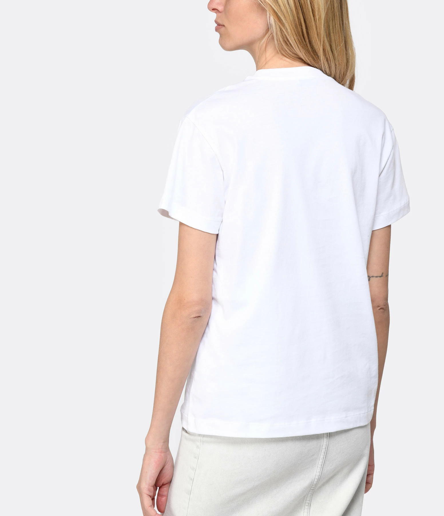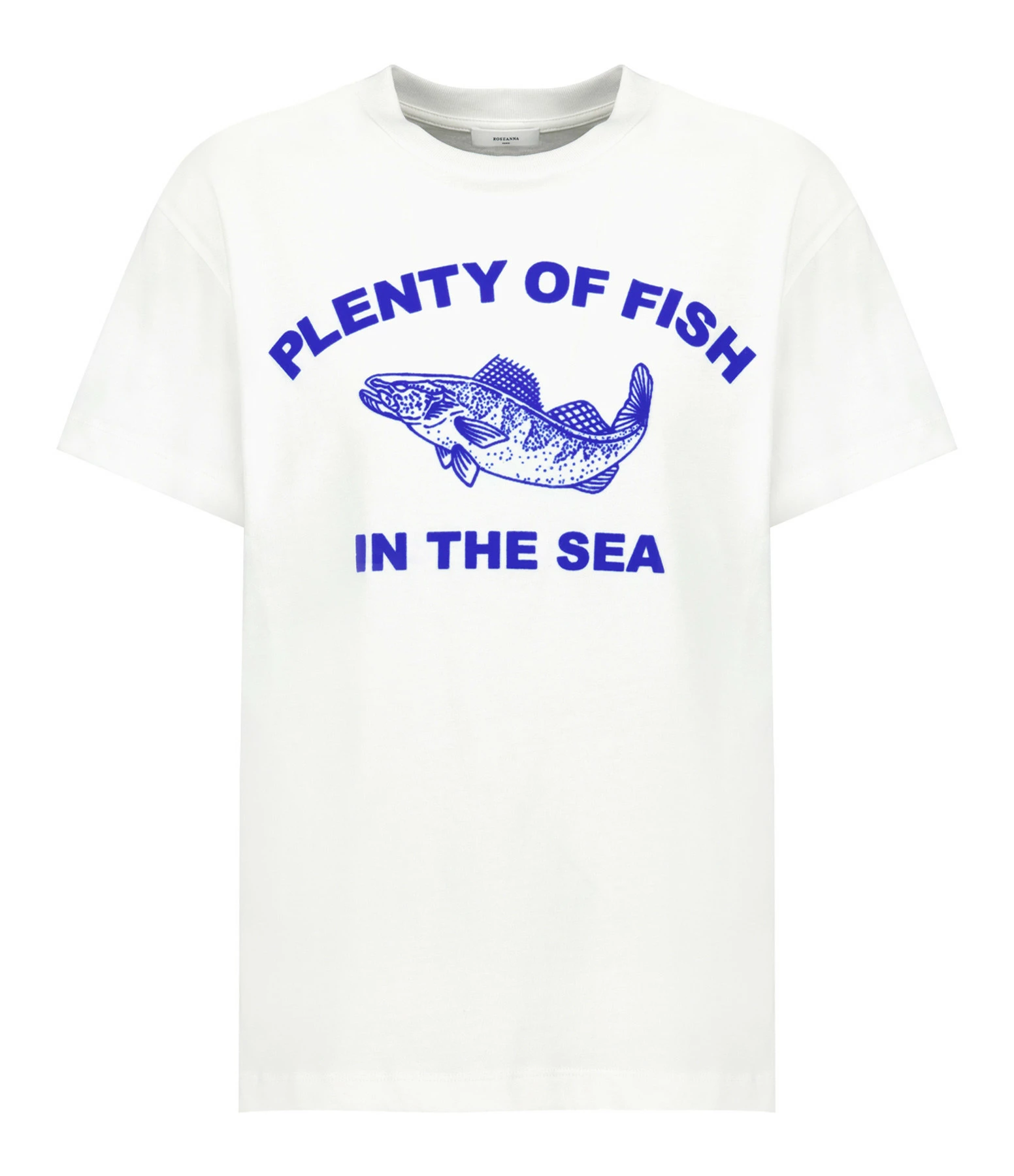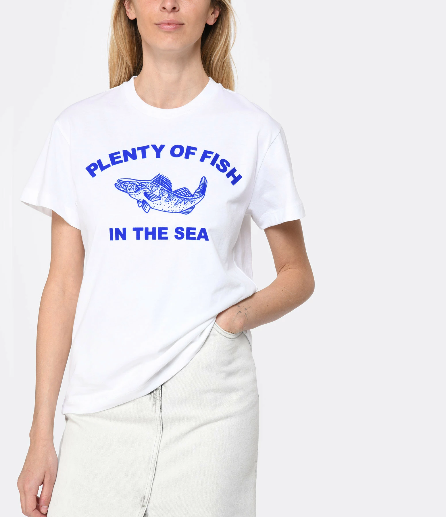 Tee-shirt en coton blanc floqué en velours bleu “PLENTY OF FISH IN THE SEA”. Col rond. Manches courtes. Coupe droite. Base droite.