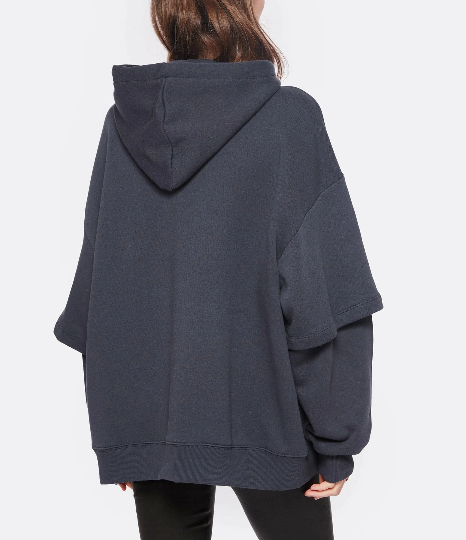 Sweatshirt en coton molletonné bleu nuit avec l’inscription “Rotate Sunday” flockée en blanc sur le devant. Col côtelé à capuche avec cordons de serrage. Manches superposées : une manches courtes sur une manche longue avec poignets côtelés. Coupe oversized. Base droite côtelée. Effet usé par endroits.