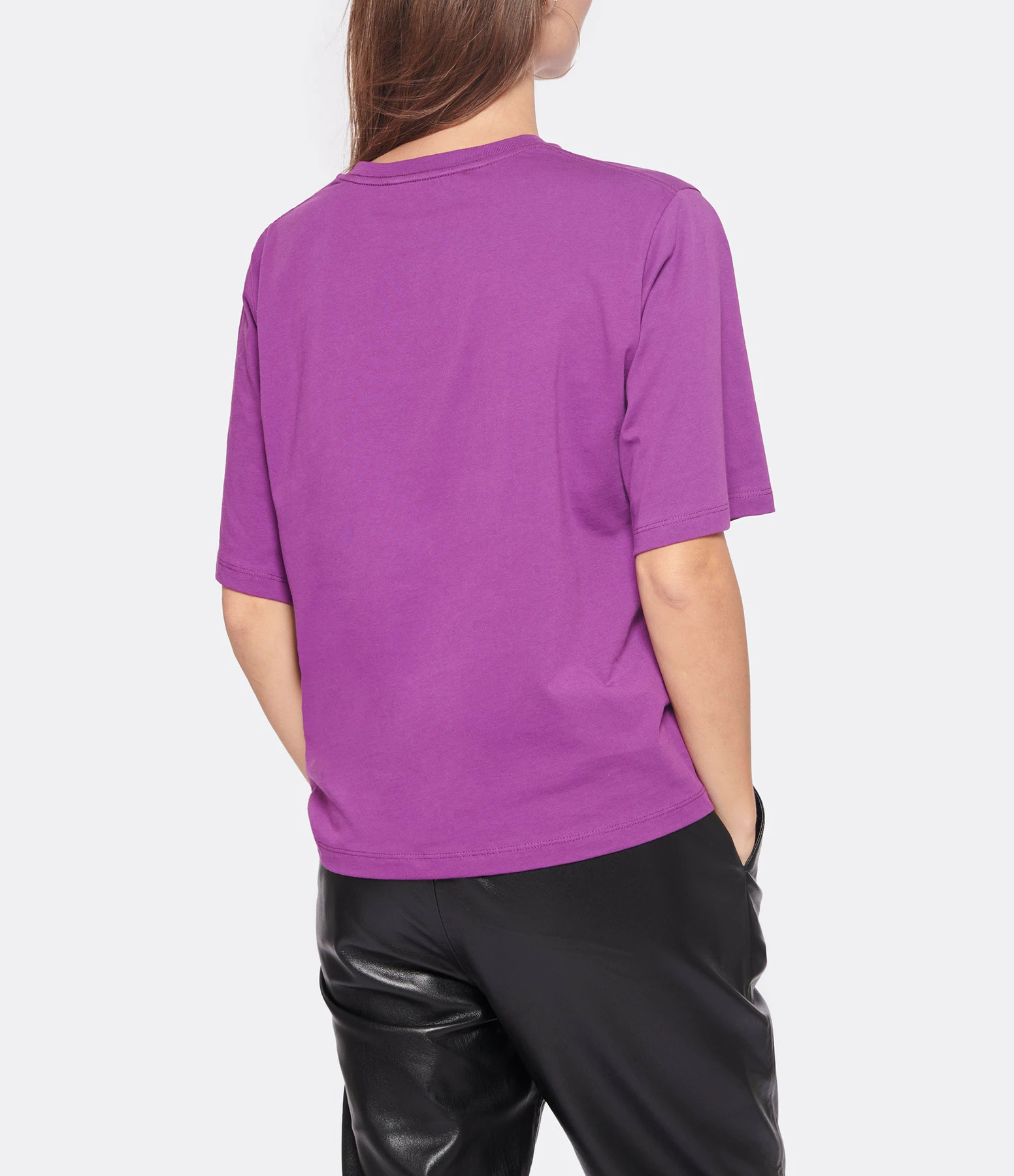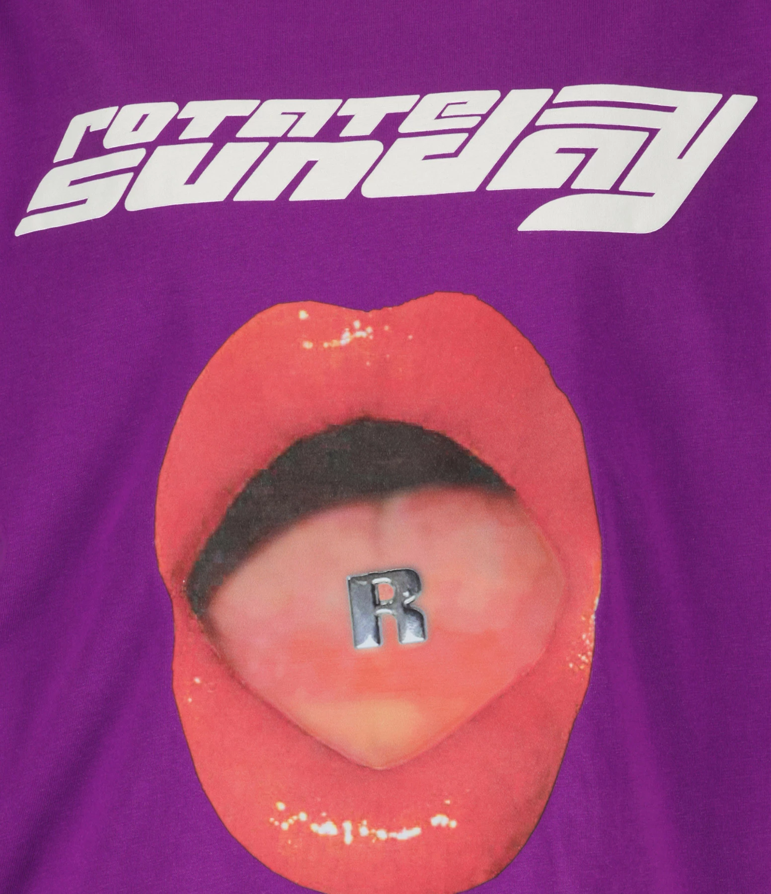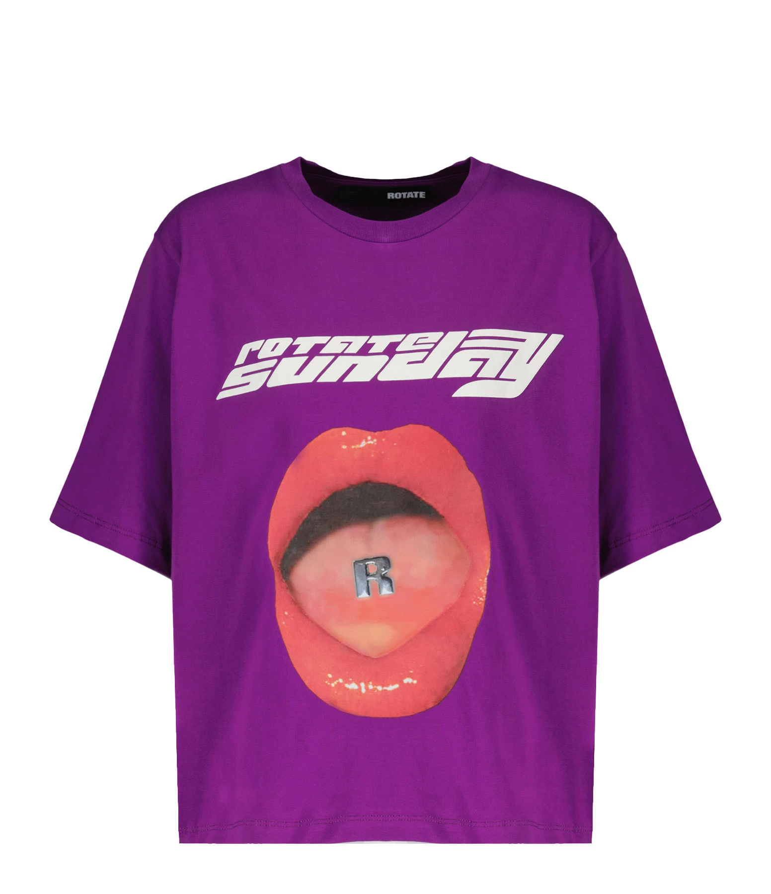 Tee-shirt en coton violet sérigraphié. Col rond. Manches courtes. Inscriptions “Rotate Sunday” en blanc à l’avant. Coupe droite. Base droite. Non doublé.