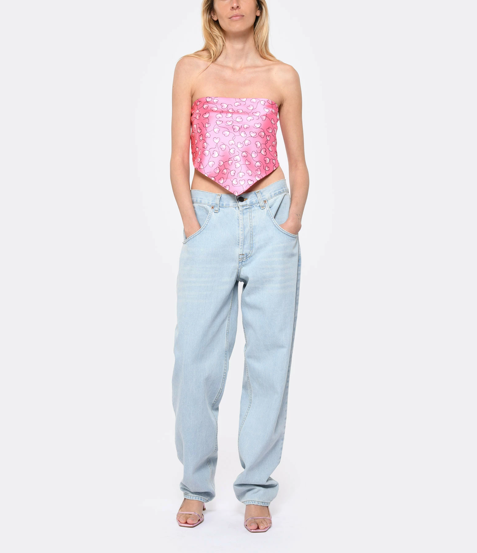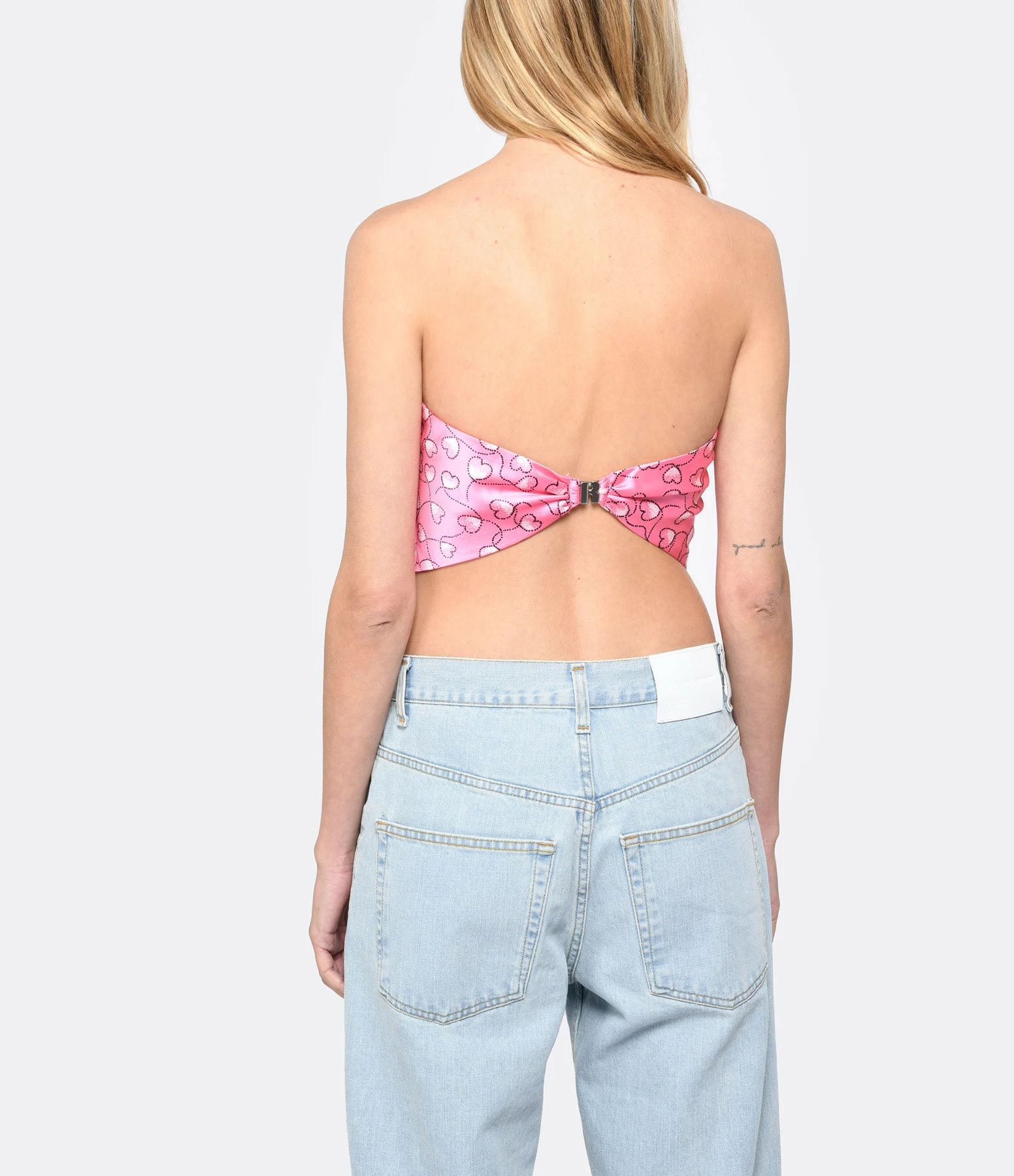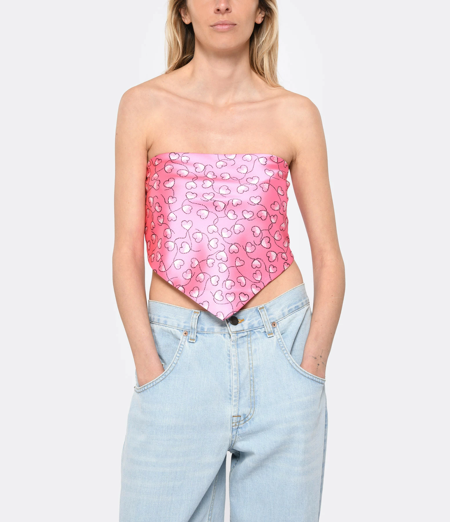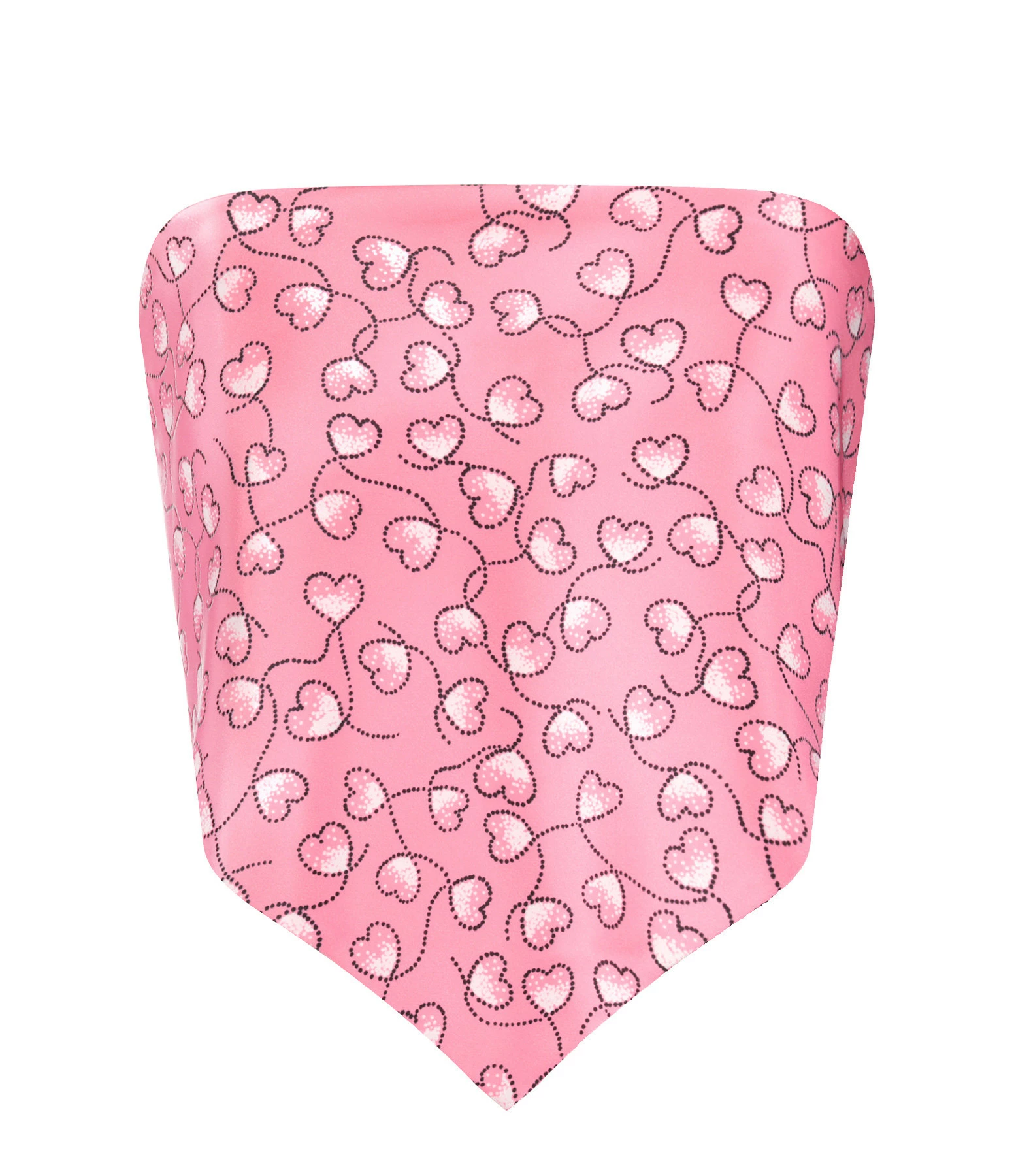 Top bustier satiné à imprimé cœur rose. Sans manches. Fermeture par agrafe à l’arrière en forme de “R” métallique.