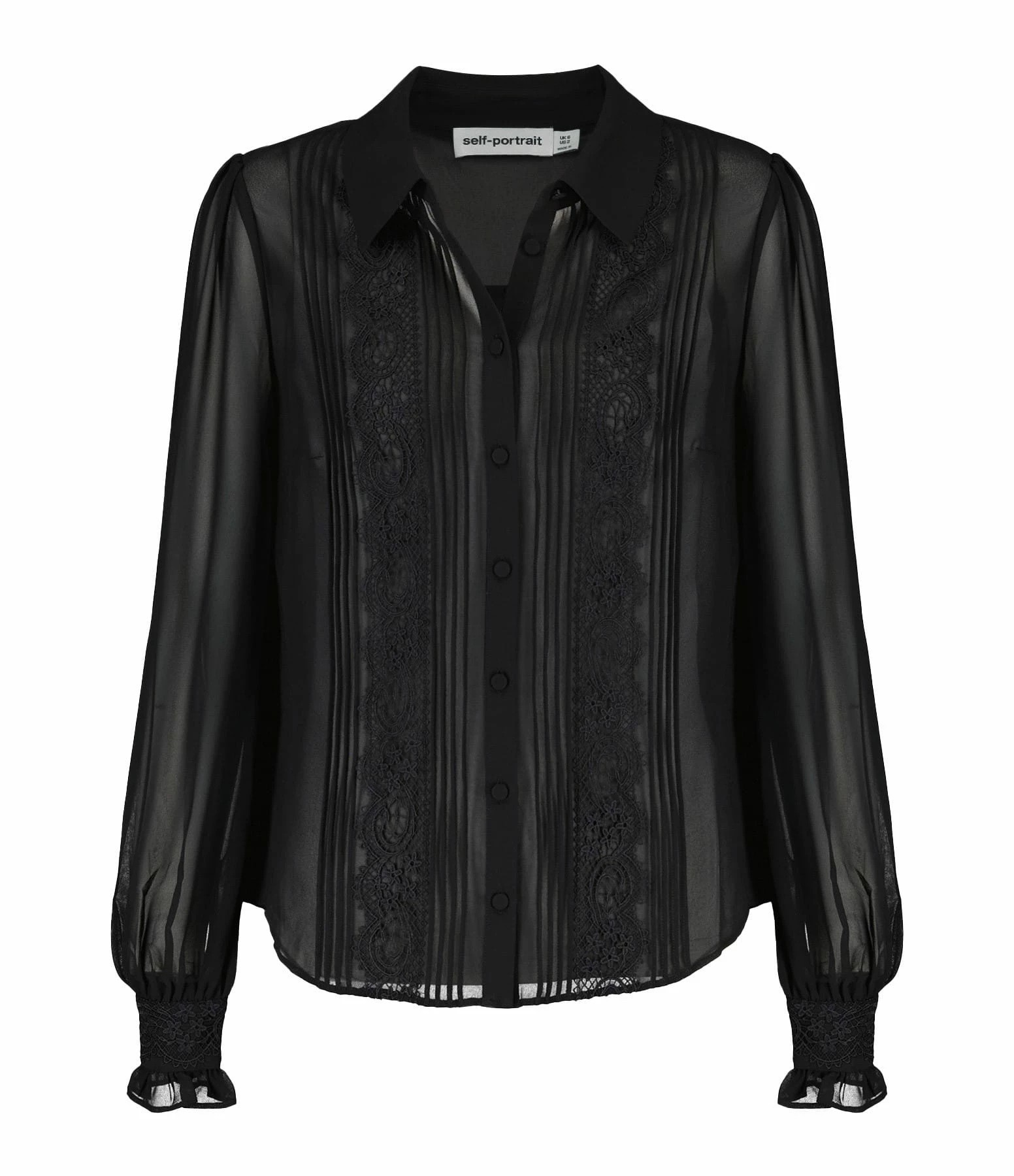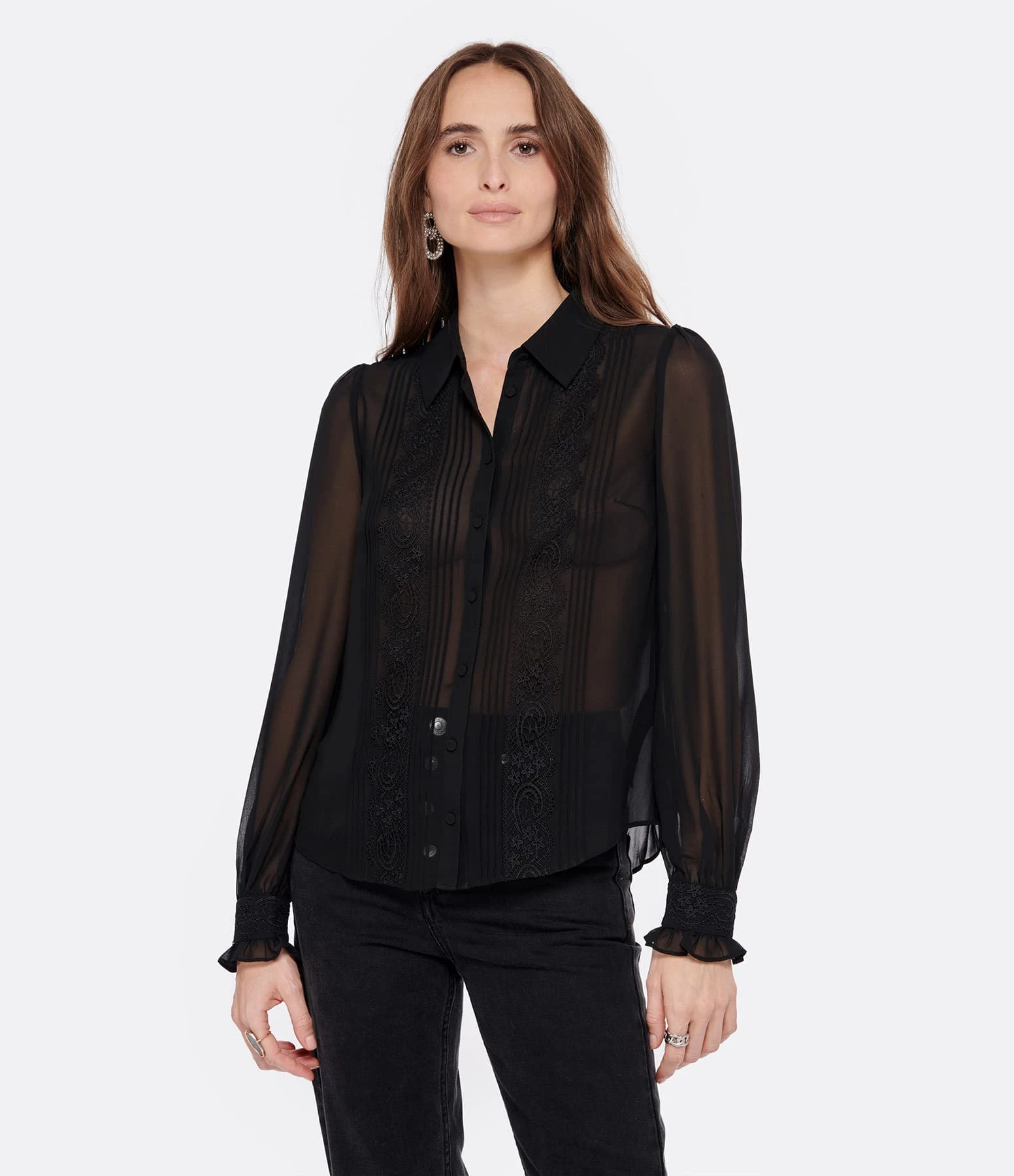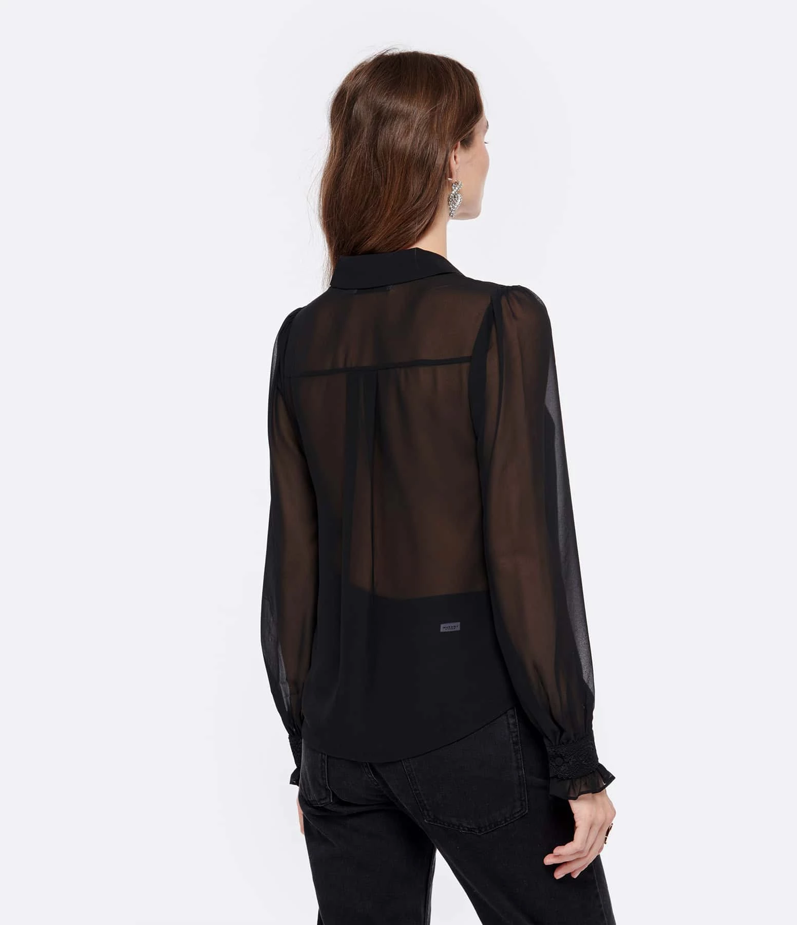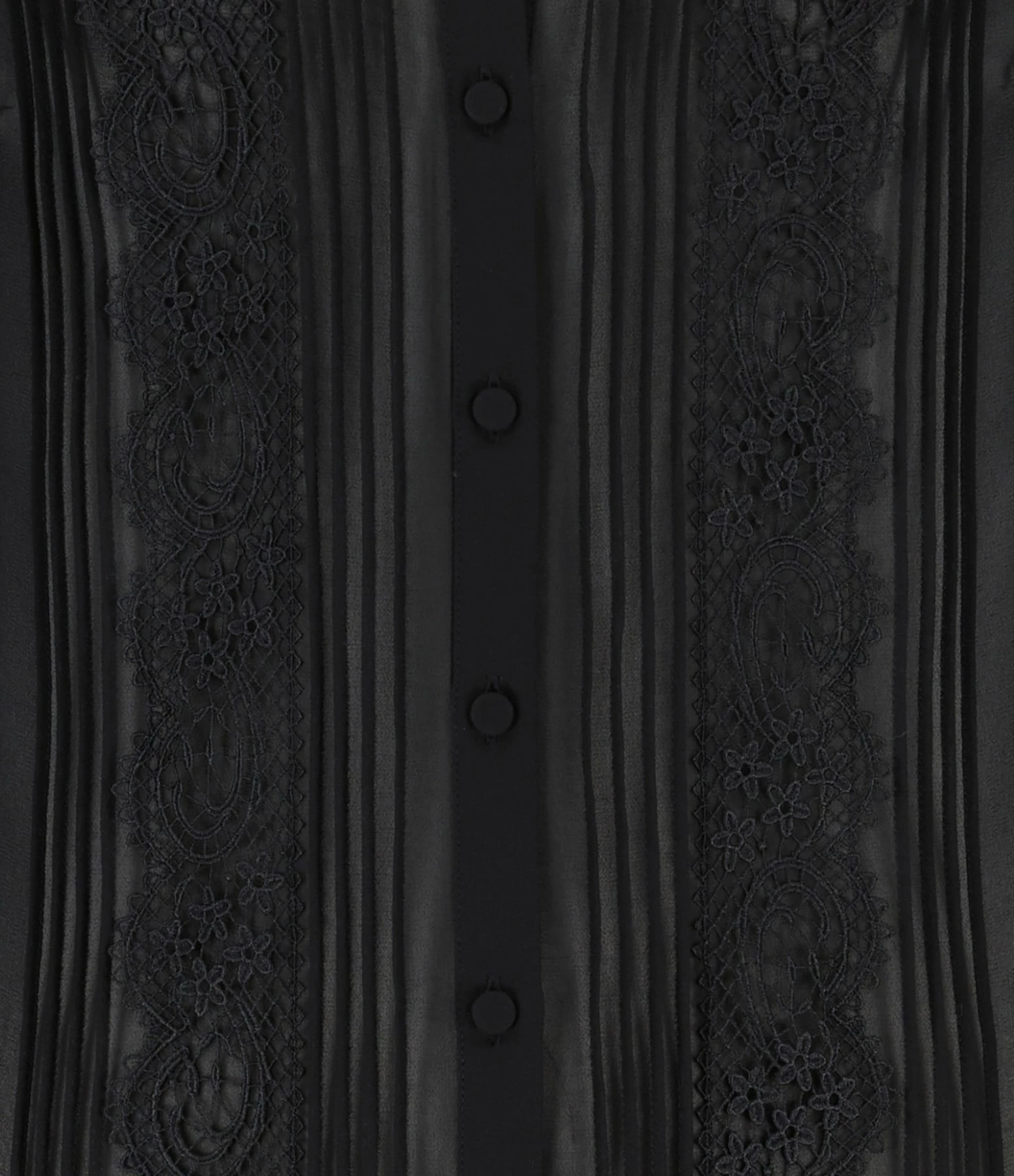 Blouse noire ornée de dentelle. Manches longues avec fentes et poignets boutonnés avec dentelle. Effet de transparence. Base droite. Coupe droite. Col chemisier. Fermeture à boutons noirs sur l’avant.