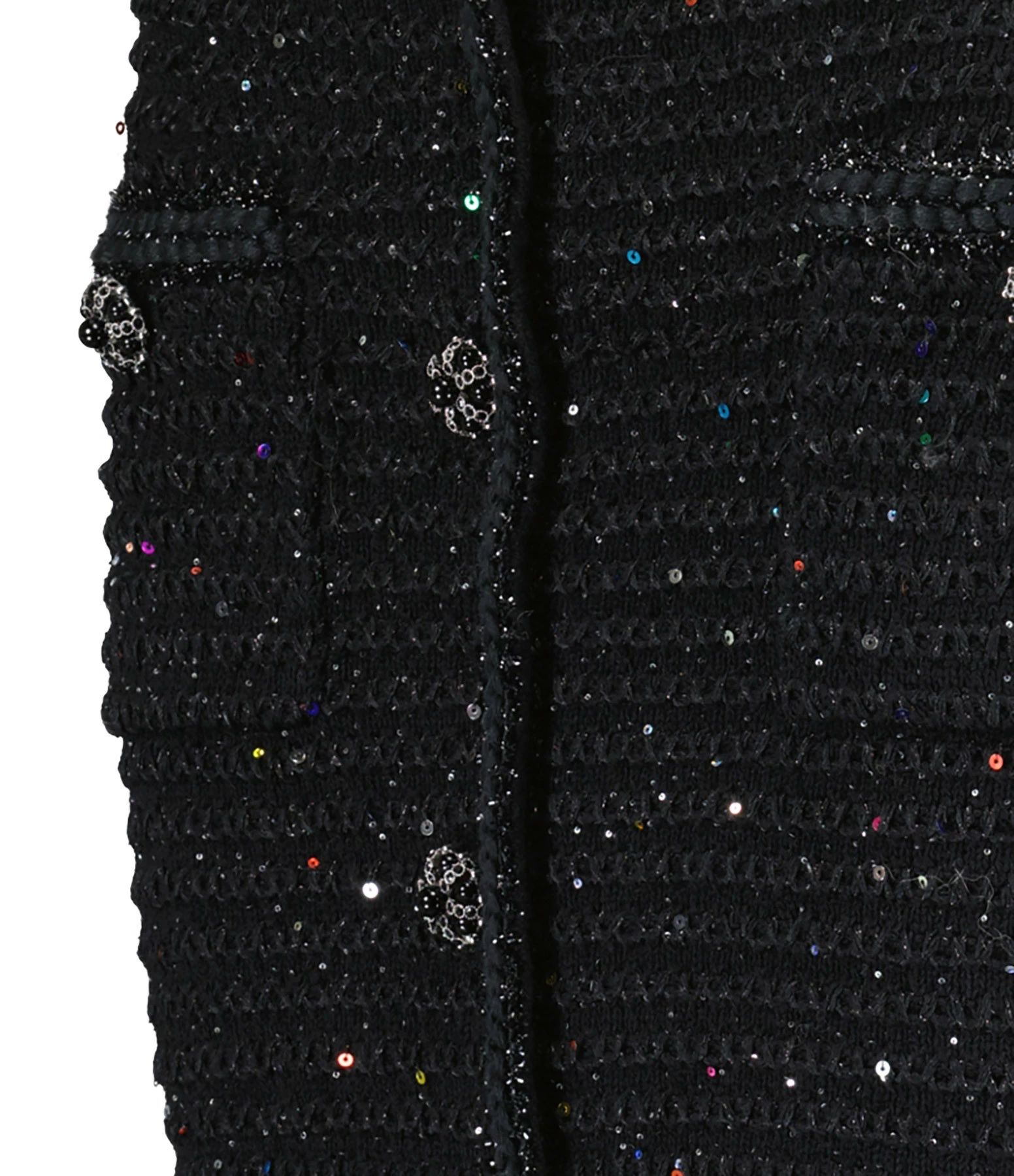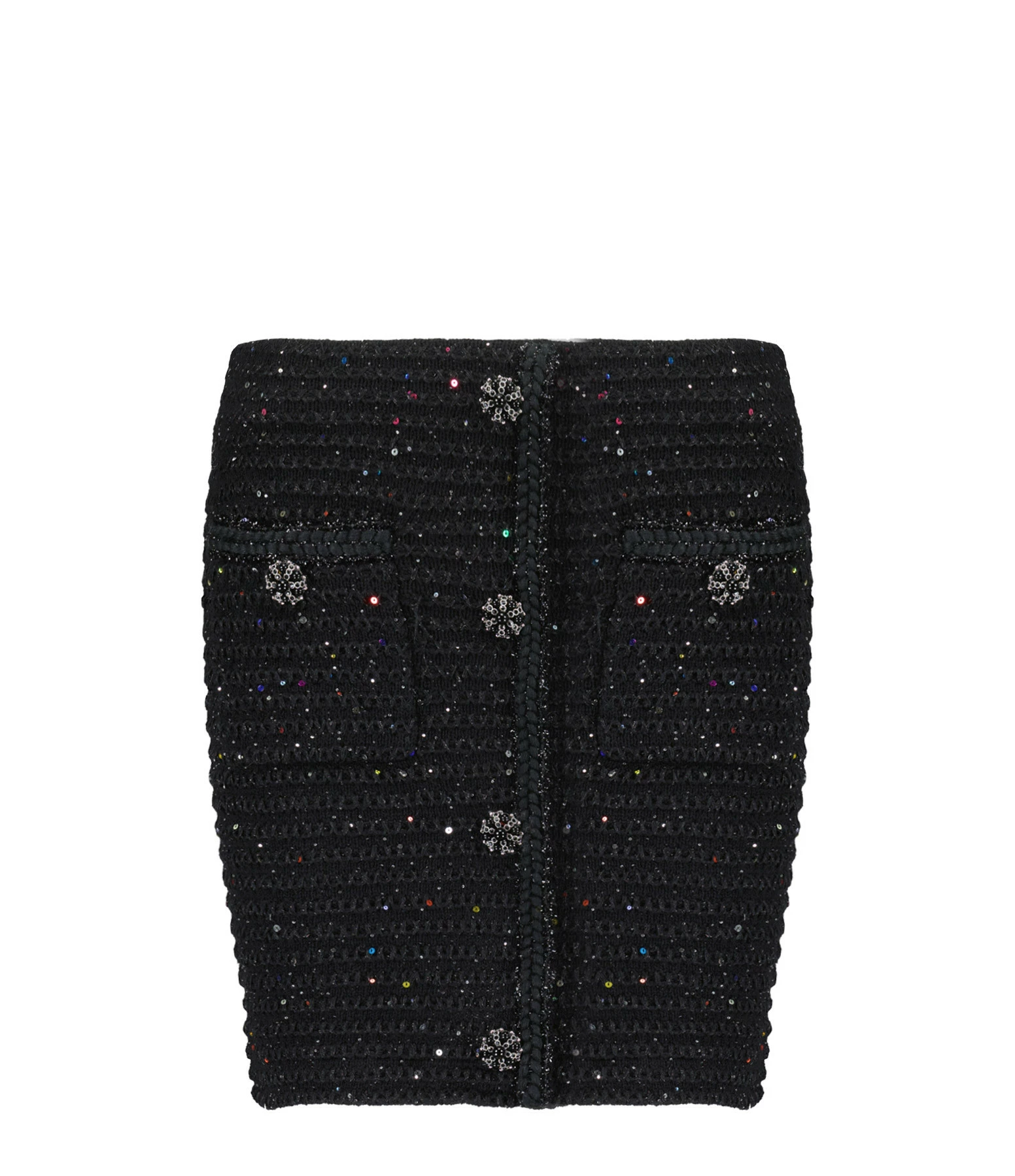 Jupe courte en maille noire et sequins multicolores. Deux poches avant fermés par boutons pressions. Taille élastiquée. Boutons décoratifs noirs et argentés.