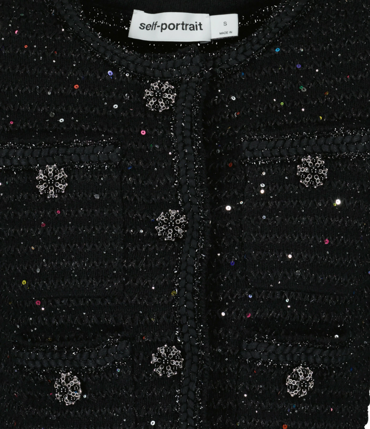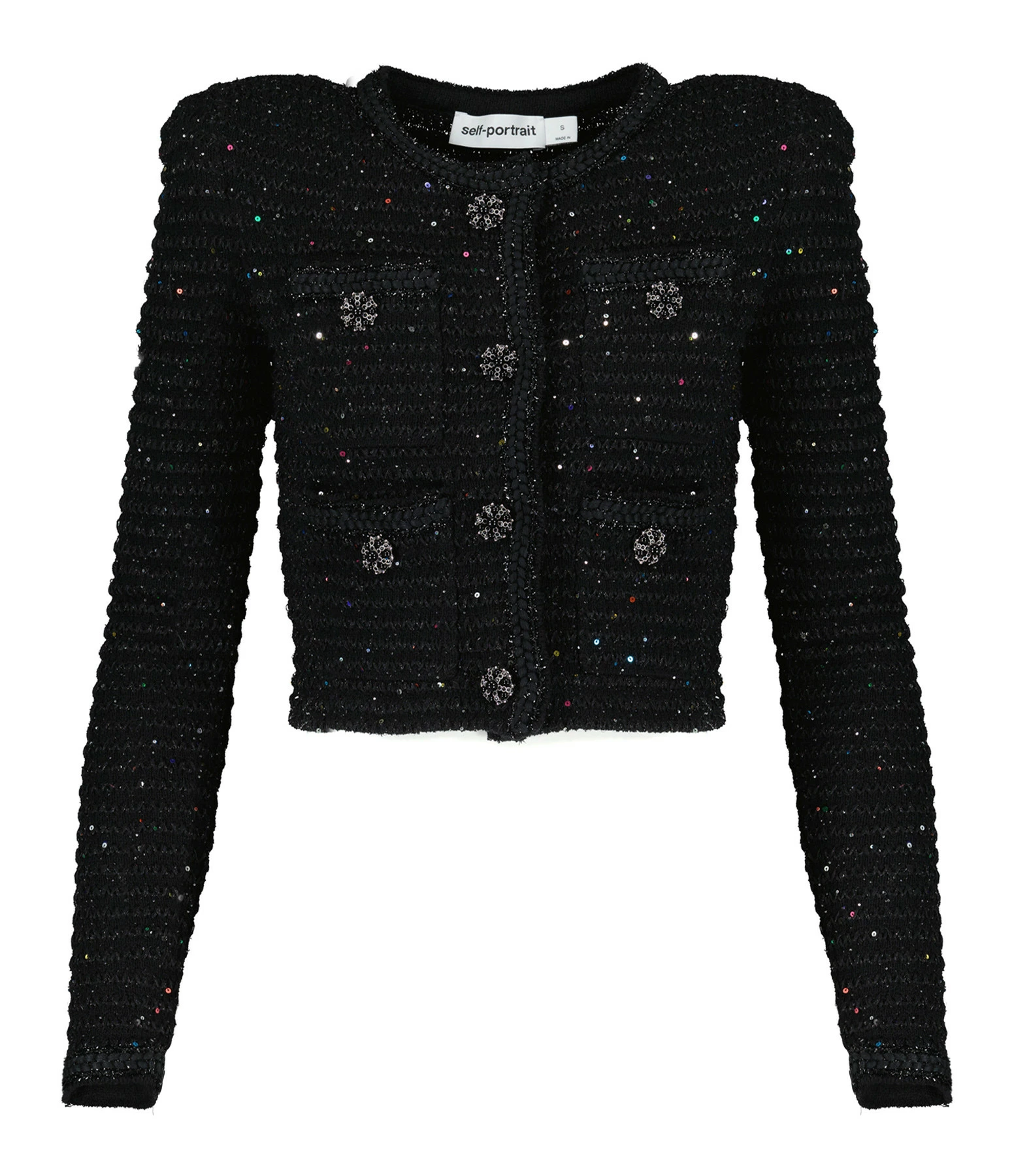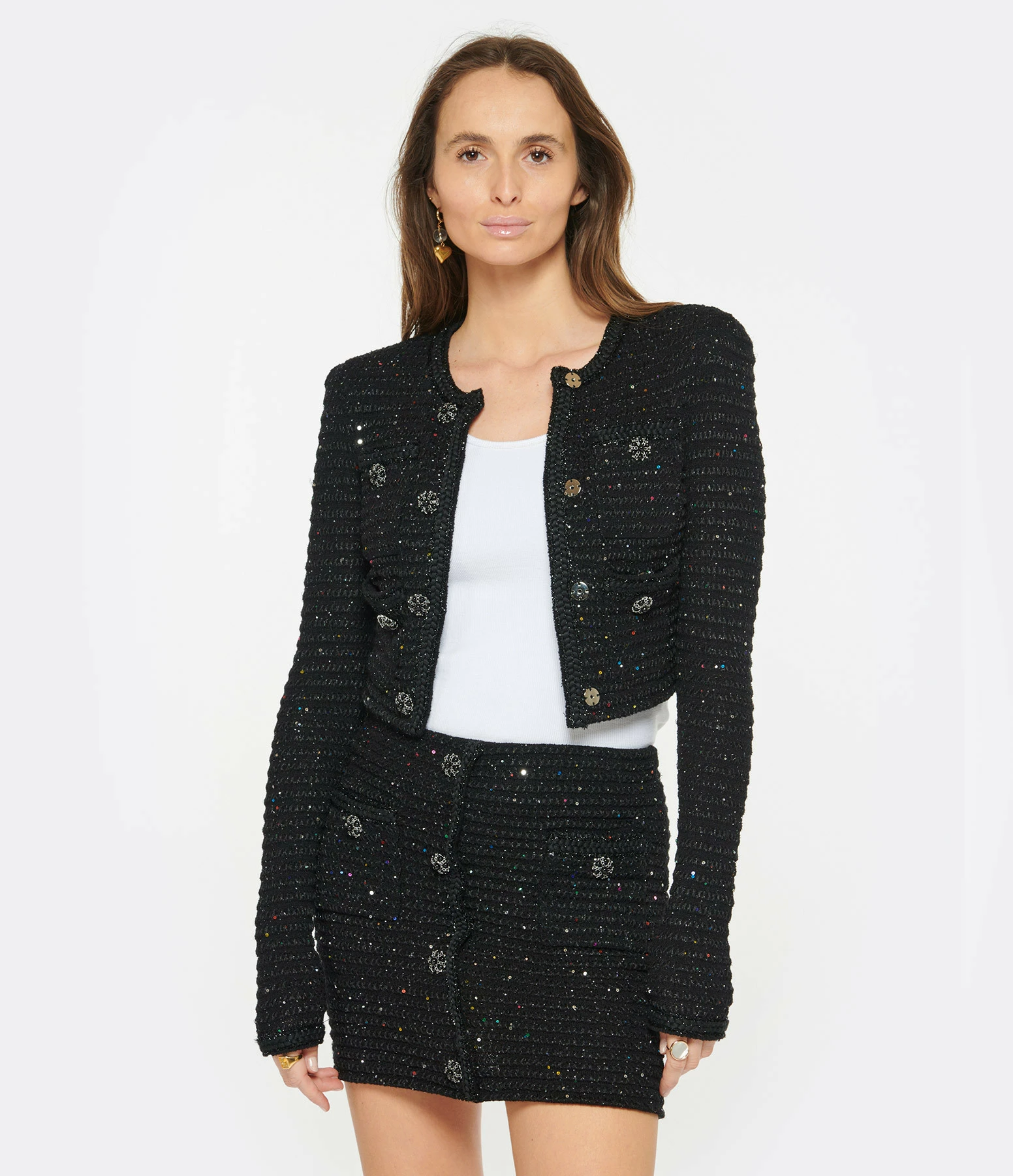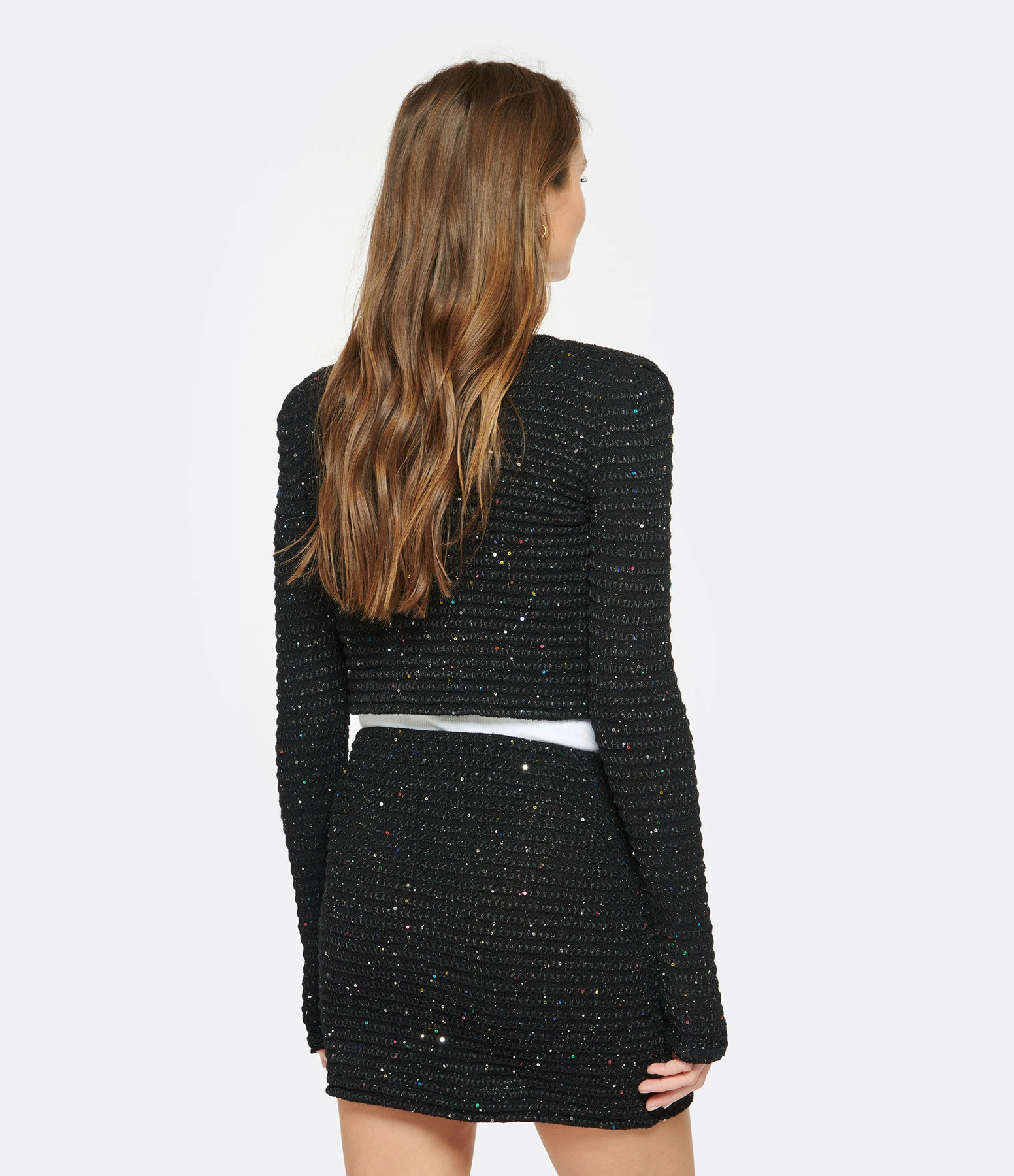 Veste courte en maille noire et sequins multicolores. Col rond. Fermeture par boutons pressions. Deux poches avant fermées par boutons pressions. Boutons décoratifs noirs et argentés. Coupe droite. Base droite. Non doublée.