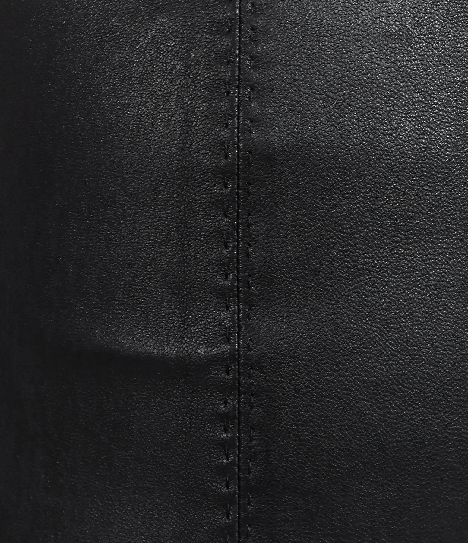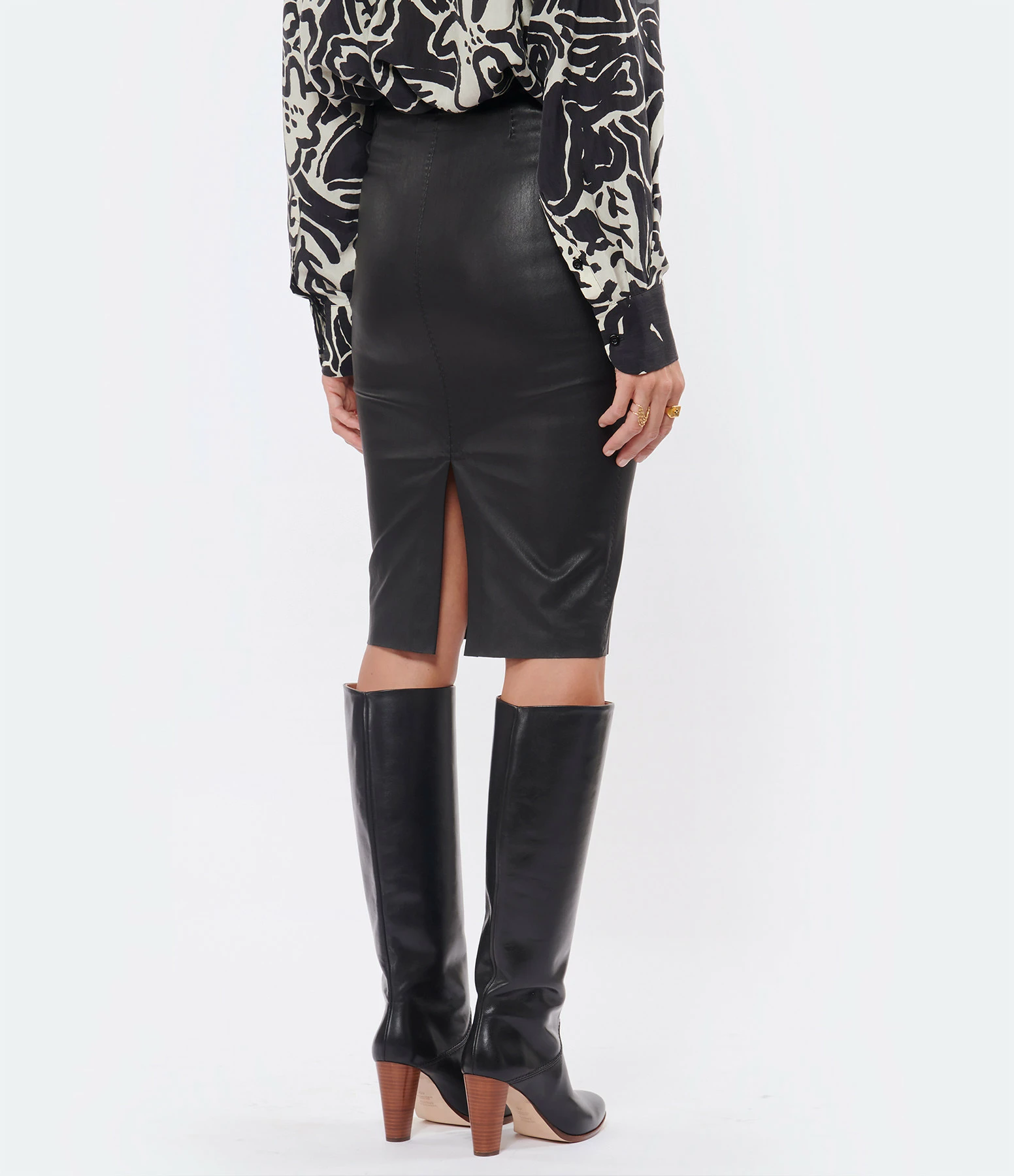 Jupe crayon stretch en cuir noir. Taille mi-haute et élastiquée. Base droite fendue à l’arrière. Non doublée.