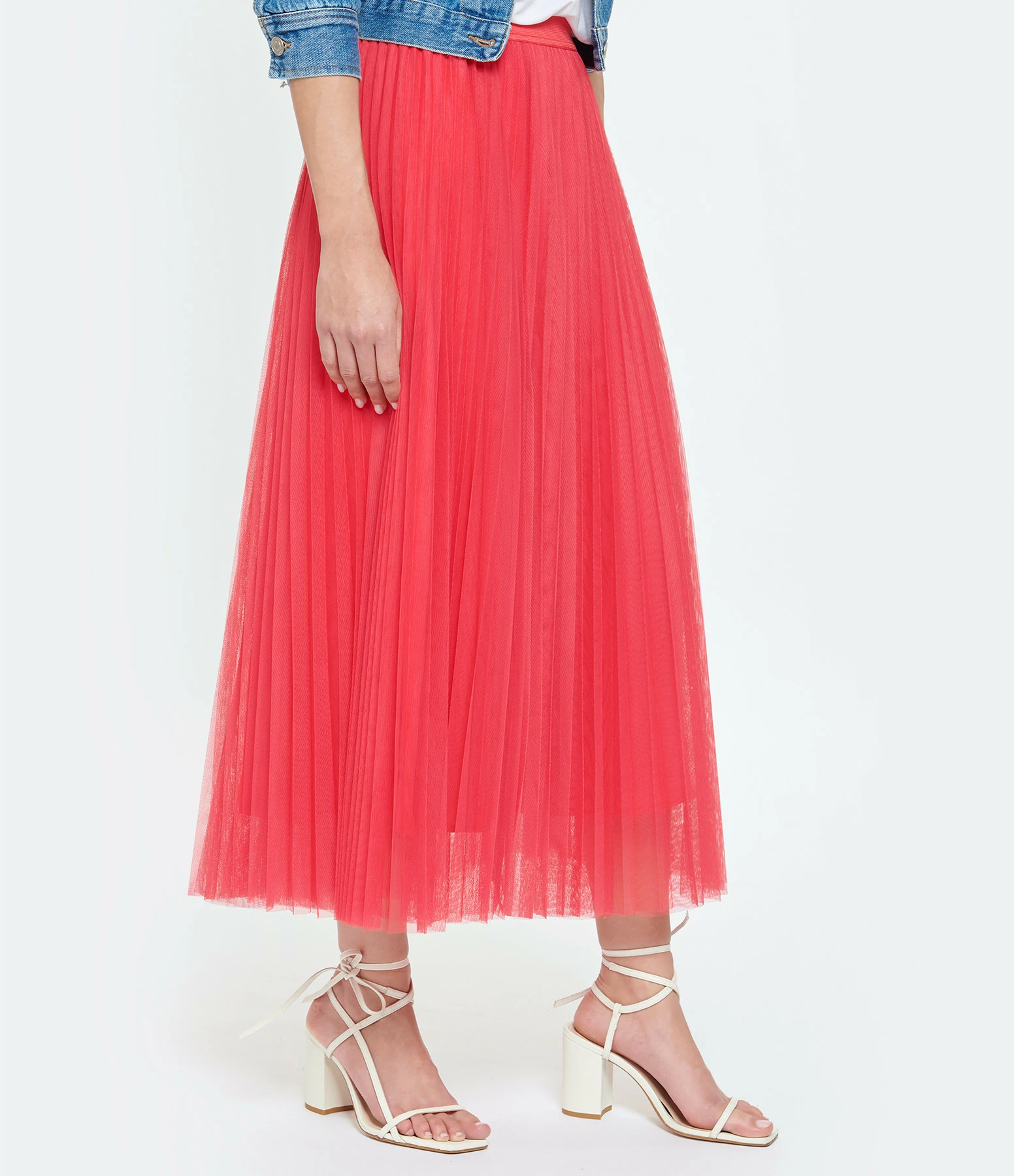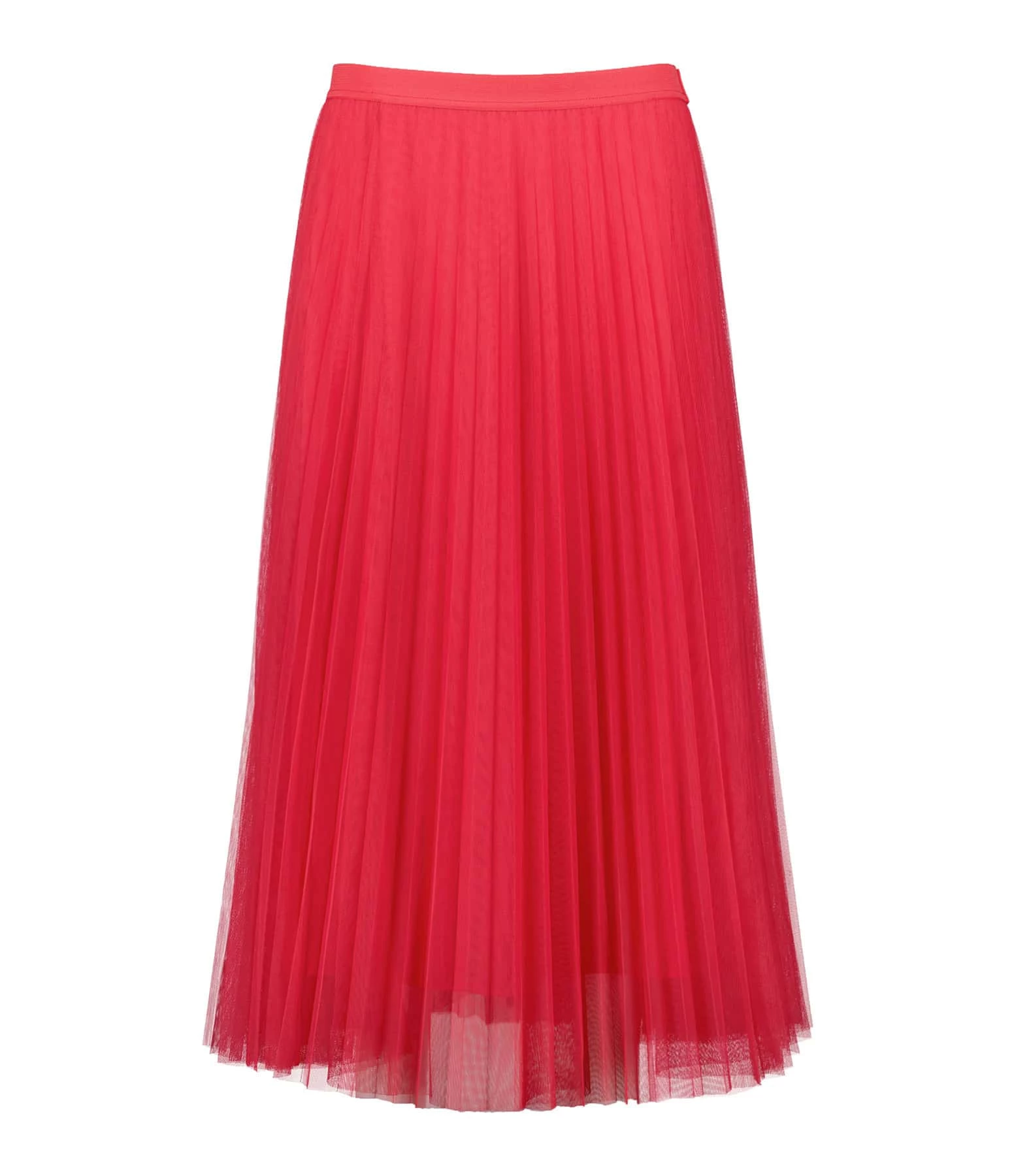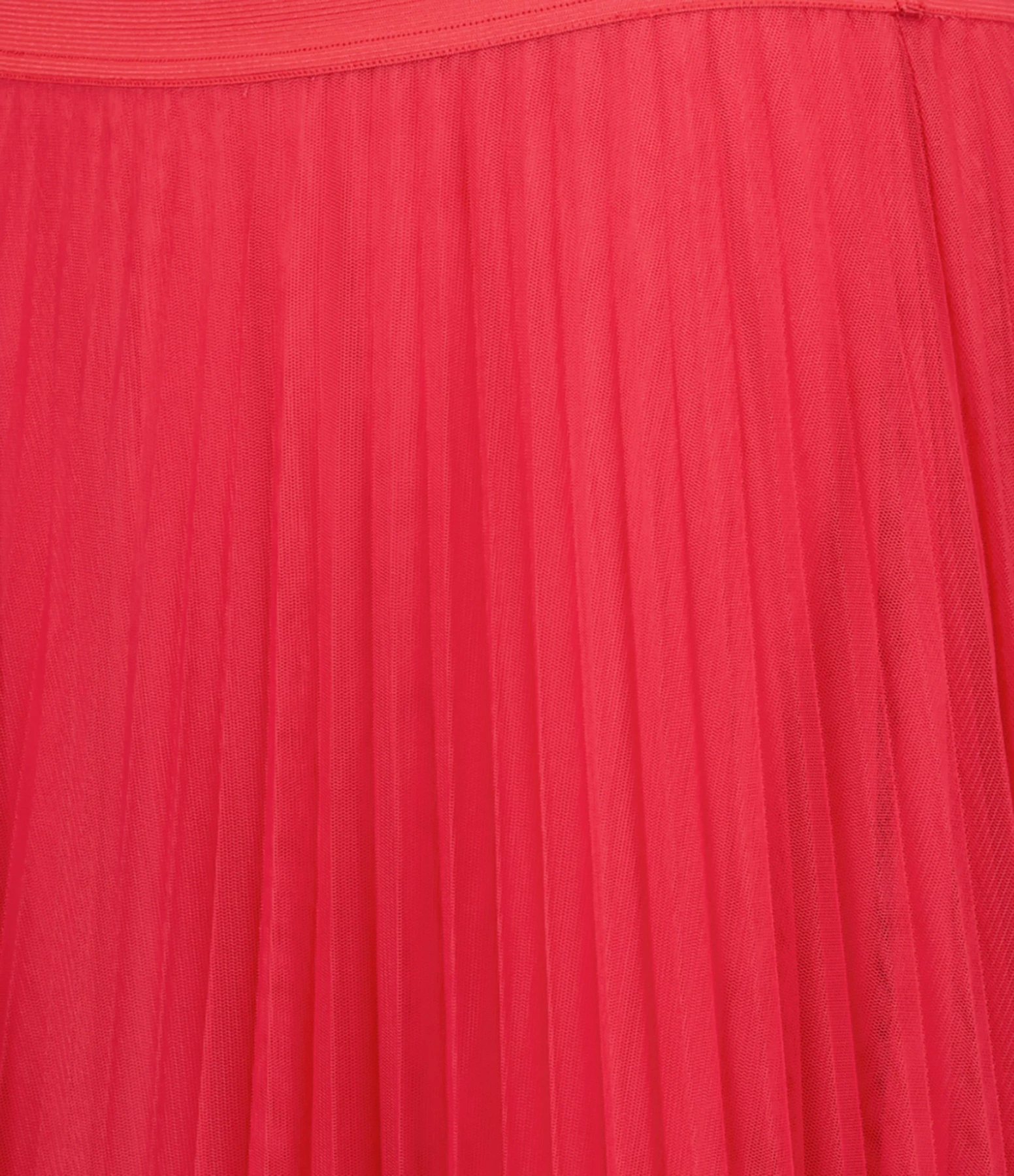 Jupe longue plissée en tulle rose. Élastique à la taille. Coupe évasée. Doublée.