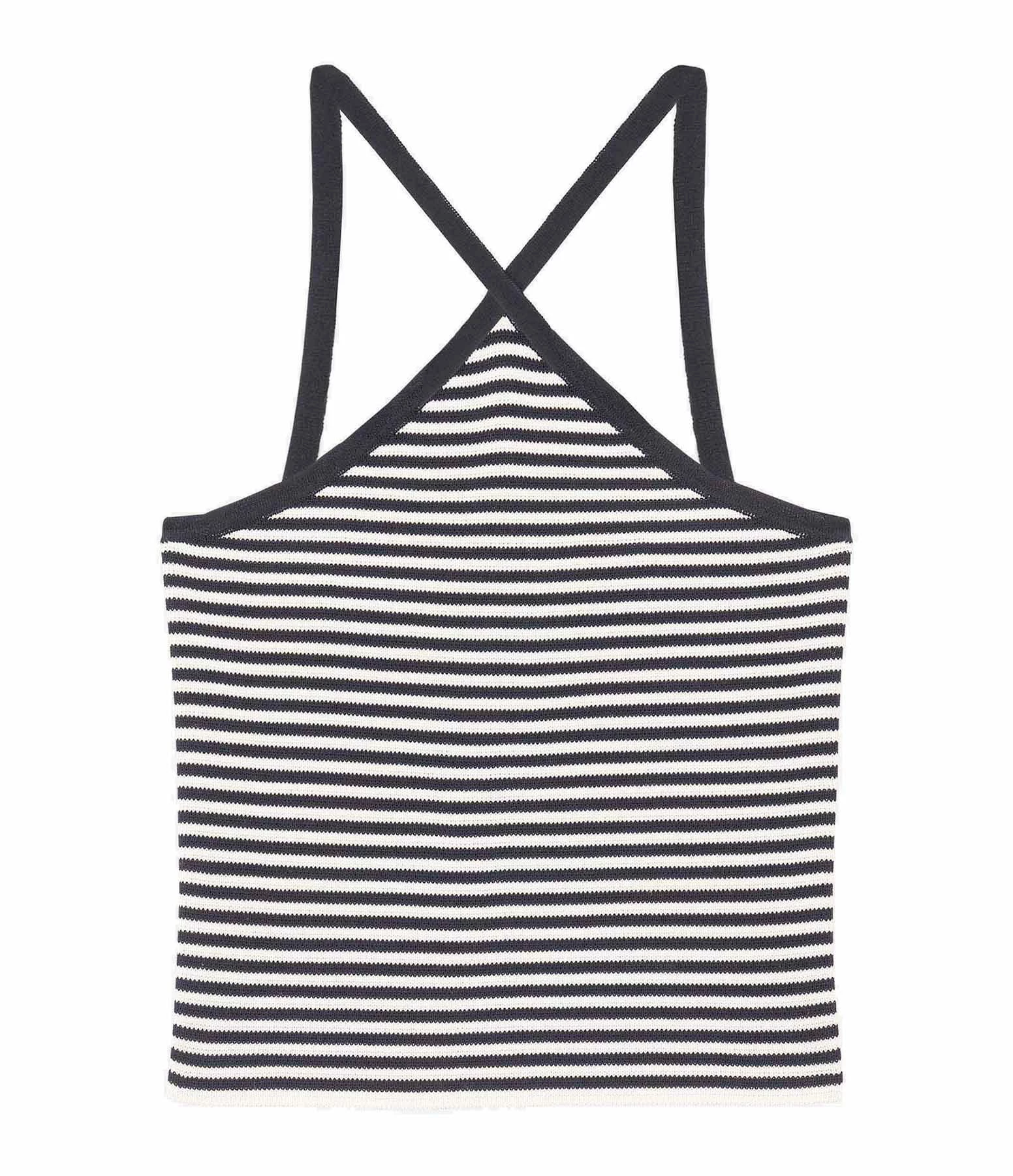 Top en maille noir et blanc à rayures. Encolure par bretelles croisées à l’avant. Coupe droite. Base droite.