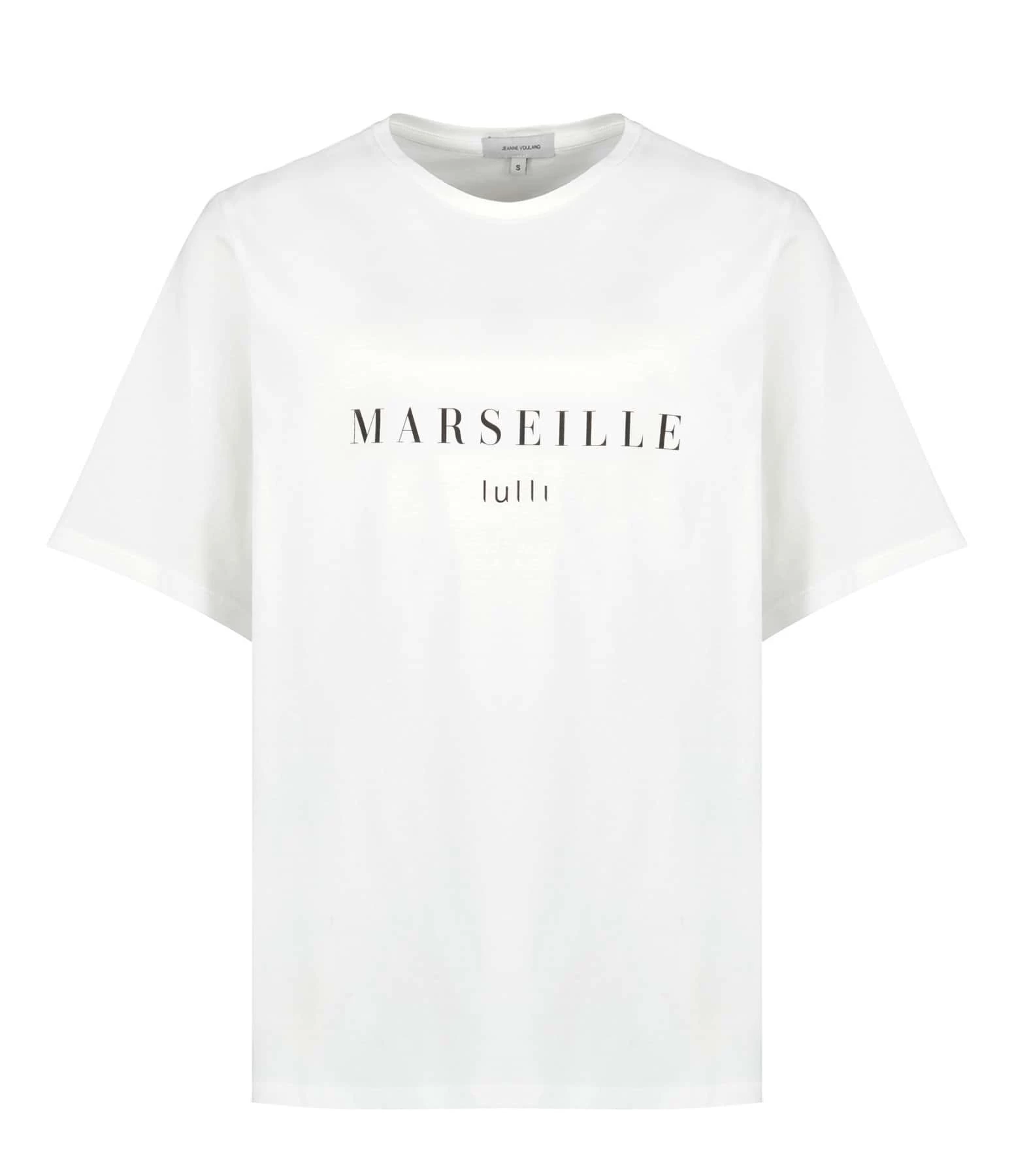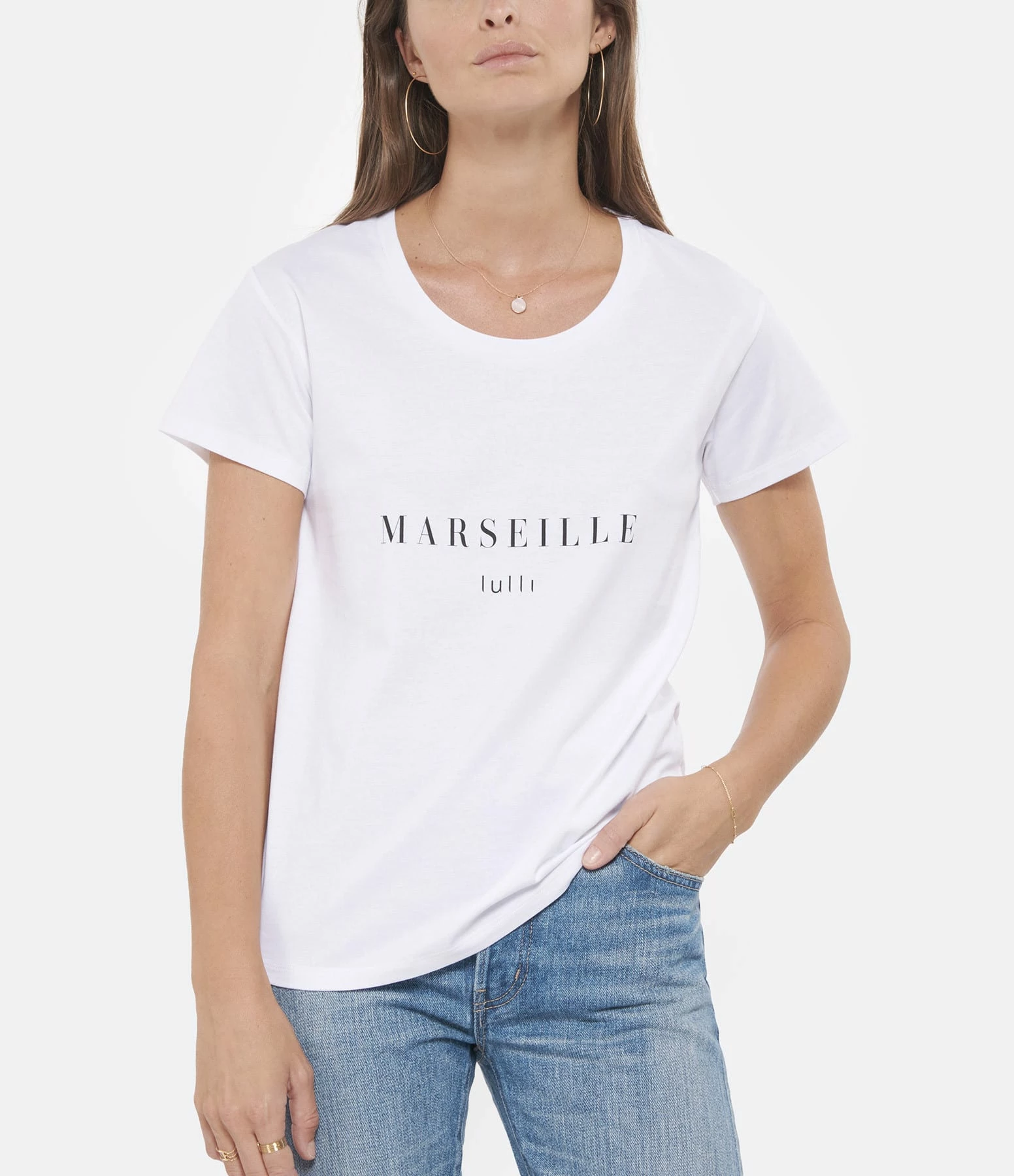 Tee-shirt en coton blanc. Col rond. Manches courtes. Sérigraphie “MARSEILLE lulli” à l’avant. Coupe droite. Base droite.