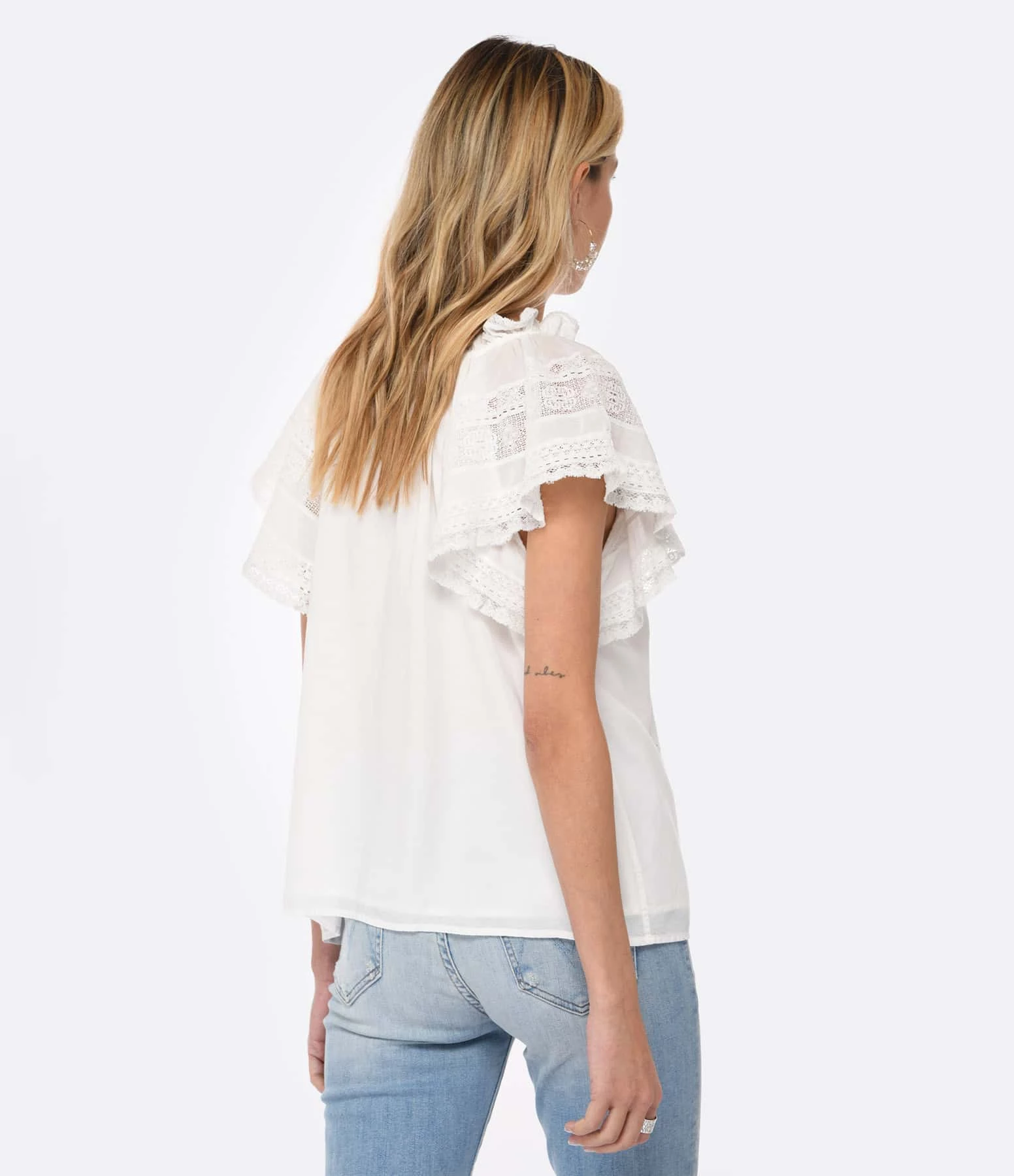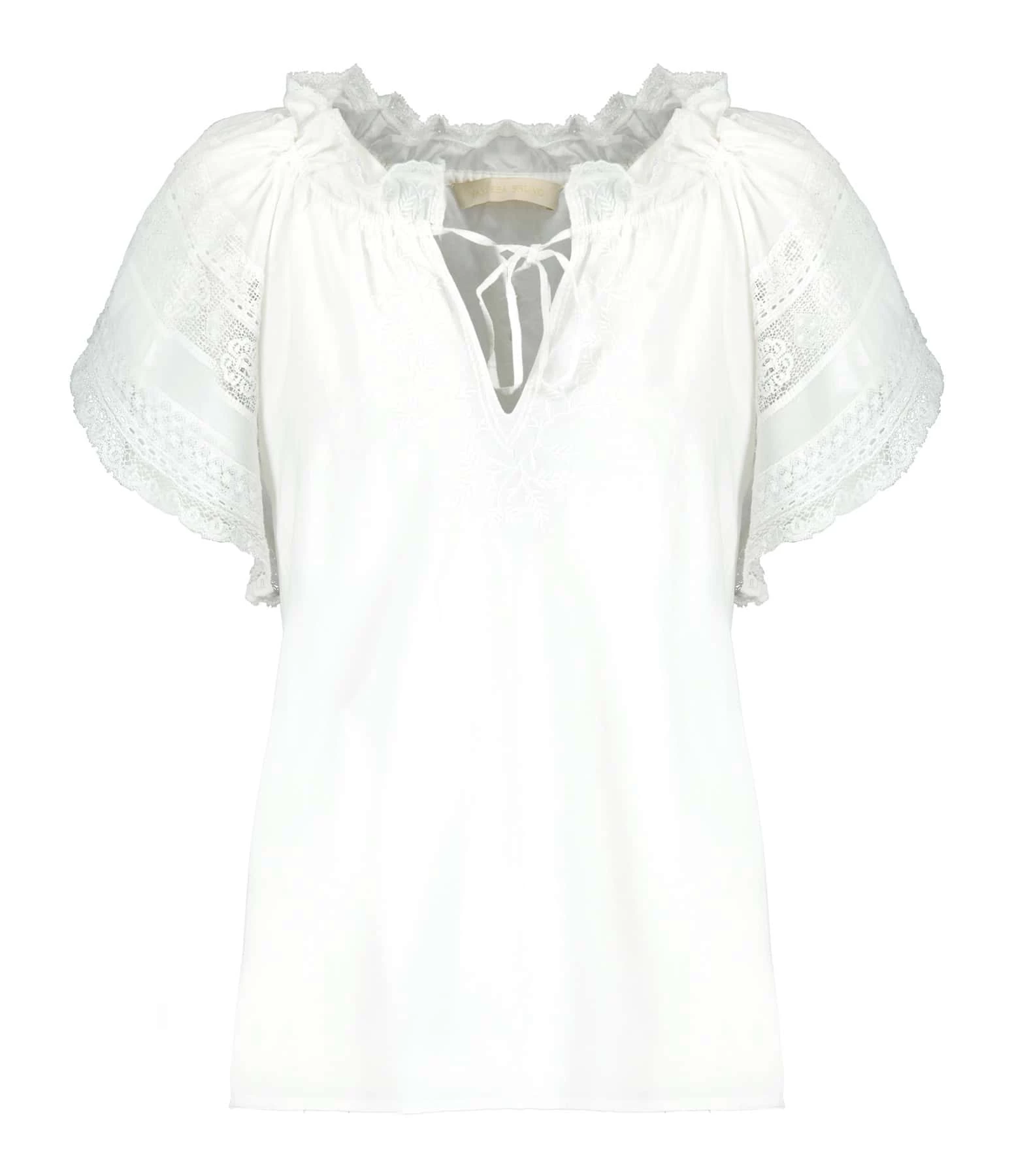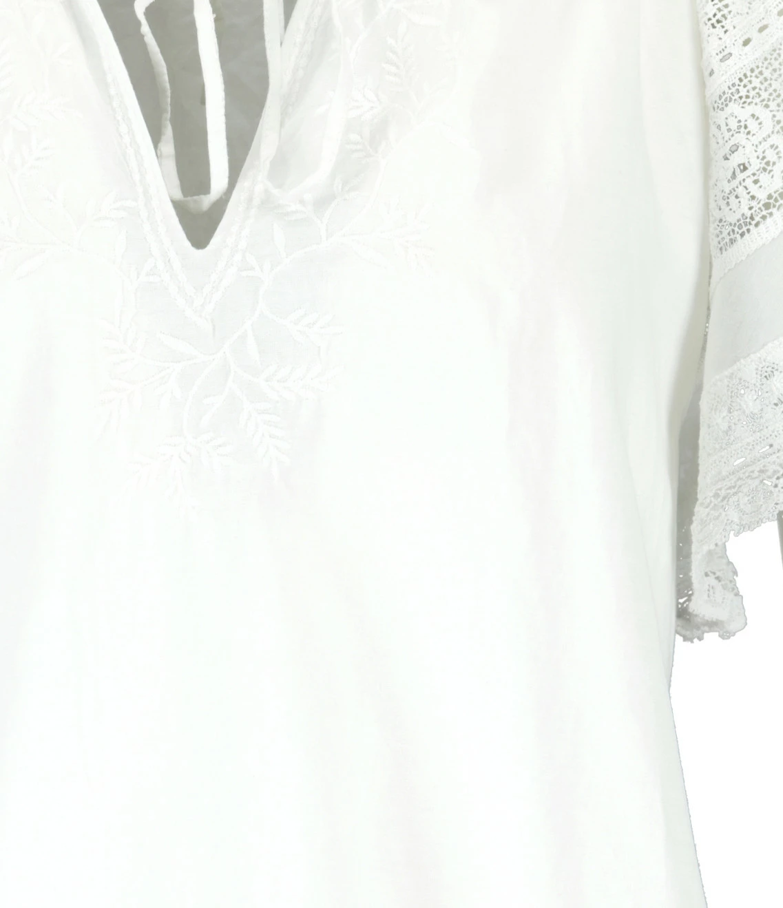 Blouse en coton blanc avec broderies motif fleur et dentelle. Col en V avec liens de serrage. Manches courtes à dentelle et volants.