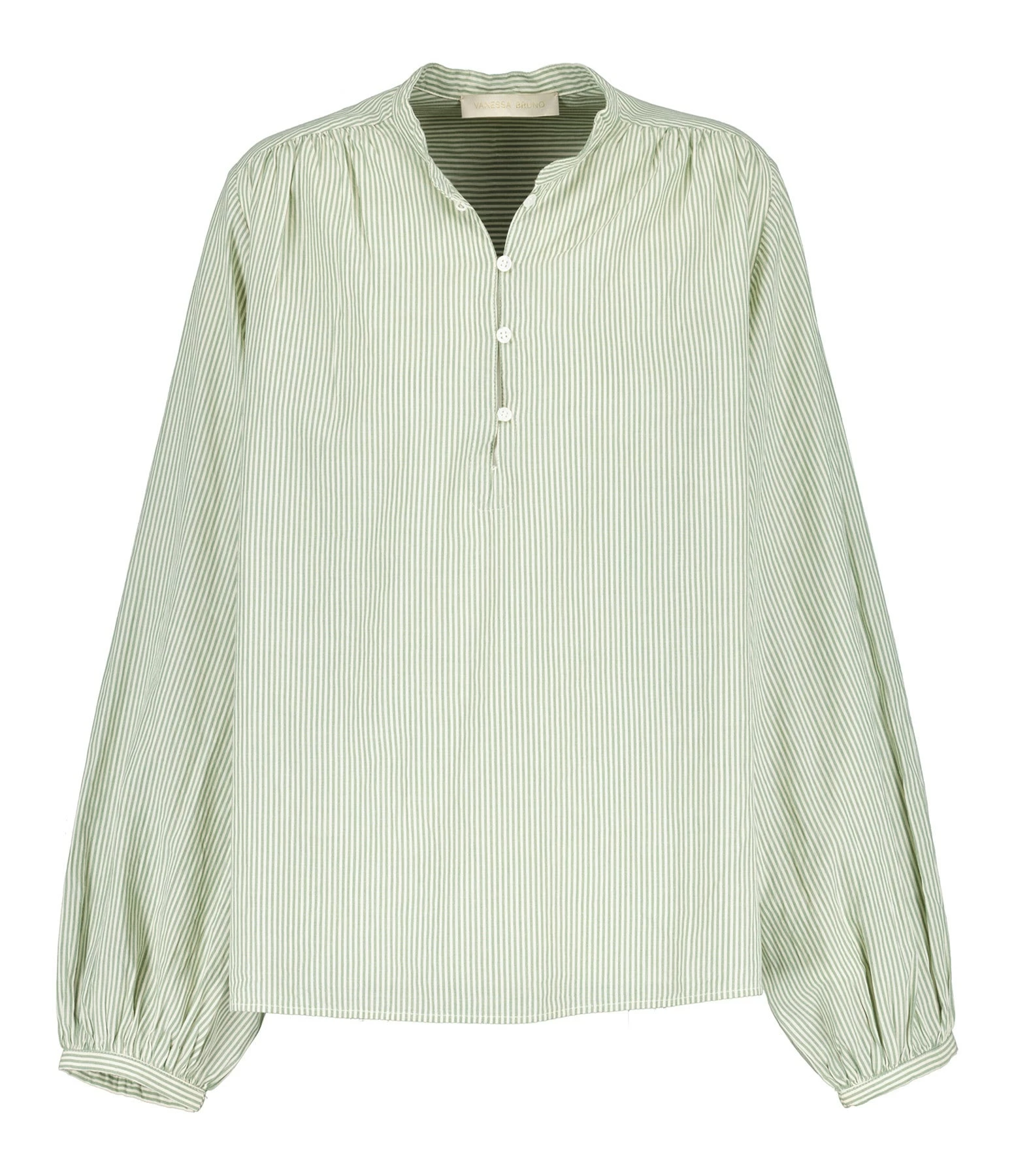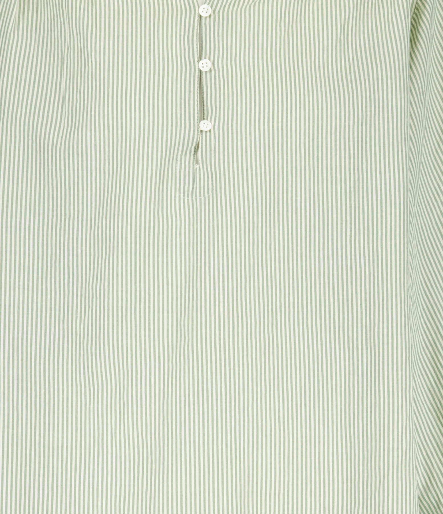 Blouse en coton à rayures vertes et blanches. Col rond. Boutons à l’avant. Manches longues resserrées aux poignets. Coupe droite. Base droite.