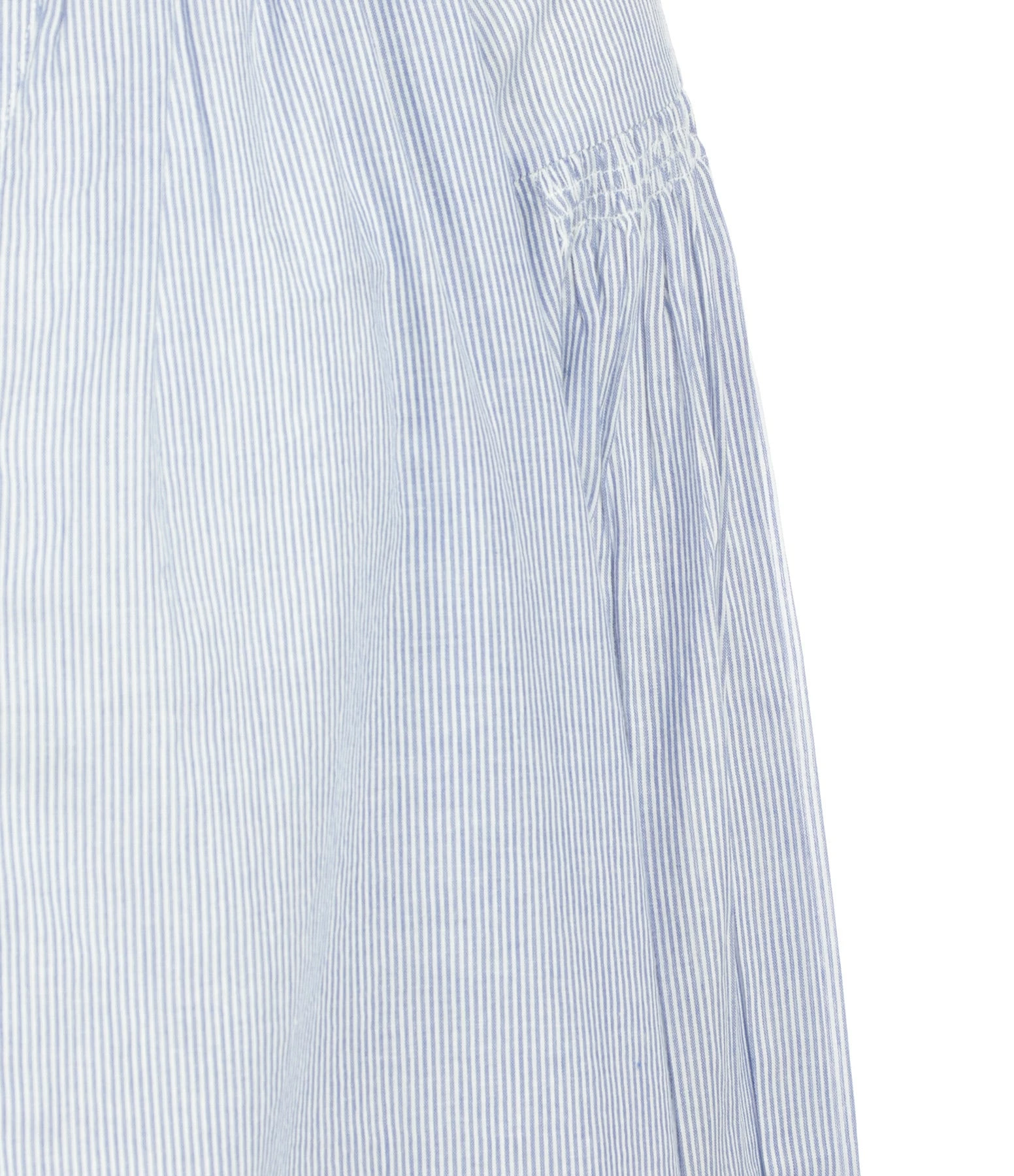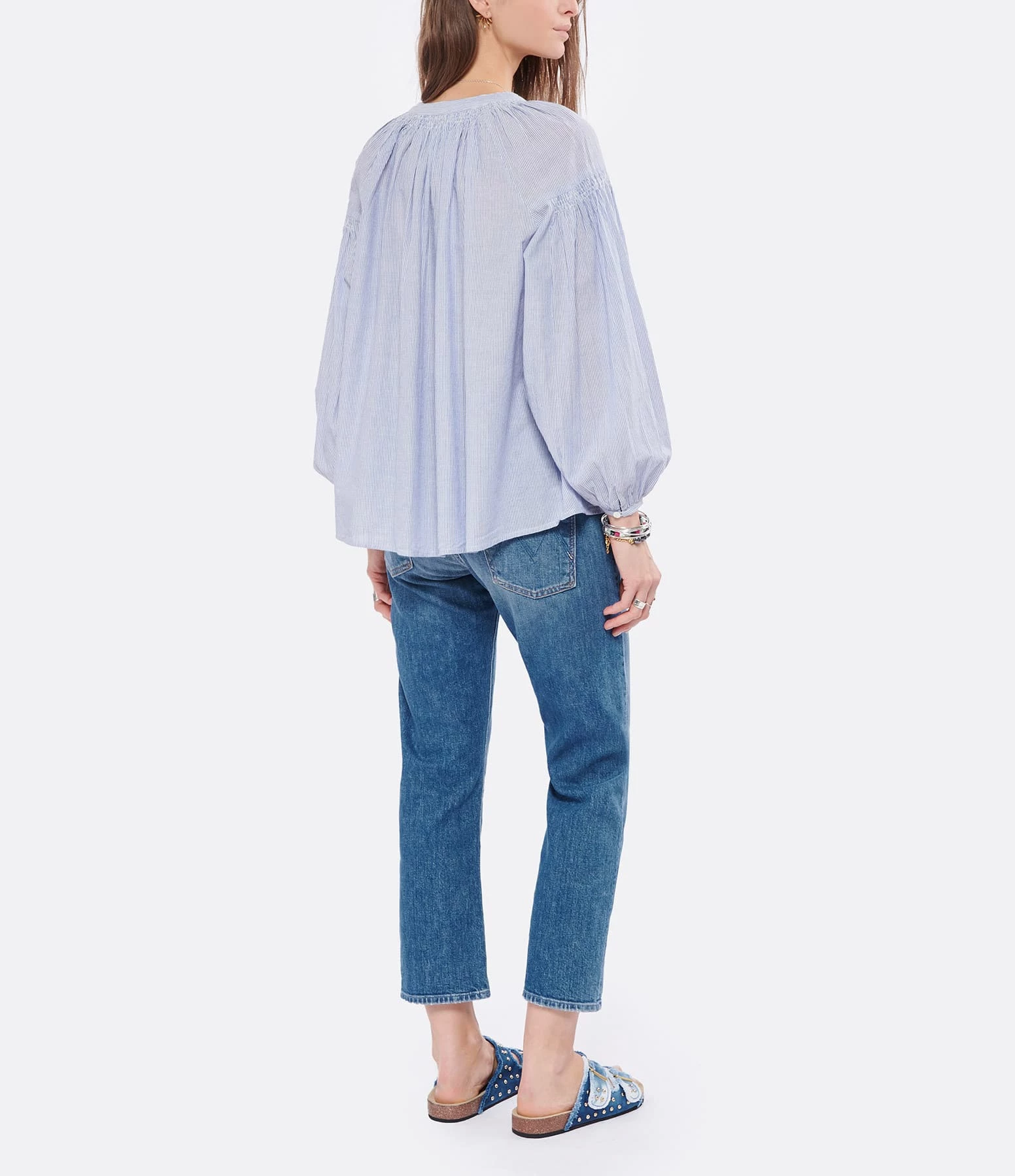 Blouse en coton à rayures blanches et bleues. Col en V froncé. Fermeture boutonnée. Manches longues resserrées aux poignets. Coupe ample. Base droite.