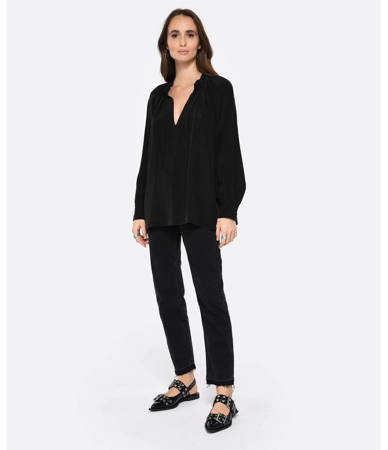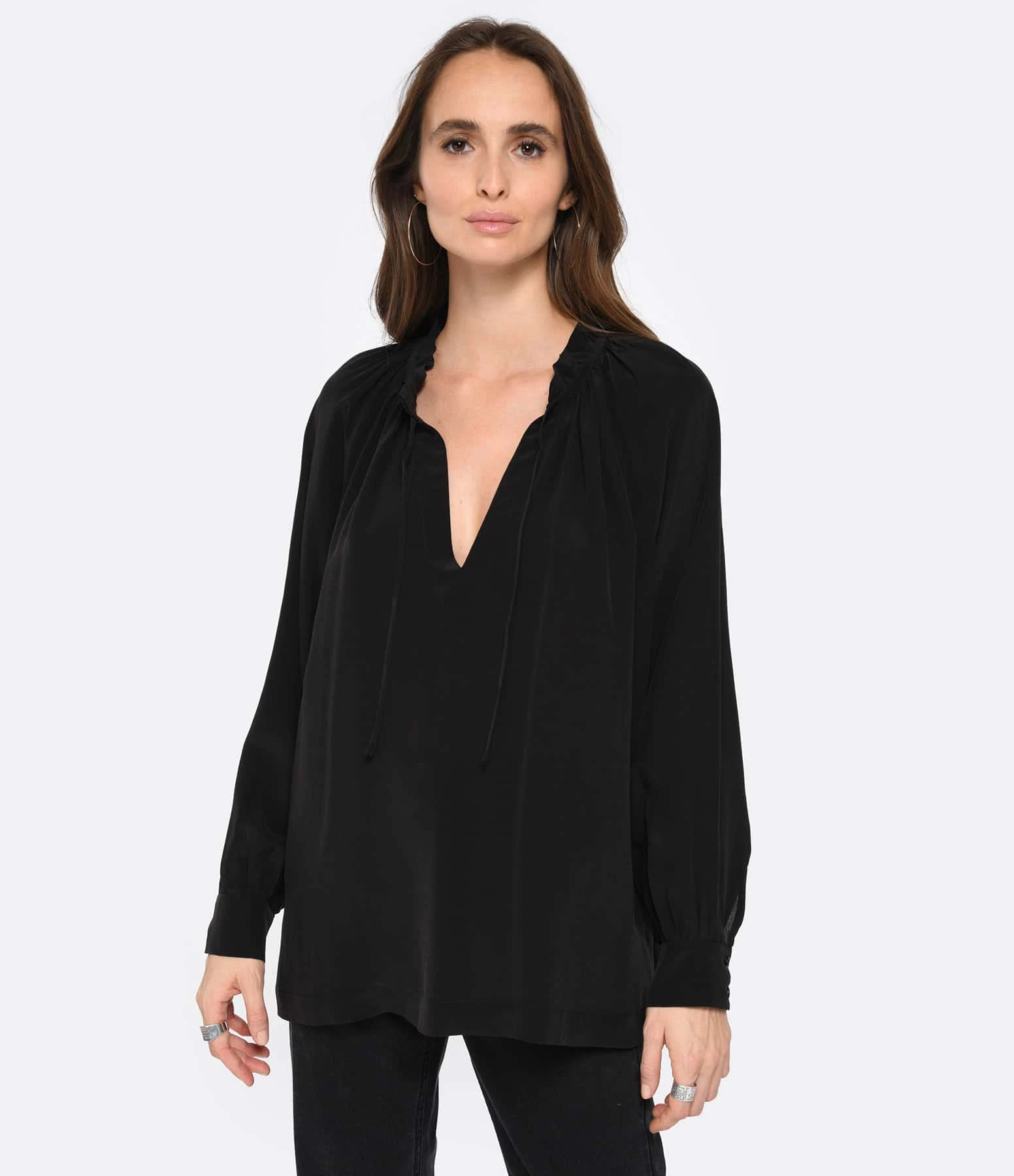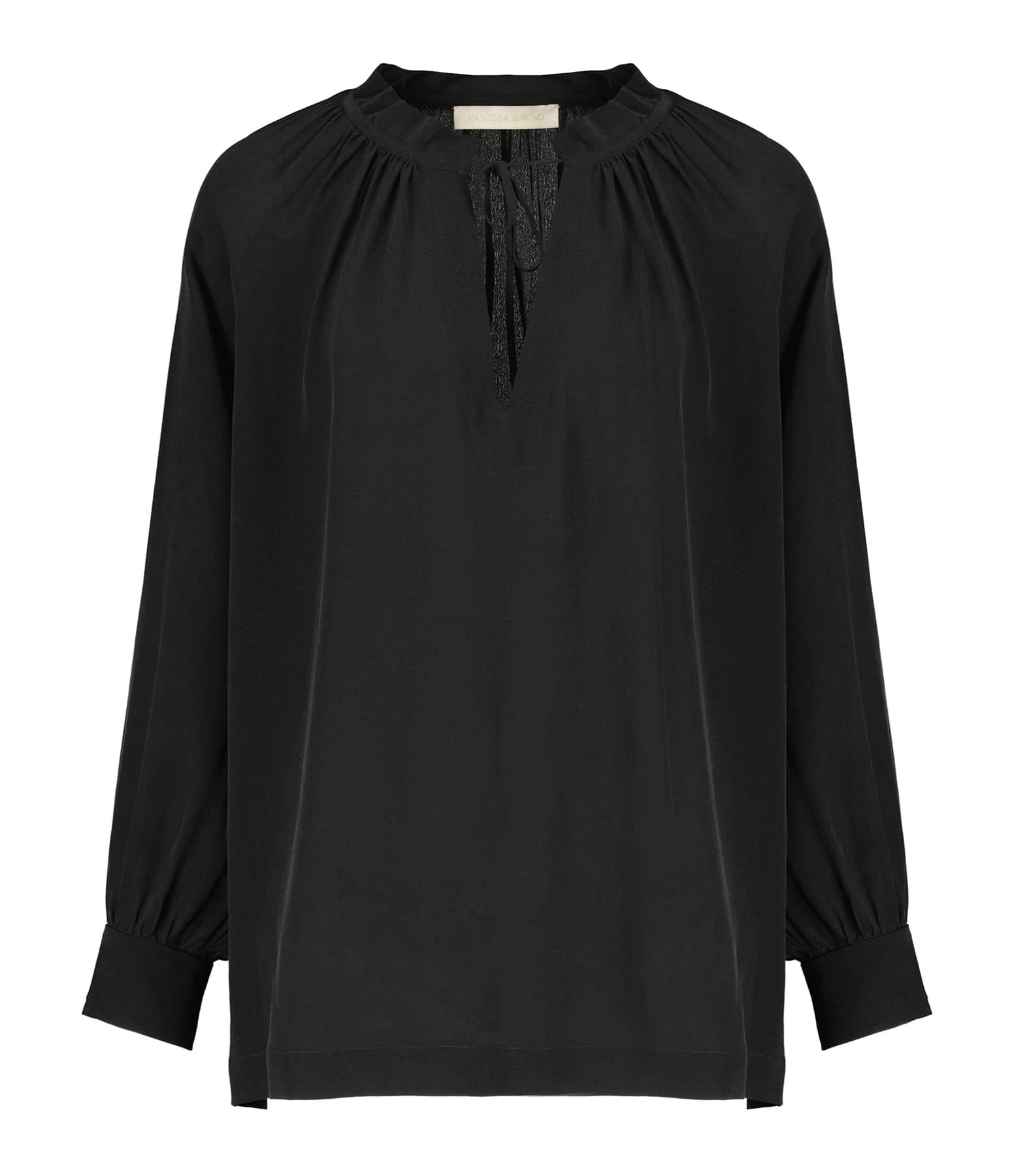 Blouse en soie mélangée noire. Col en V froncée avec liens à nouer. Manches longues avec fentes et poignets froncés et boutonnés. Boutons noirs. Coupe ample. Fentes latérales. Base arrondie.