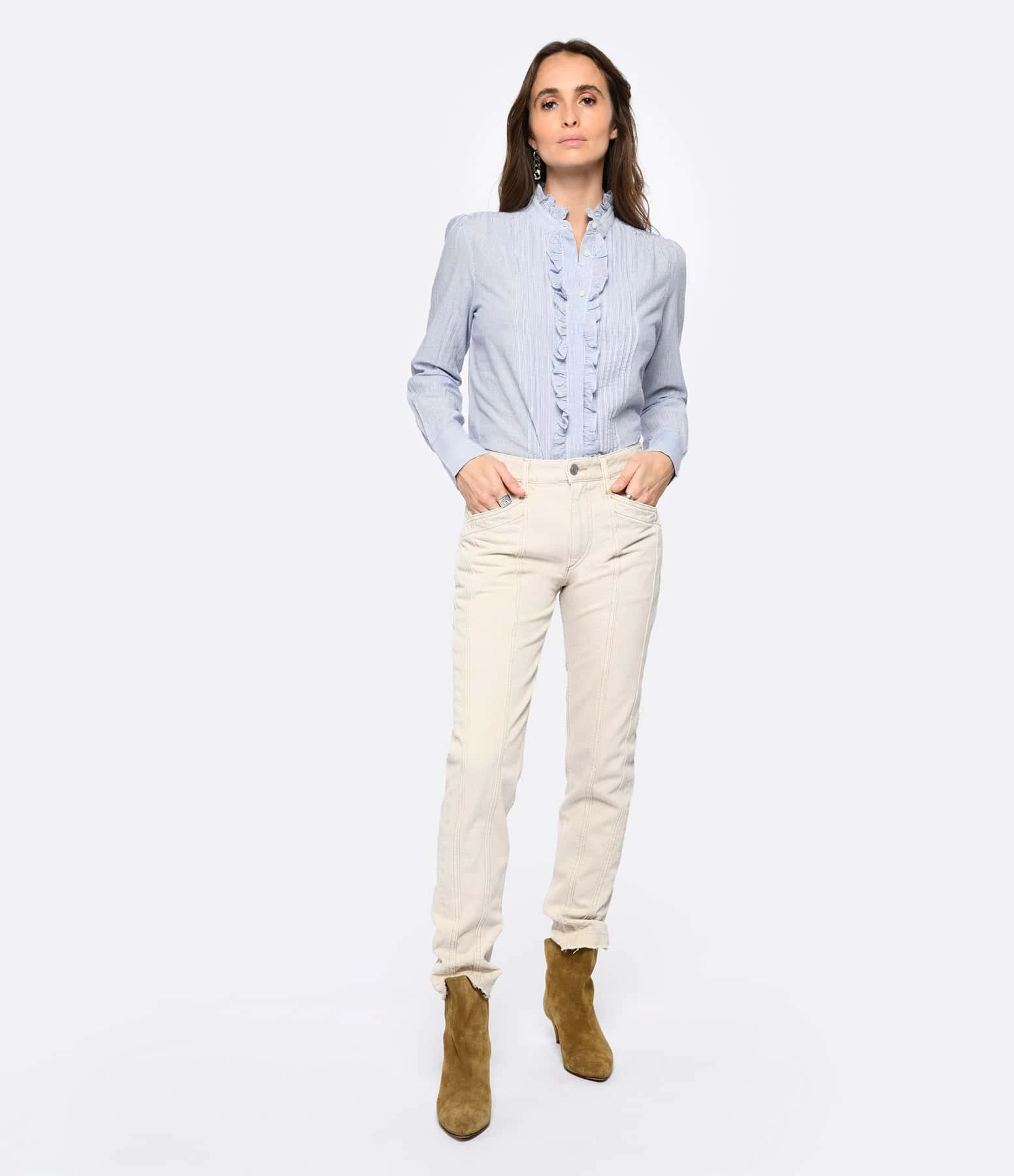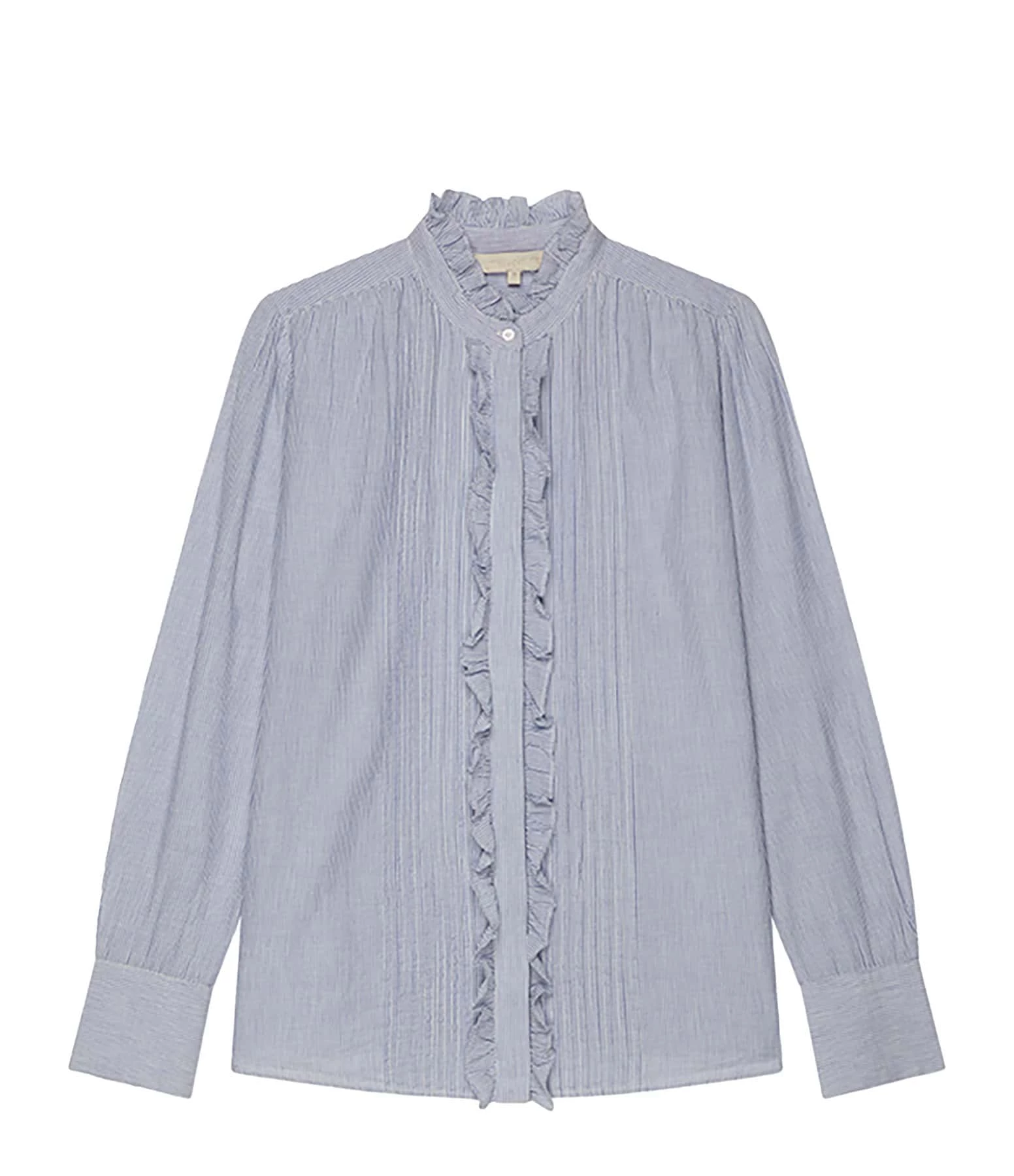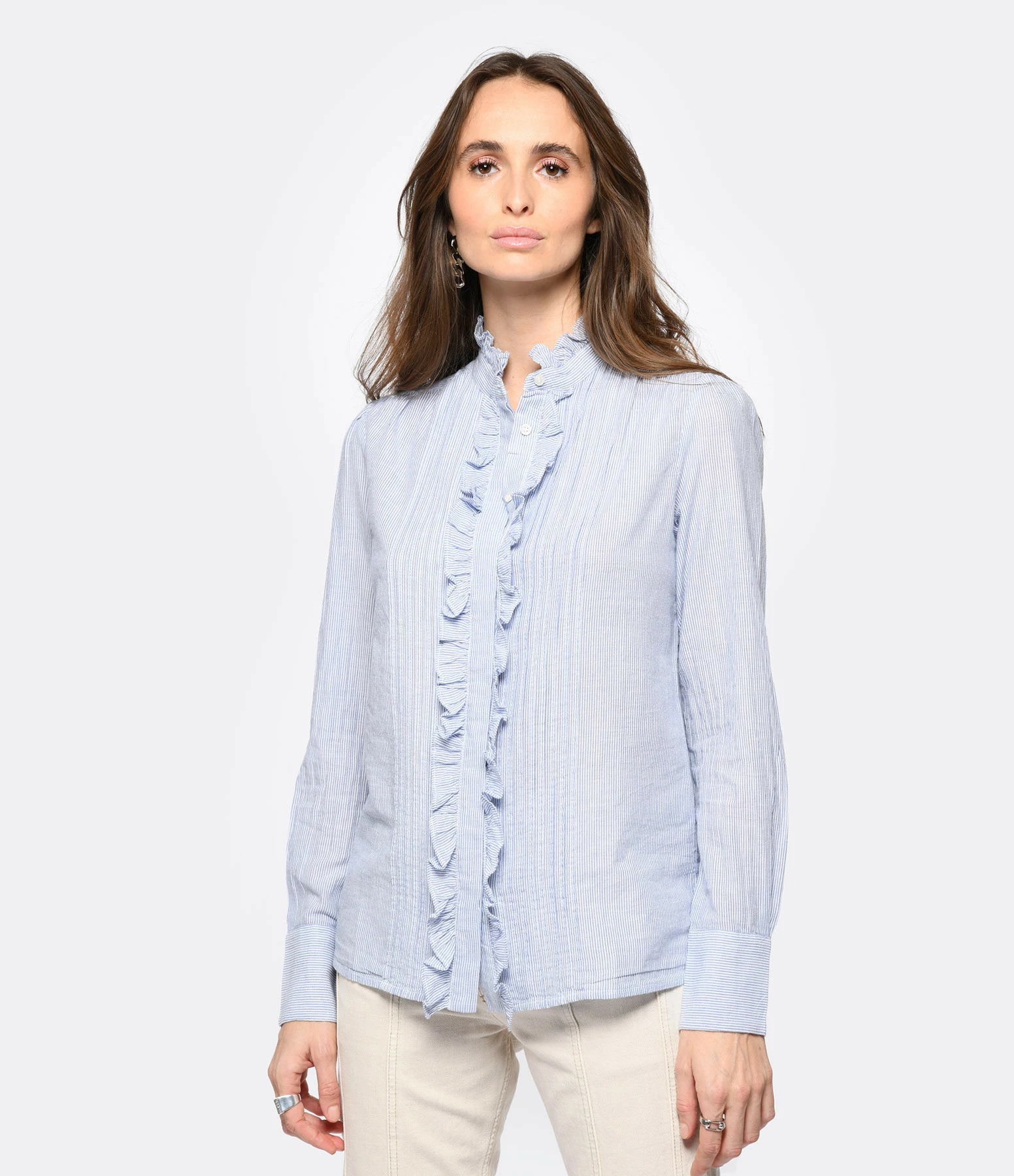 Chemise en coton à fines rayures bleues et blanches. Col officier volanté. Épaules froncées. Manches longues avec fentes et poignets boutonnés. Patte de boutonnage volantée sur le devant. Boutons blancs nacrés. Pli creux dans le dos. Coupe droite. Base droite.