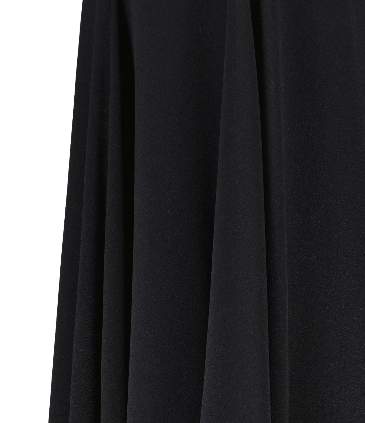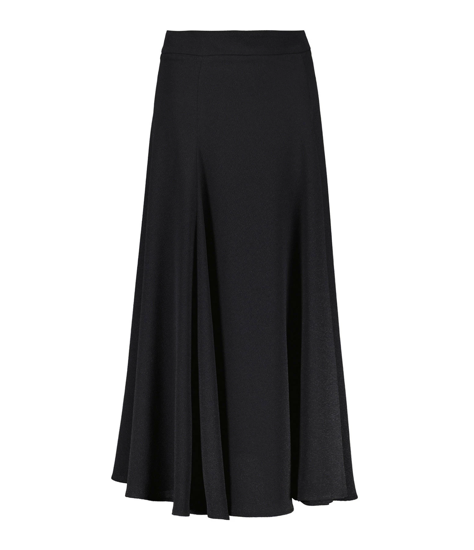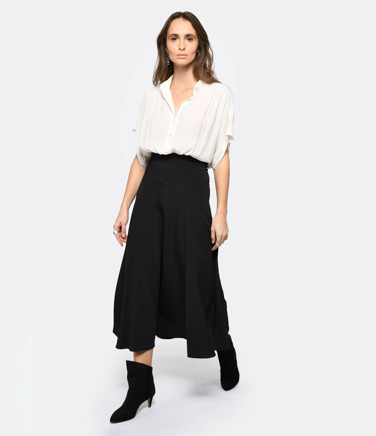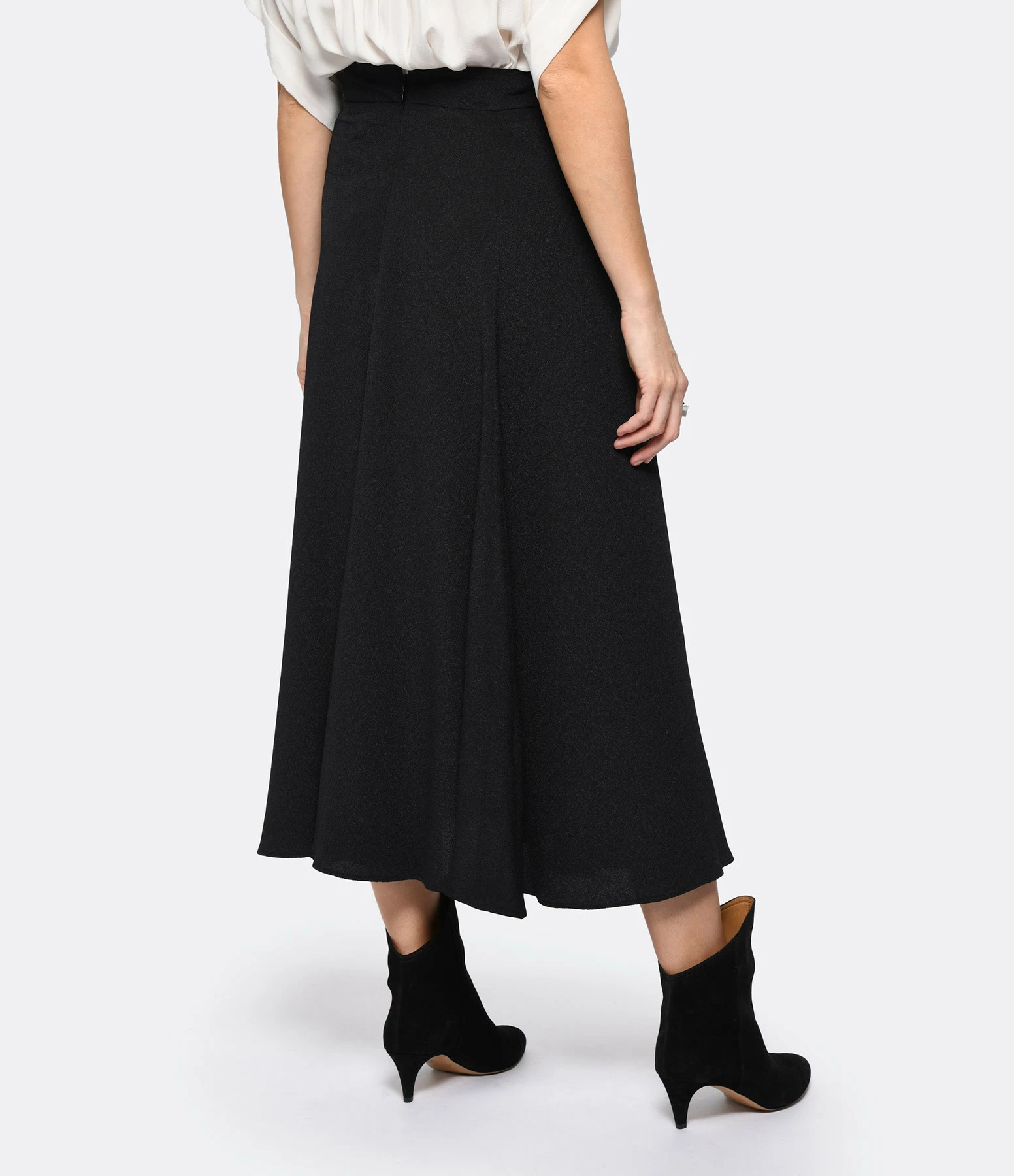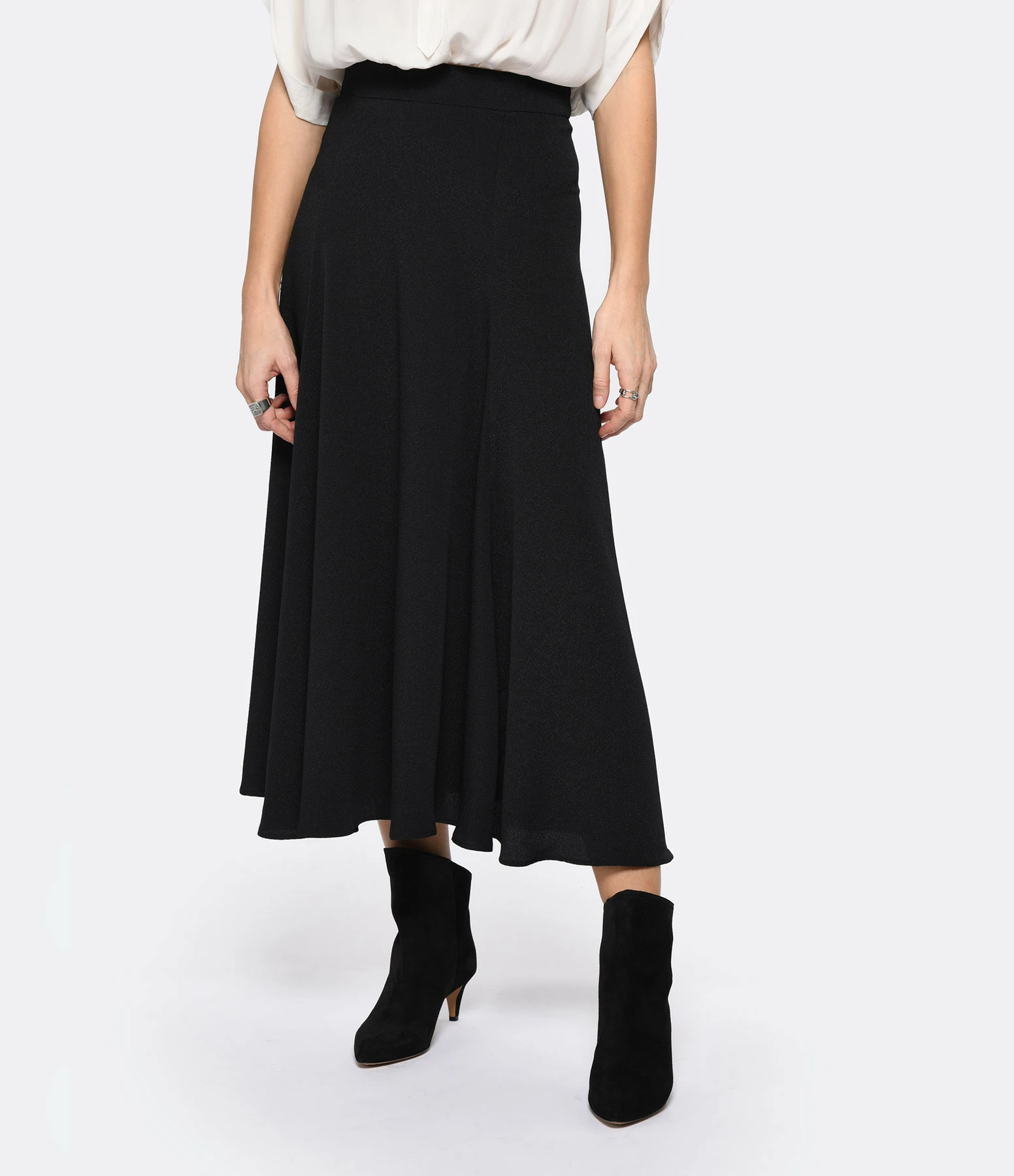 Jupe midi en crêpe noire. Fermeture zippée invisible milieu dos. Coupe évasée. Base arrondie.
