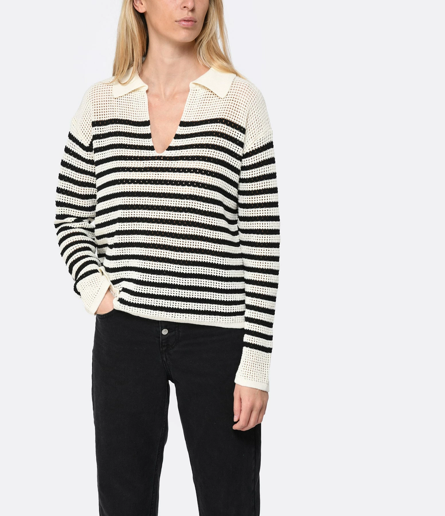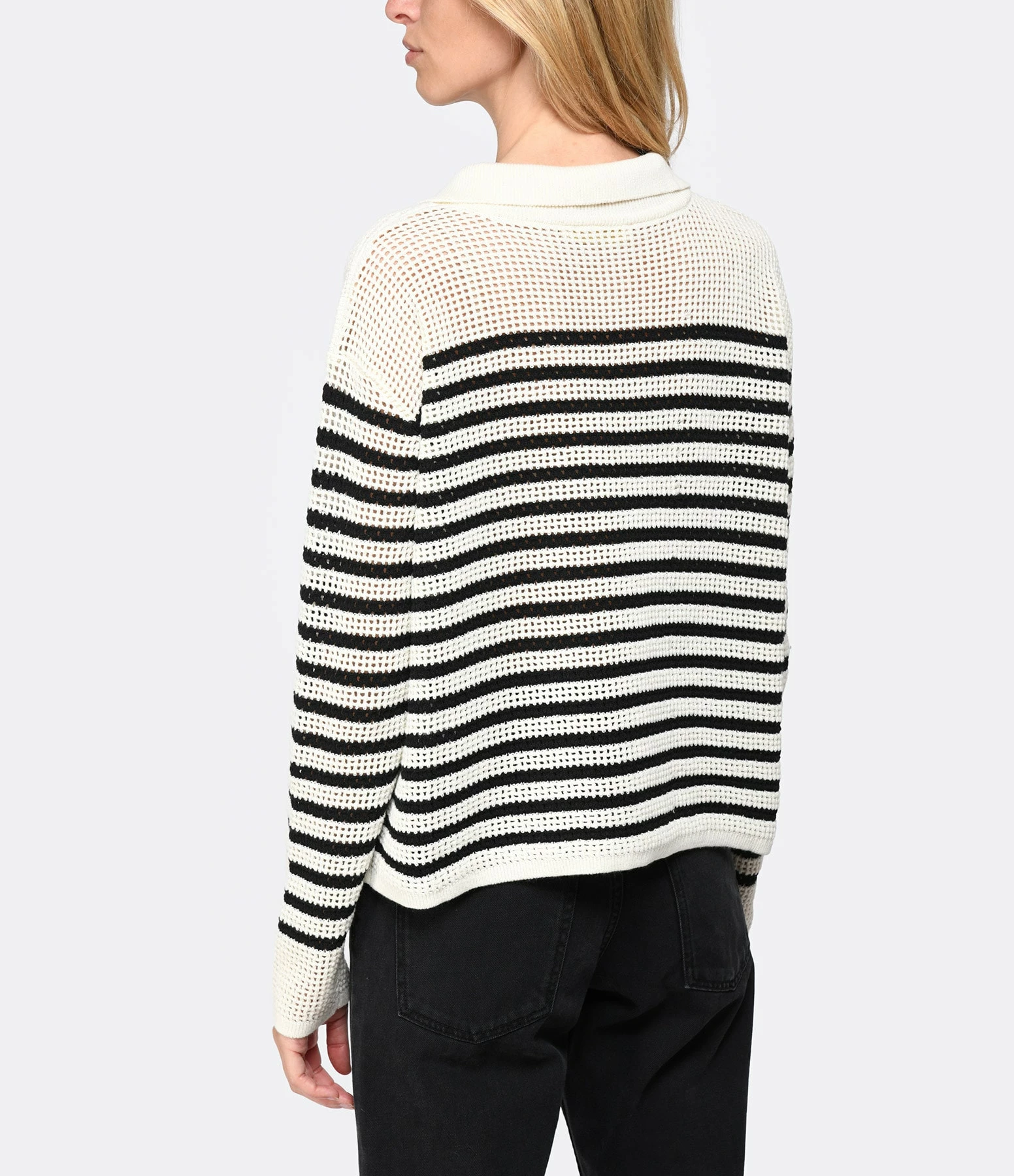 Pull à rayures écru et noir effet maille résille. Manches longues. Col tunisien. Coupe ample. Base droite.