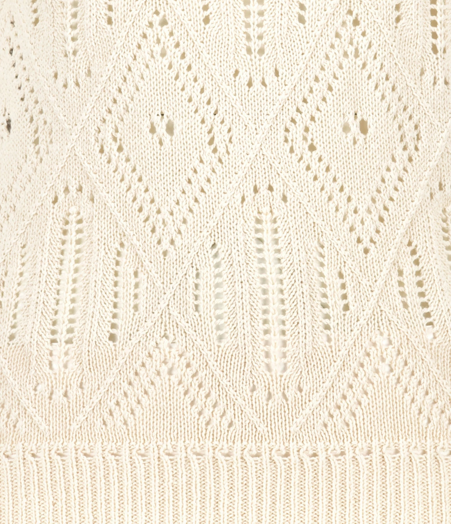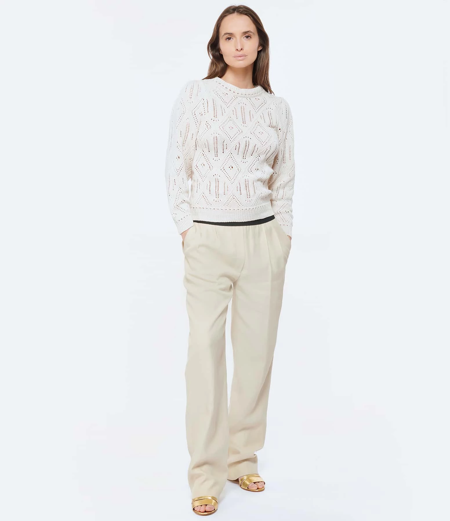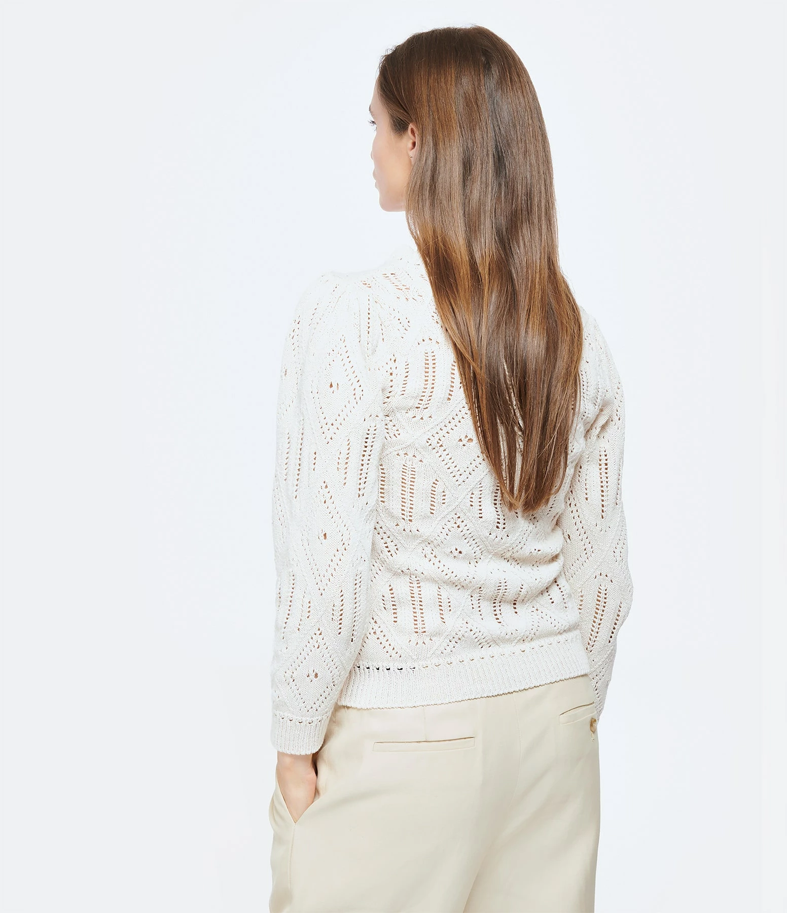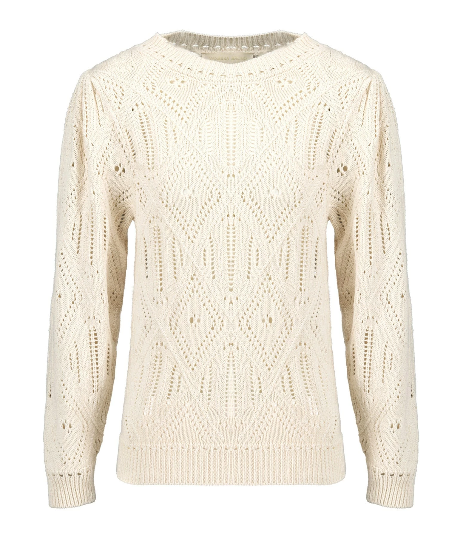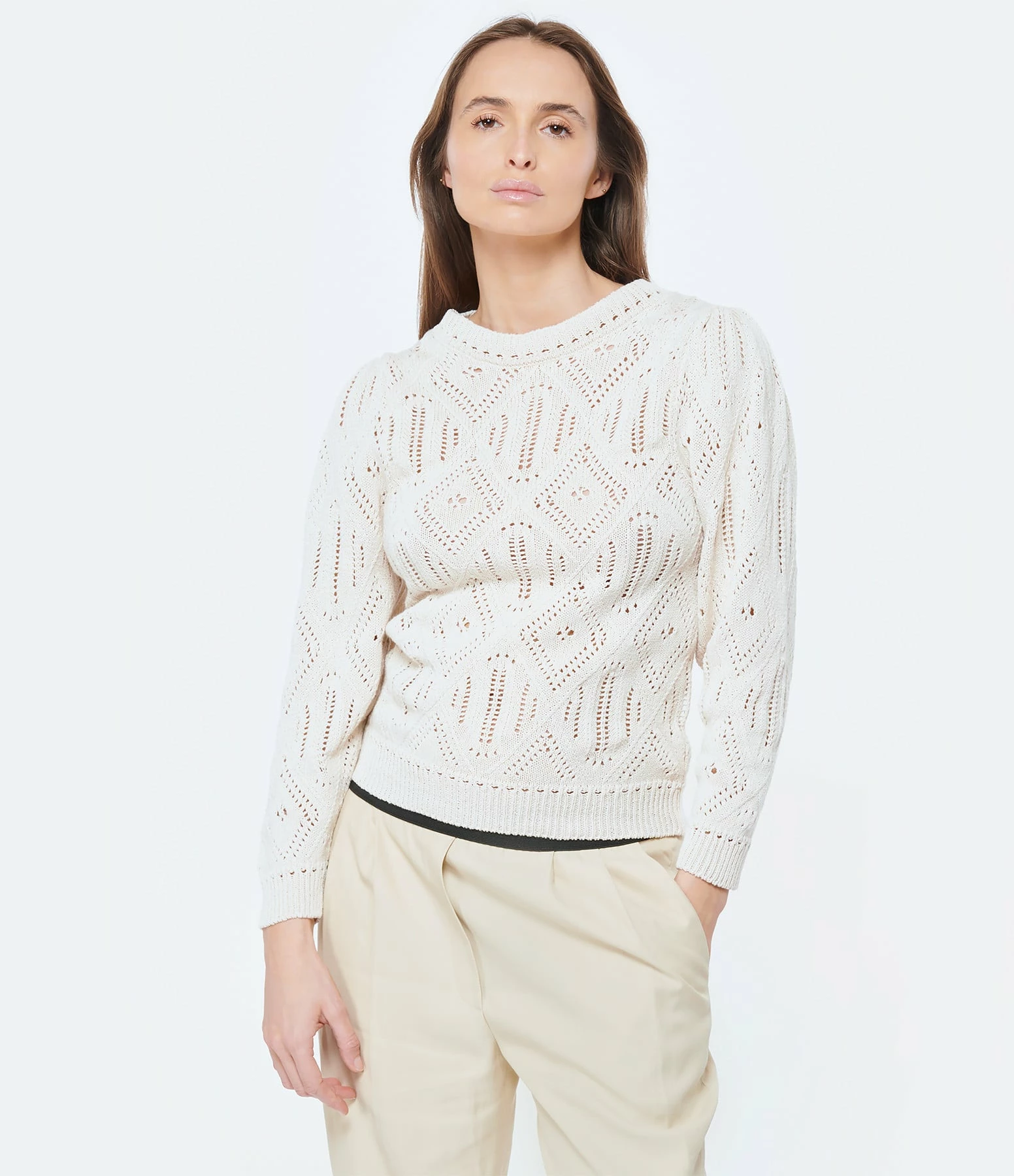 Pull en coton écru. Effet ajouré. Col rond. Manches longues. Coupe droite. Base droite.
