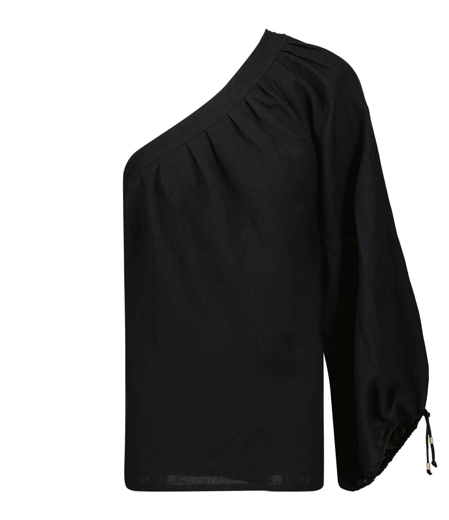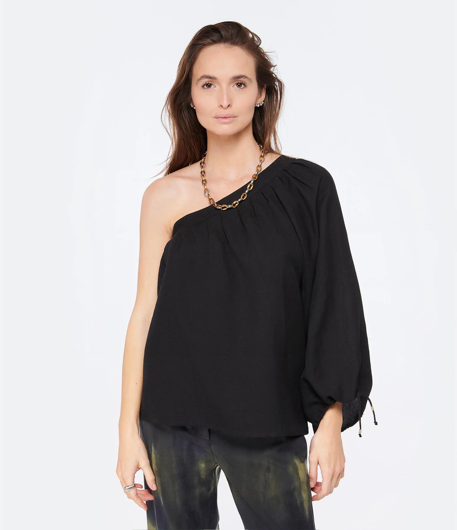 Top asymétrique en lin noir. Manche bouffante avec liens à nouer. Coupe ample. Base droite.