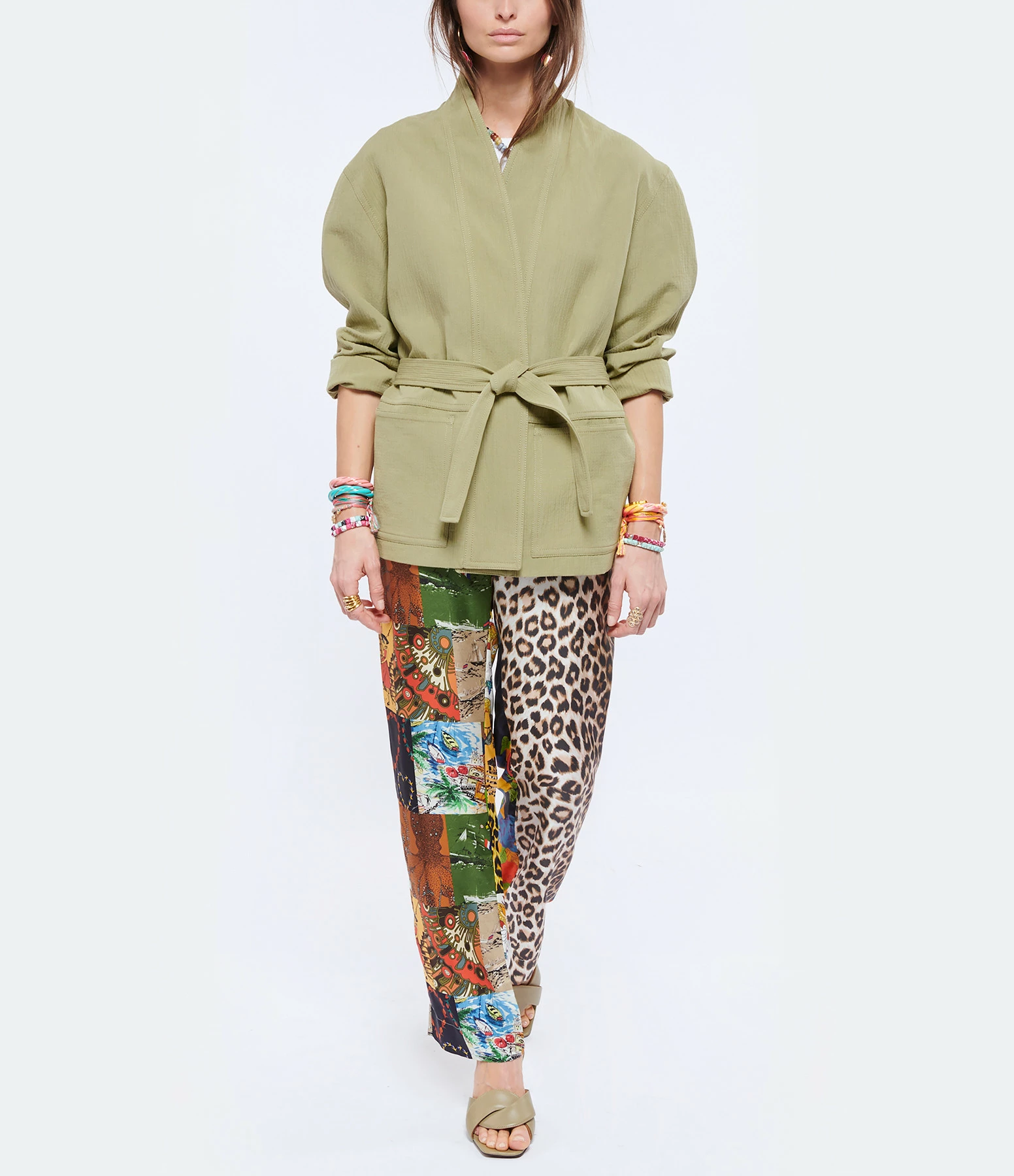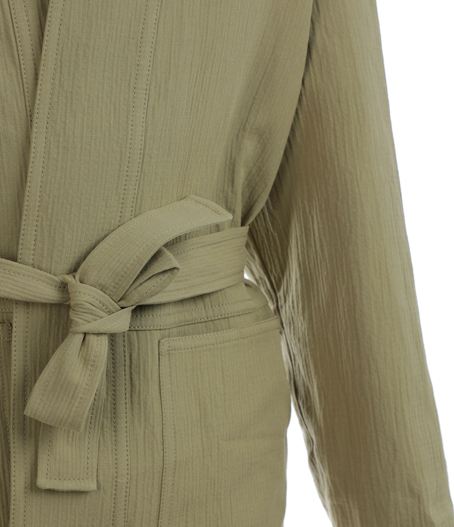 Veste en coton kaki. Manches longues. Coupe ouverte. Ceinture amovible et passants pour ceinture. Coupe droite. Base droite.