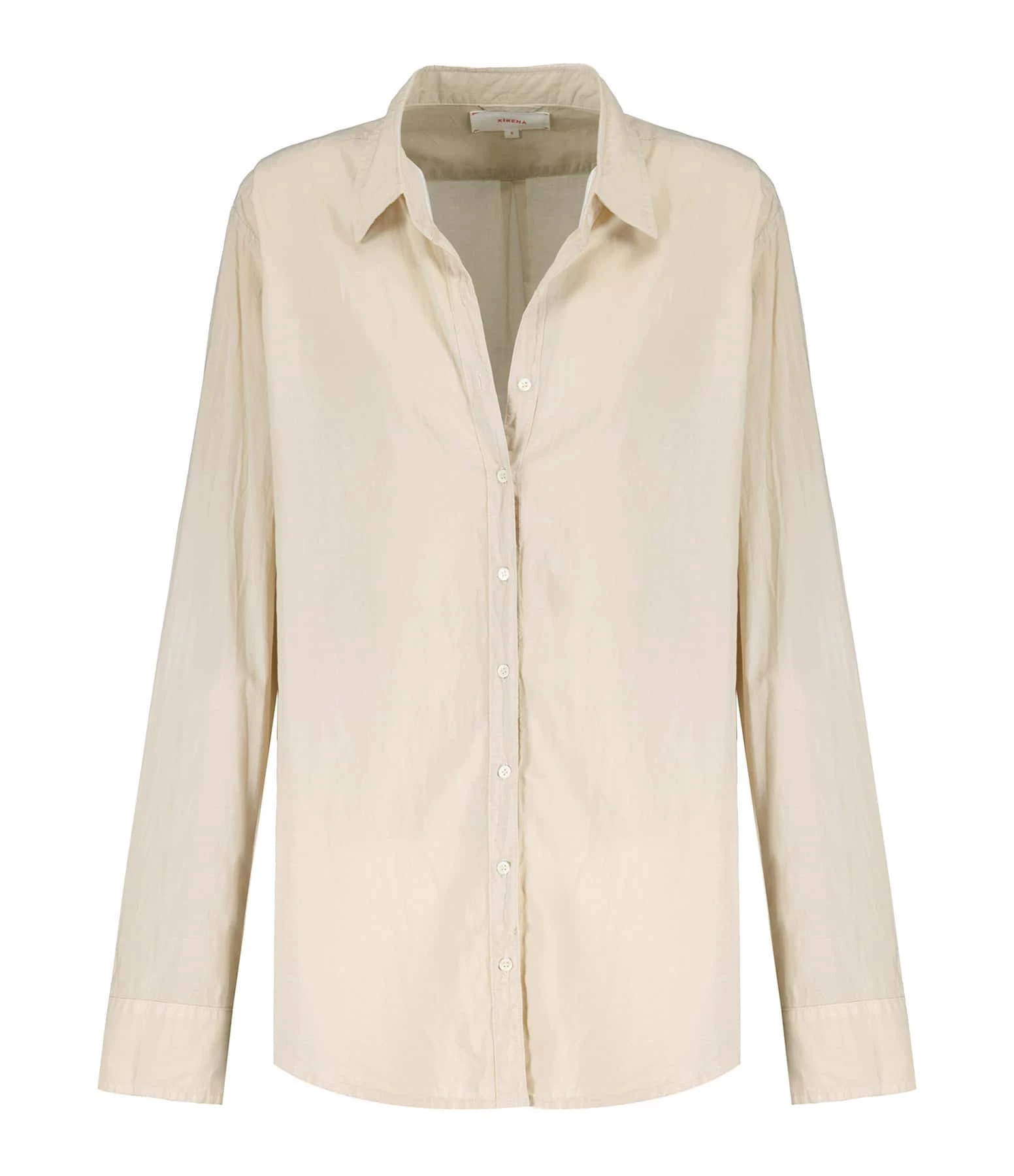 Chemise longue en coton beige. Col chemisier. Manches longues avec fentes et poignets boutonnés. Fermeture boutonnée sur le devant. Boutons blancs. Coupe droite ample. Base arrondie plus longue à l’arrière.