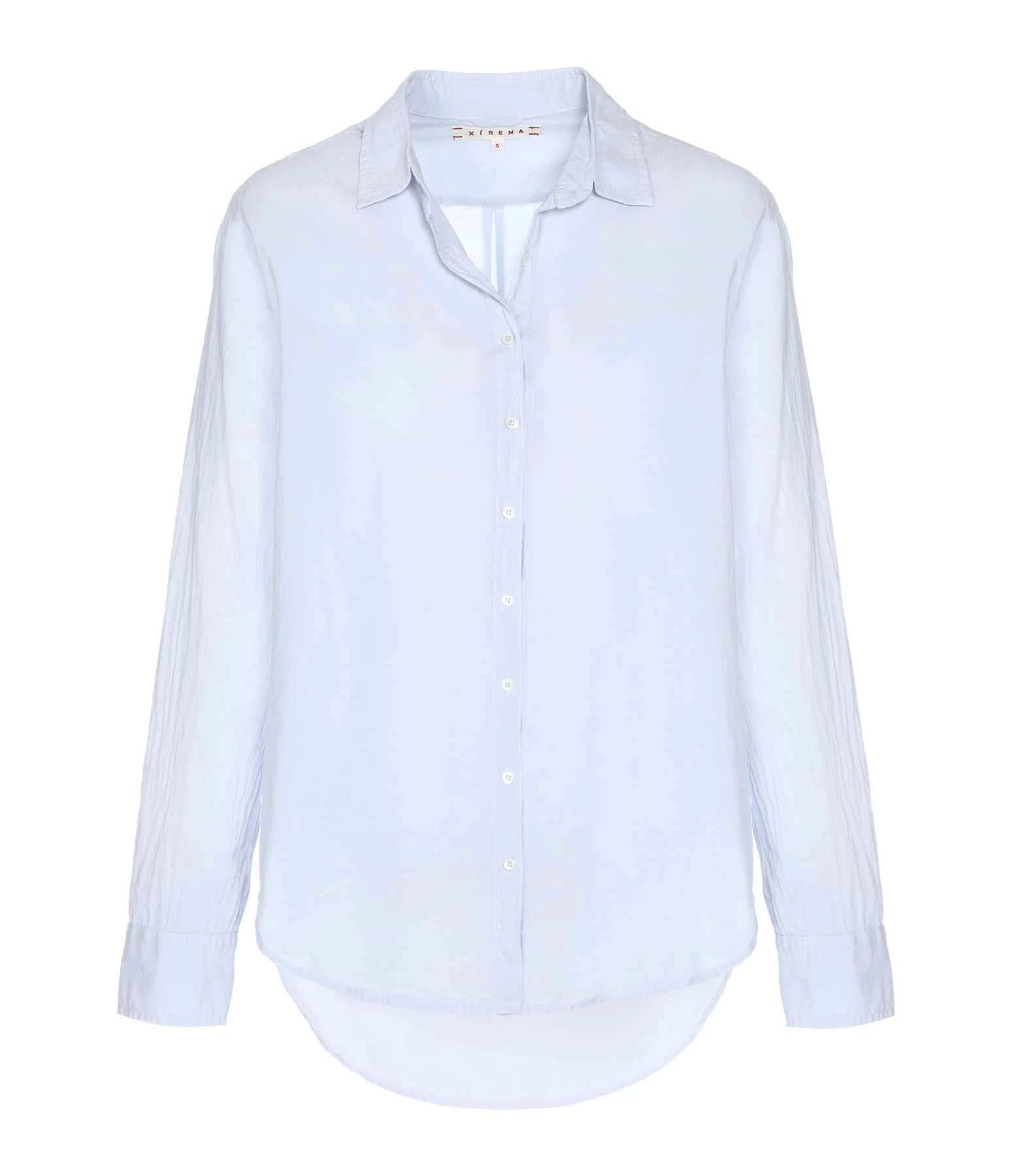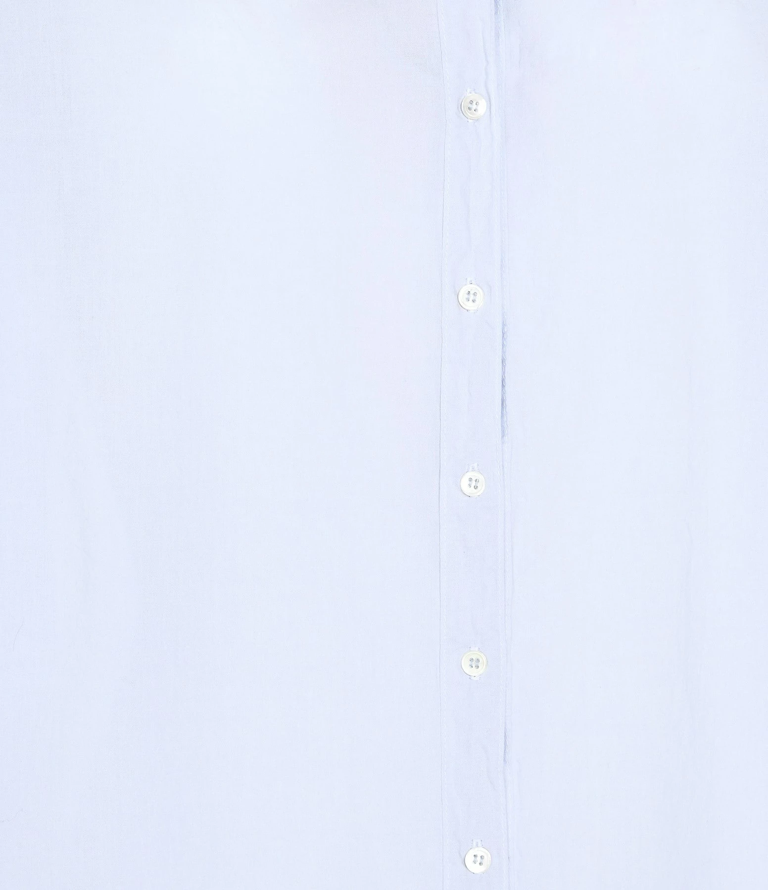 Chemise longue en coton bleu ciel. Col chemisier. Manches longues avec fentes et poignets boutonnés. Fermeture boutonnée sur le devant. Boutons blancs. Coupe droite ample. Base arrondie plus longue à l’arrière.