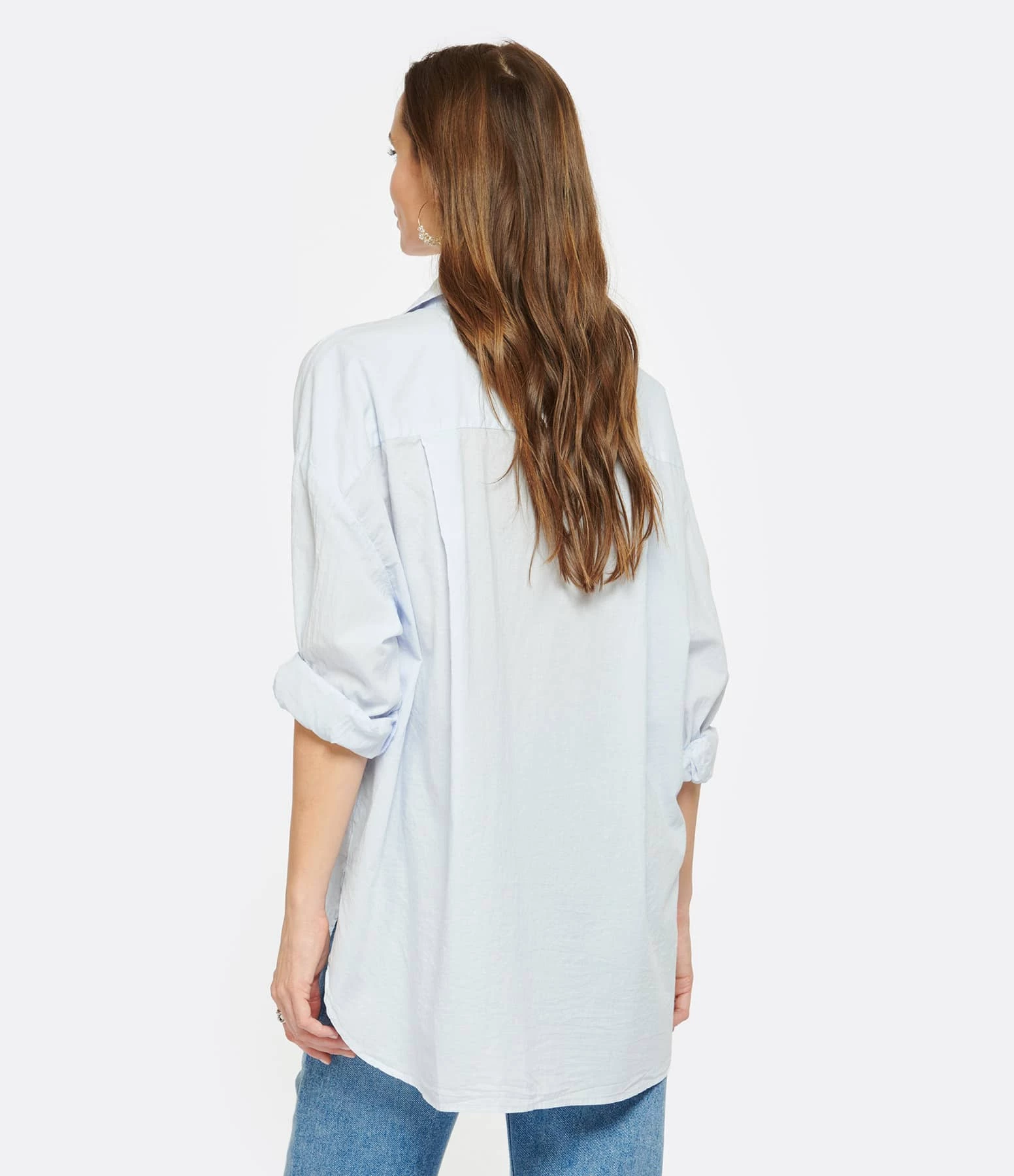 Chemise en coton bleu ciel. Col chemisier. Manches longues avec fentes et poignets boutonnés. Fermeture boutonnée sur le devant. Boutons blancs. Une poche plaquée poitrine. Fentes latérales en bas. Coupe droite ample. Base arrondie.