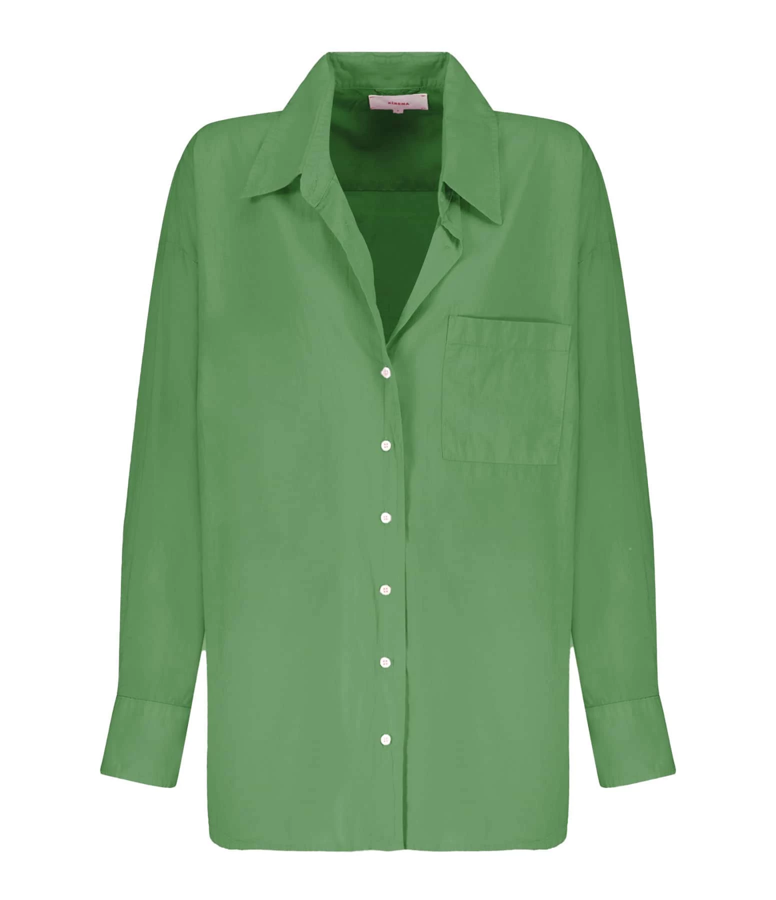 Chemise en coton vert. Col chemisier. Manches longues avec fentes et poignets boutonnés. Fermeture boutonnée sur le devant. Boutons blancs. Une poche plaquée poitrine. Fentes latérales en bas. Coupe droite ample. Base arrondie.