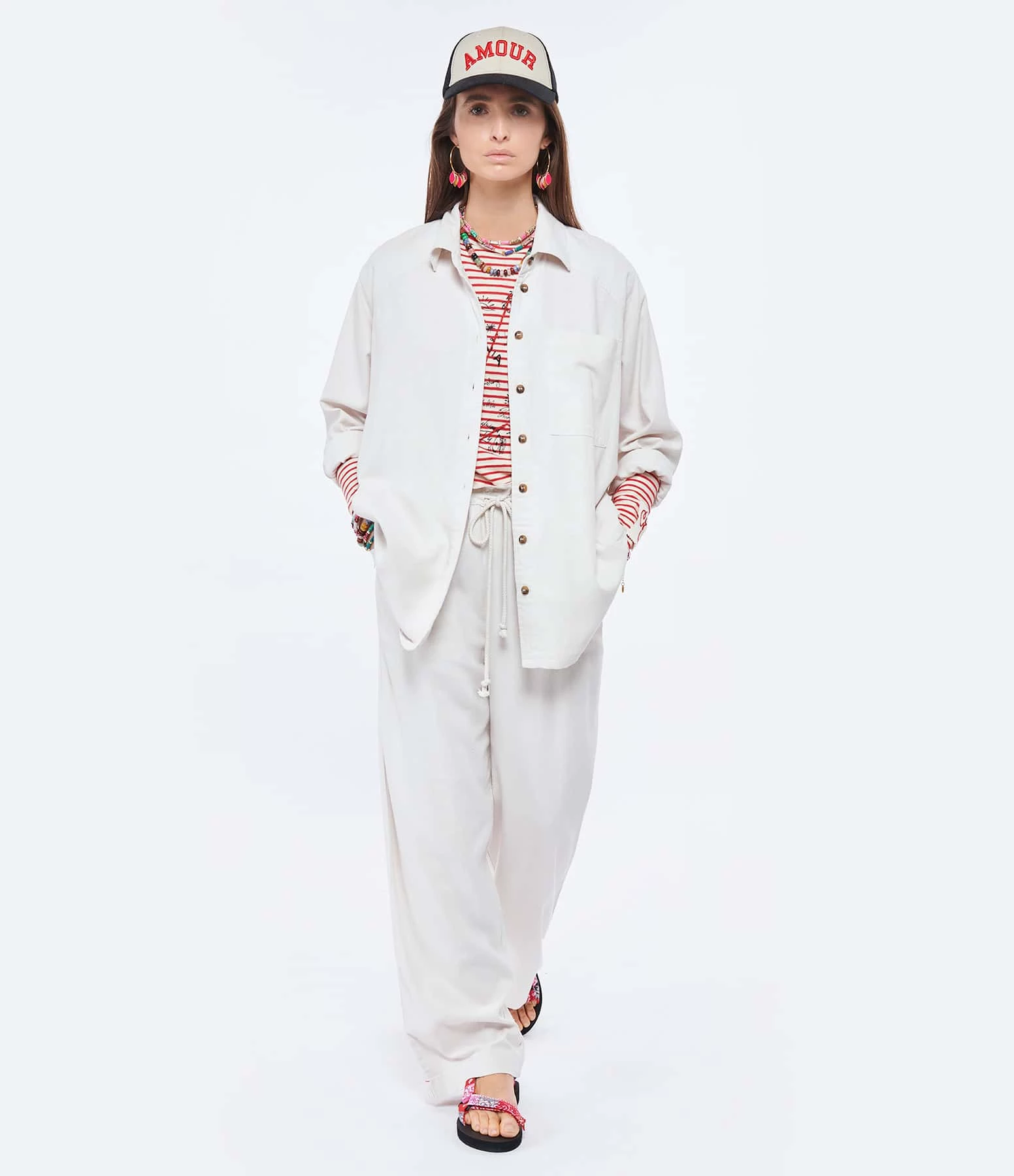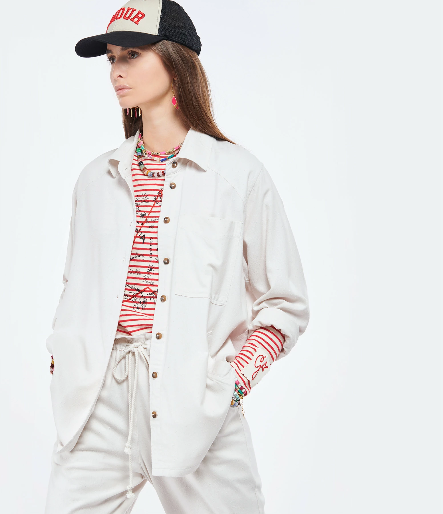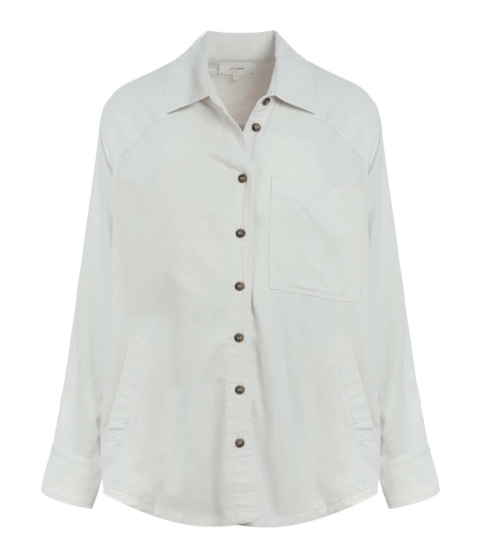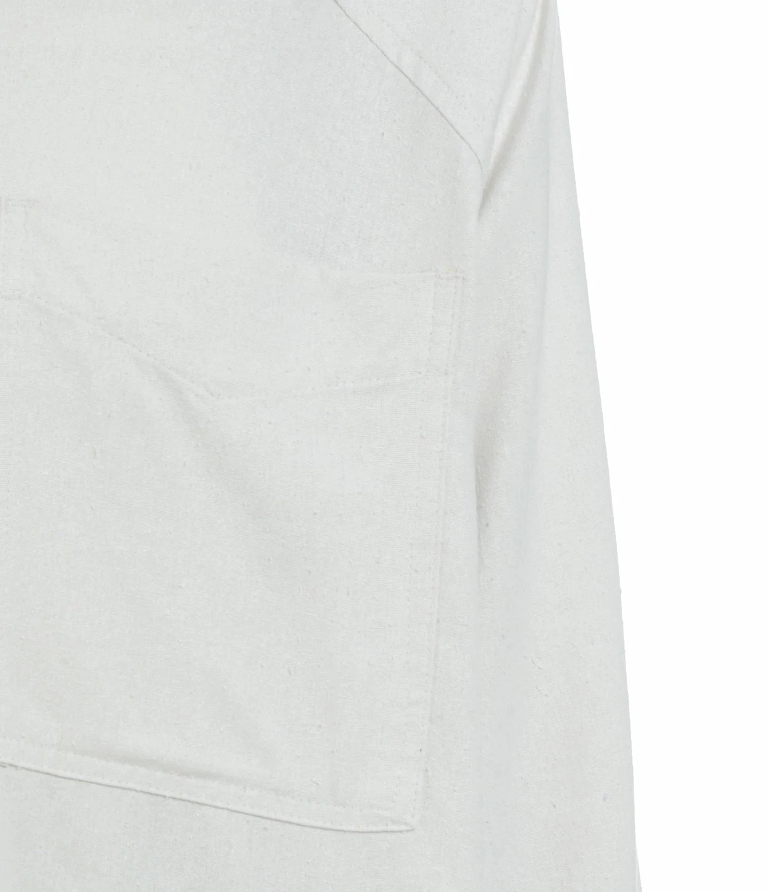 Chemise en soie écrue. Col chemise. Manches longues. Fermeture boutonnée. Une poche plaquée sur la poitrine et deux poches passepoilées en biais. Coupe droite. Base arrondie.