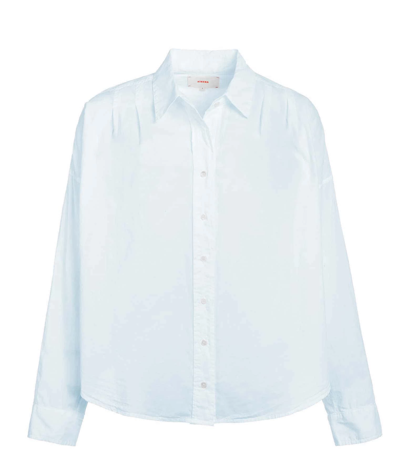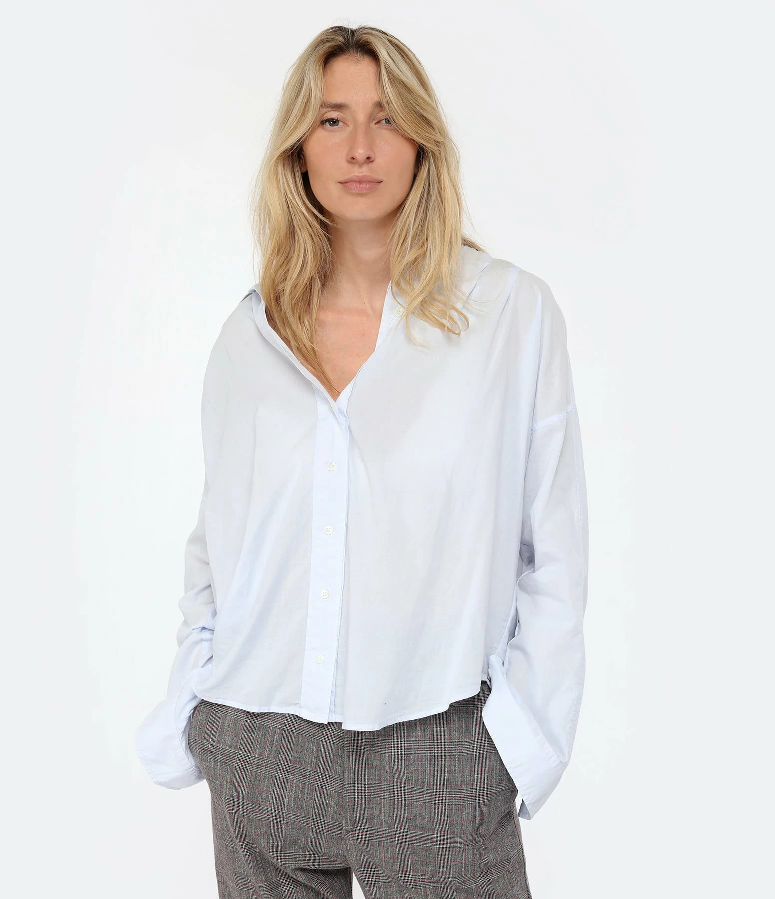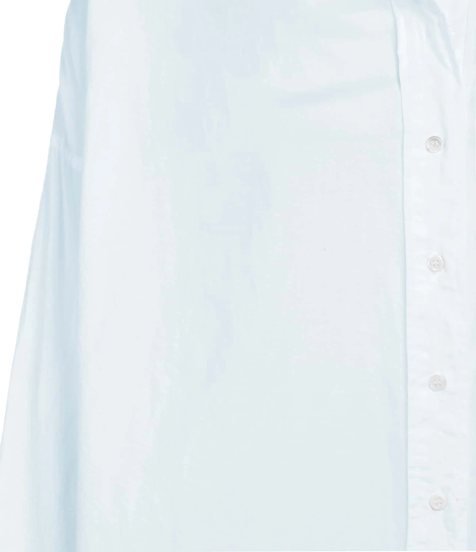 Chemise en coton bleu ciel. Col chemisier. Manches longues avec fentes et poignets boutonnés. Fermeture boutonnée sur le devant. Boutons blancs. Coupe droite ample. Base arrondie plus longue à l’arrière.