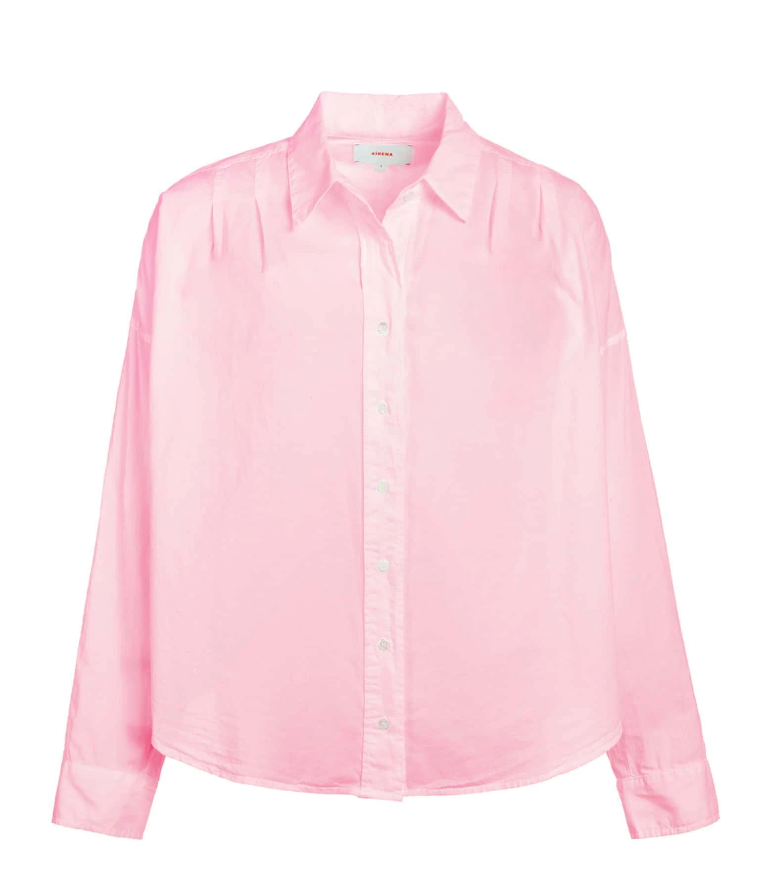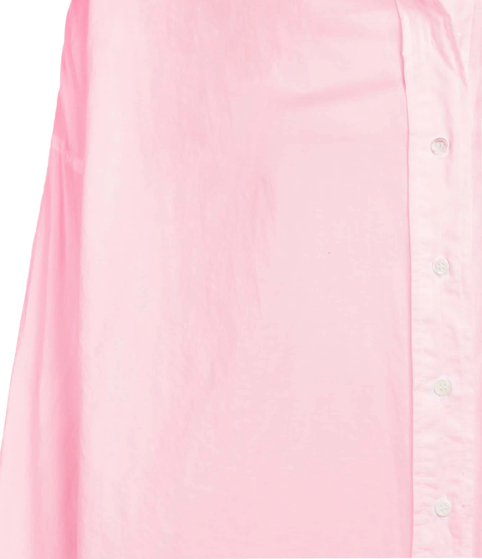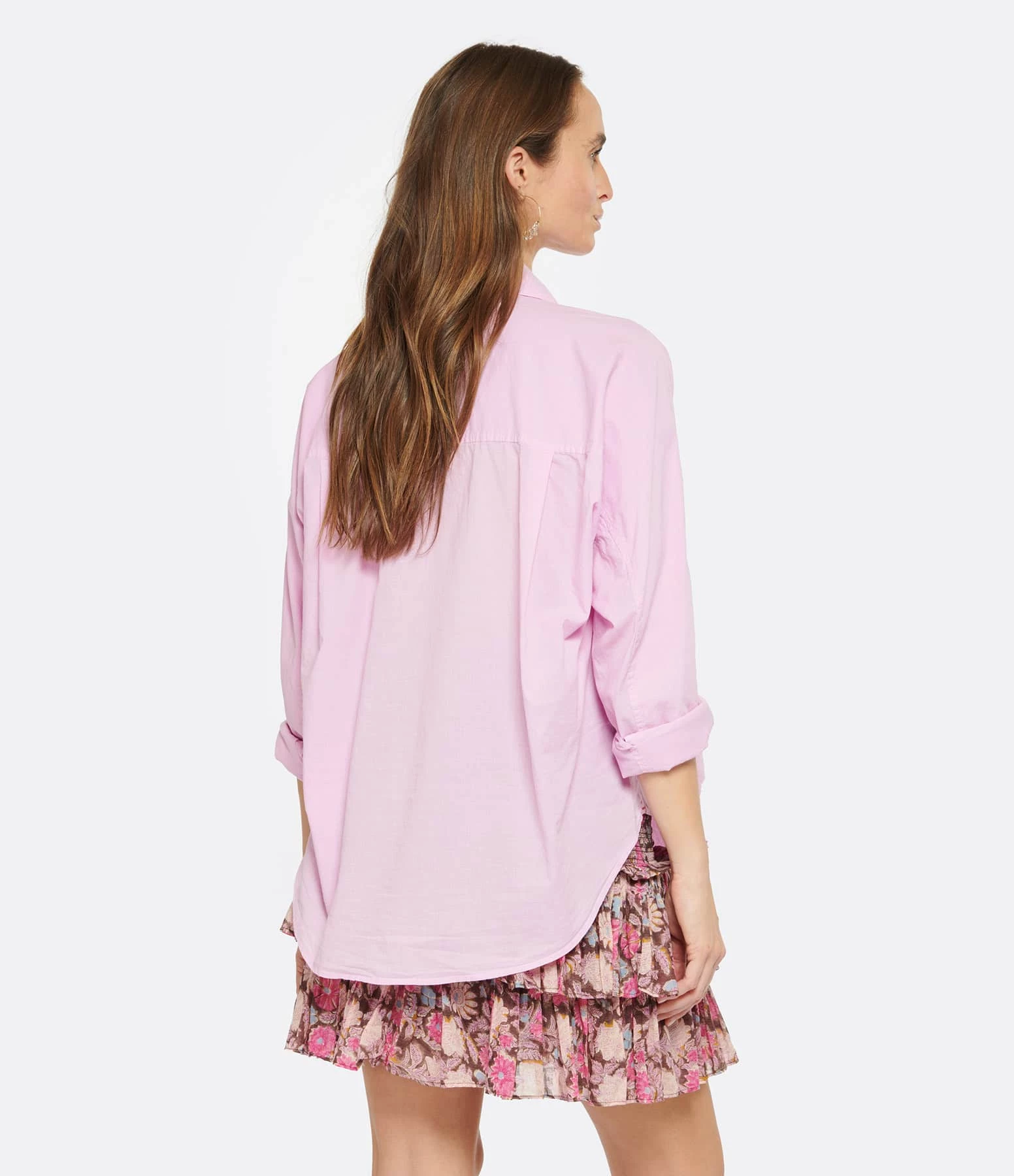 Chemise en coton rose . Col chemisier. Manches longues avec fentes et poignets boutonnés. Fermeture boutonnée sur le devant. Boutons blancs. Coupe droite ample. Base arrondie plus longue à l’arrière.