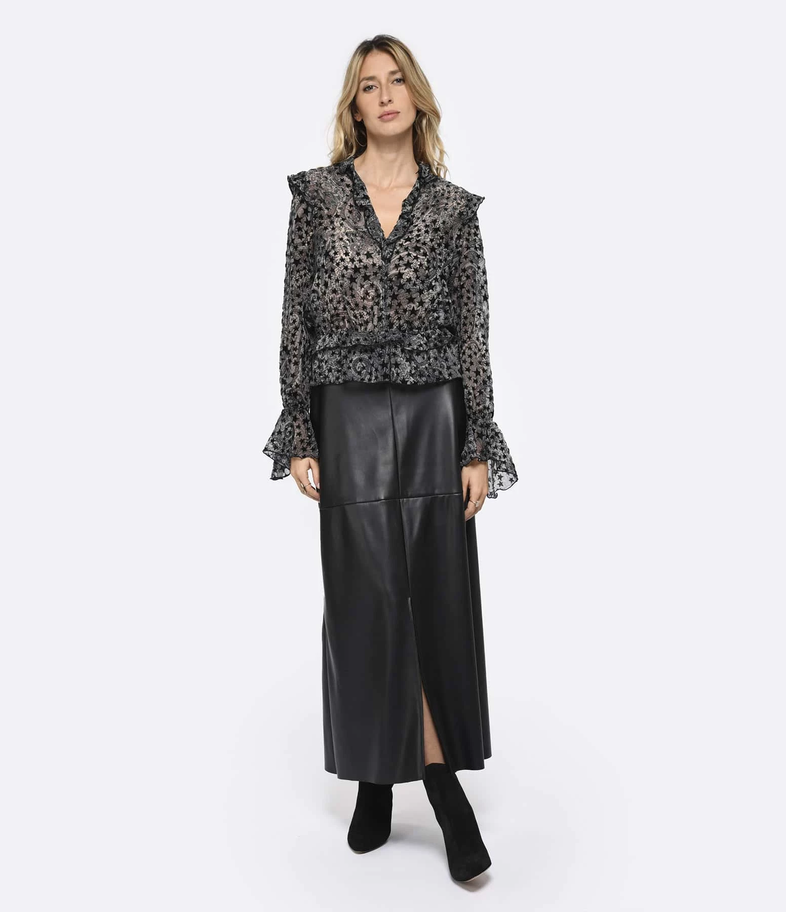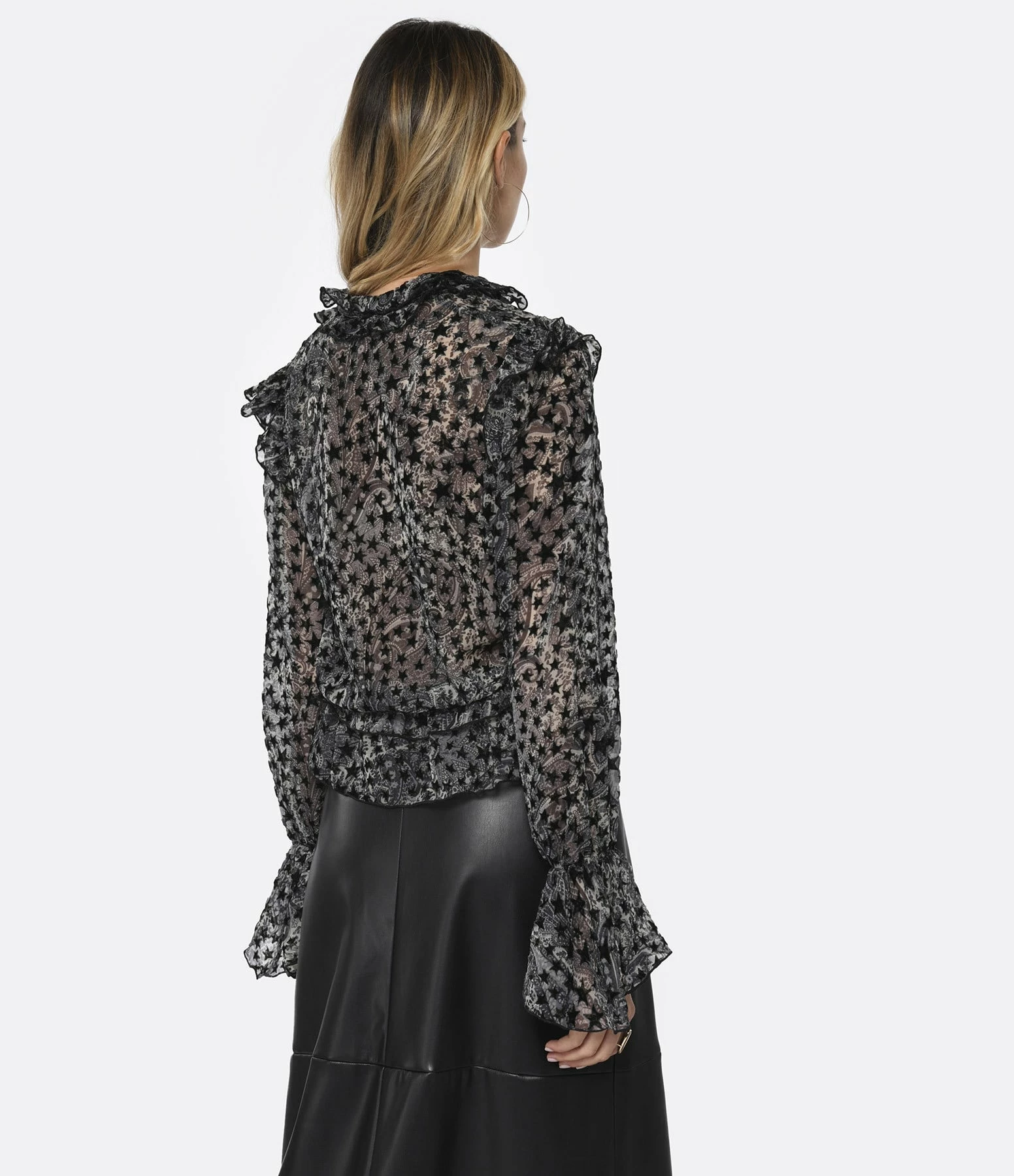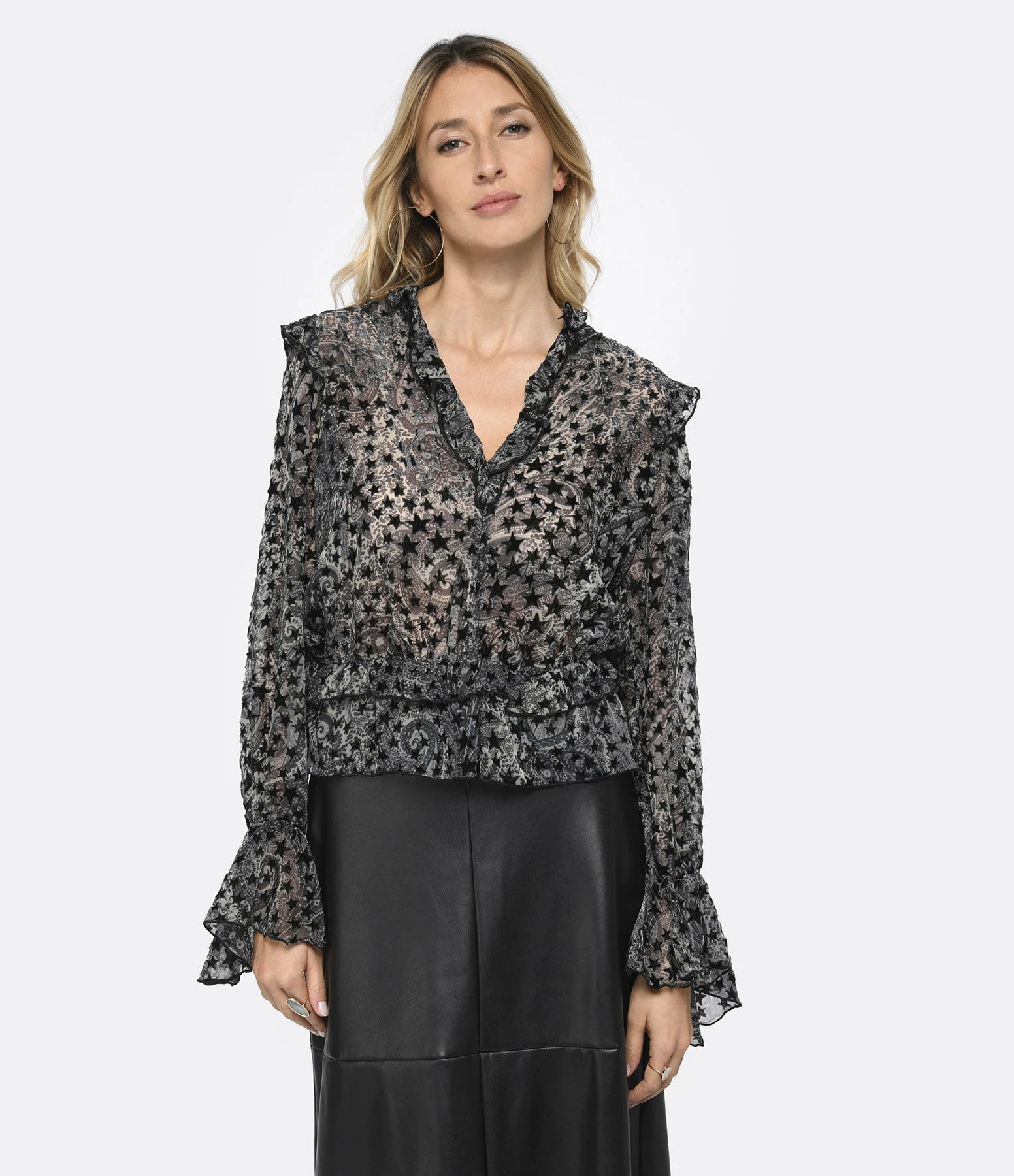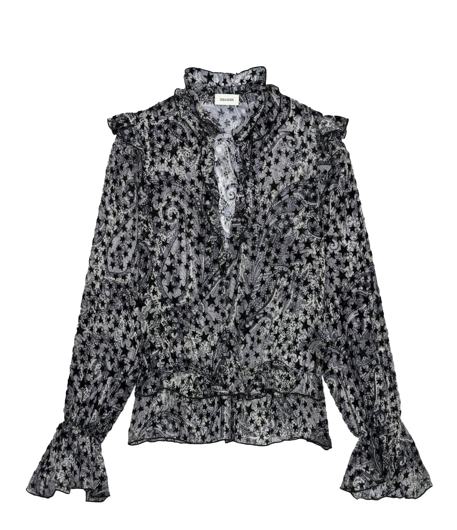 Blouse grise à imprimé bandana et étoiles en velours. Col V. Détails froncés et volantés. Manches longues évasées. Coupe droite. Base droite.