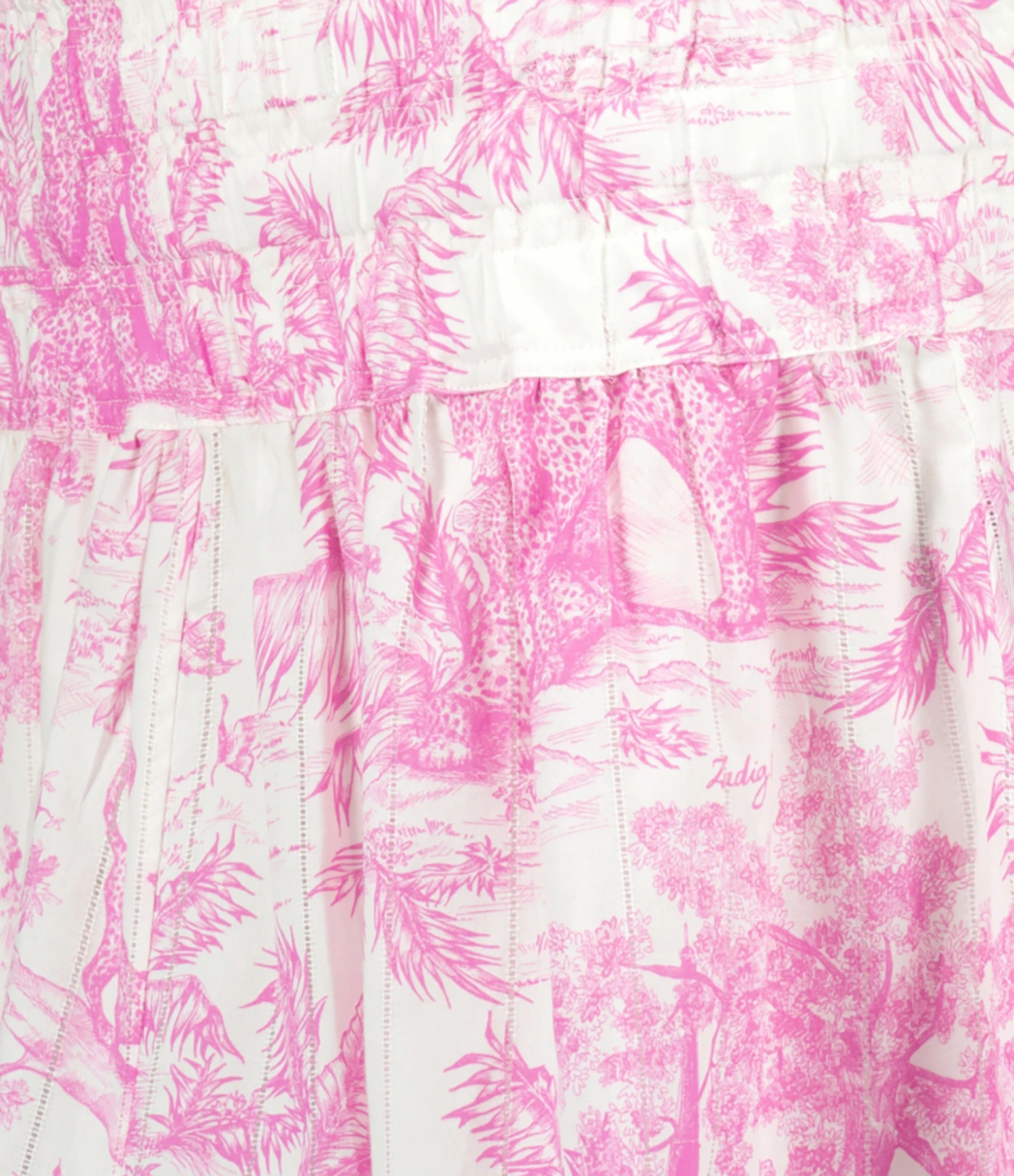 Jupe courte à imprimé savane rose sur fond blanc. Taille élastiquée. Effet plissé sur toute la jupe. Coupe droite. Base droite à dentelle blanche.