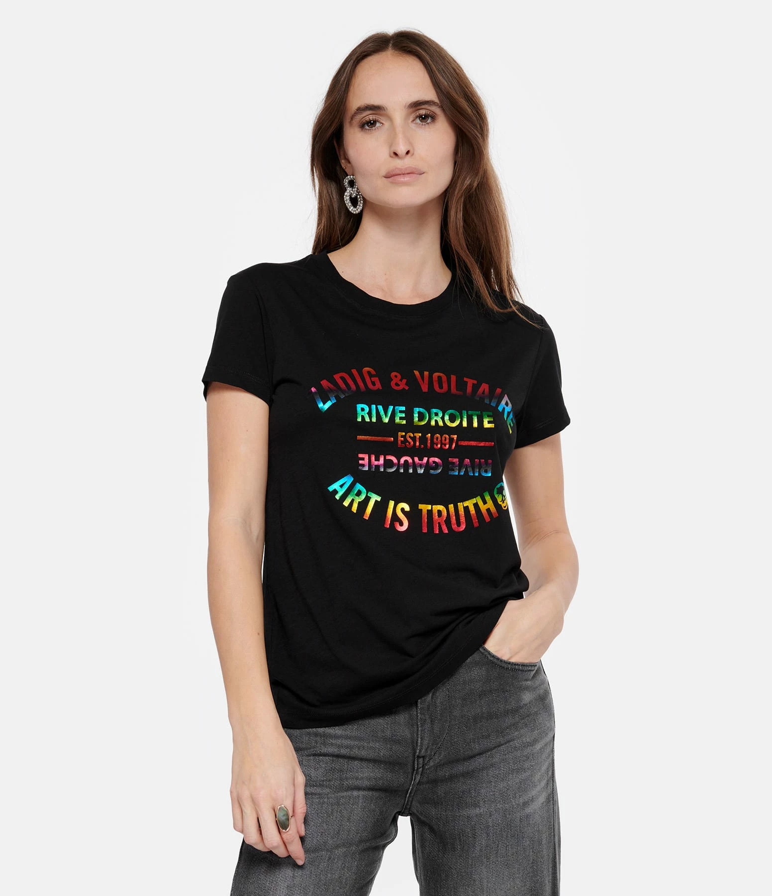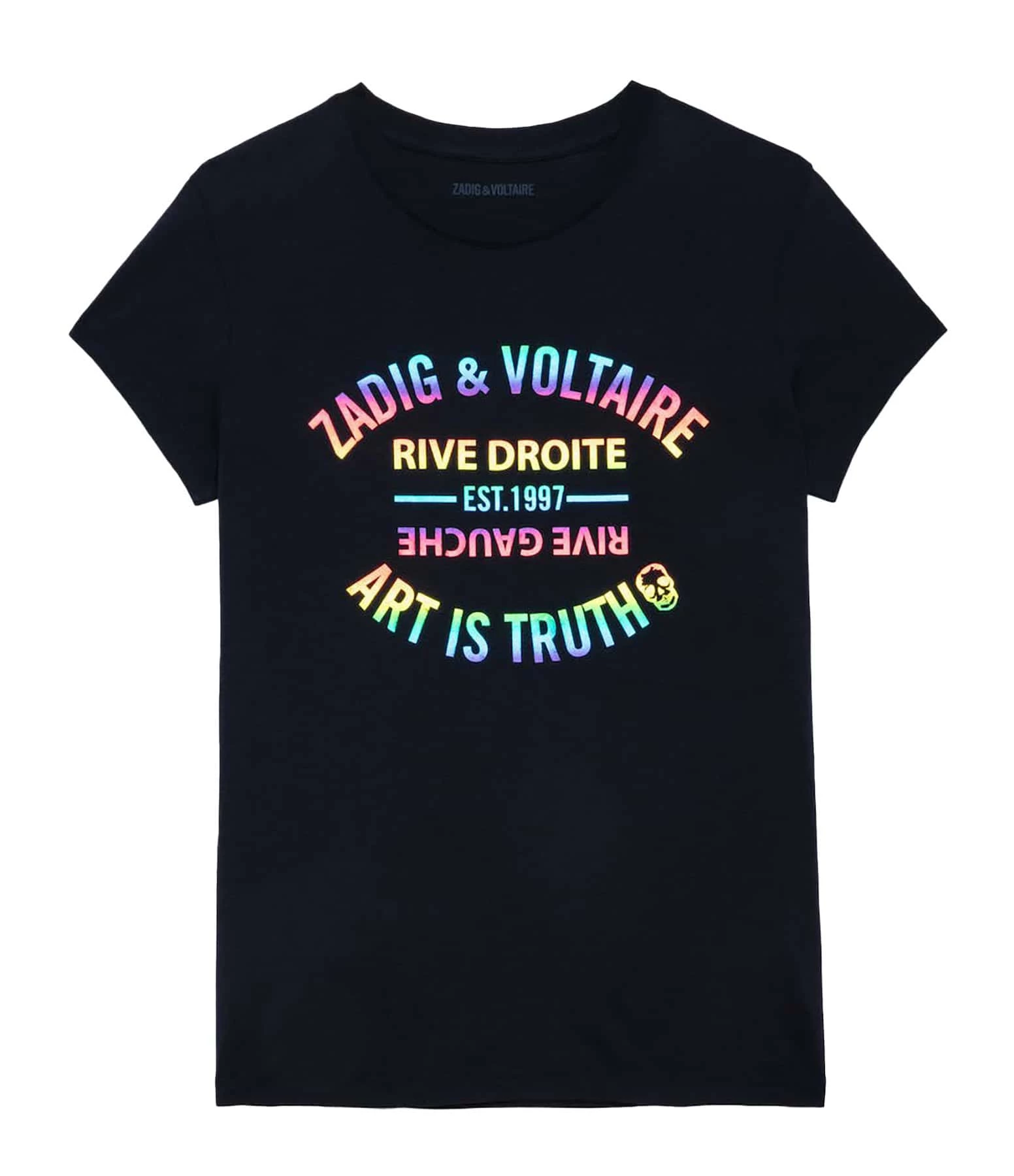 Tee-shirt noir en coton pour femme, impression “ZADIG & VOLTAIRE” sur le devant en multicolore. Col rond. Manches courtes. Base droite.