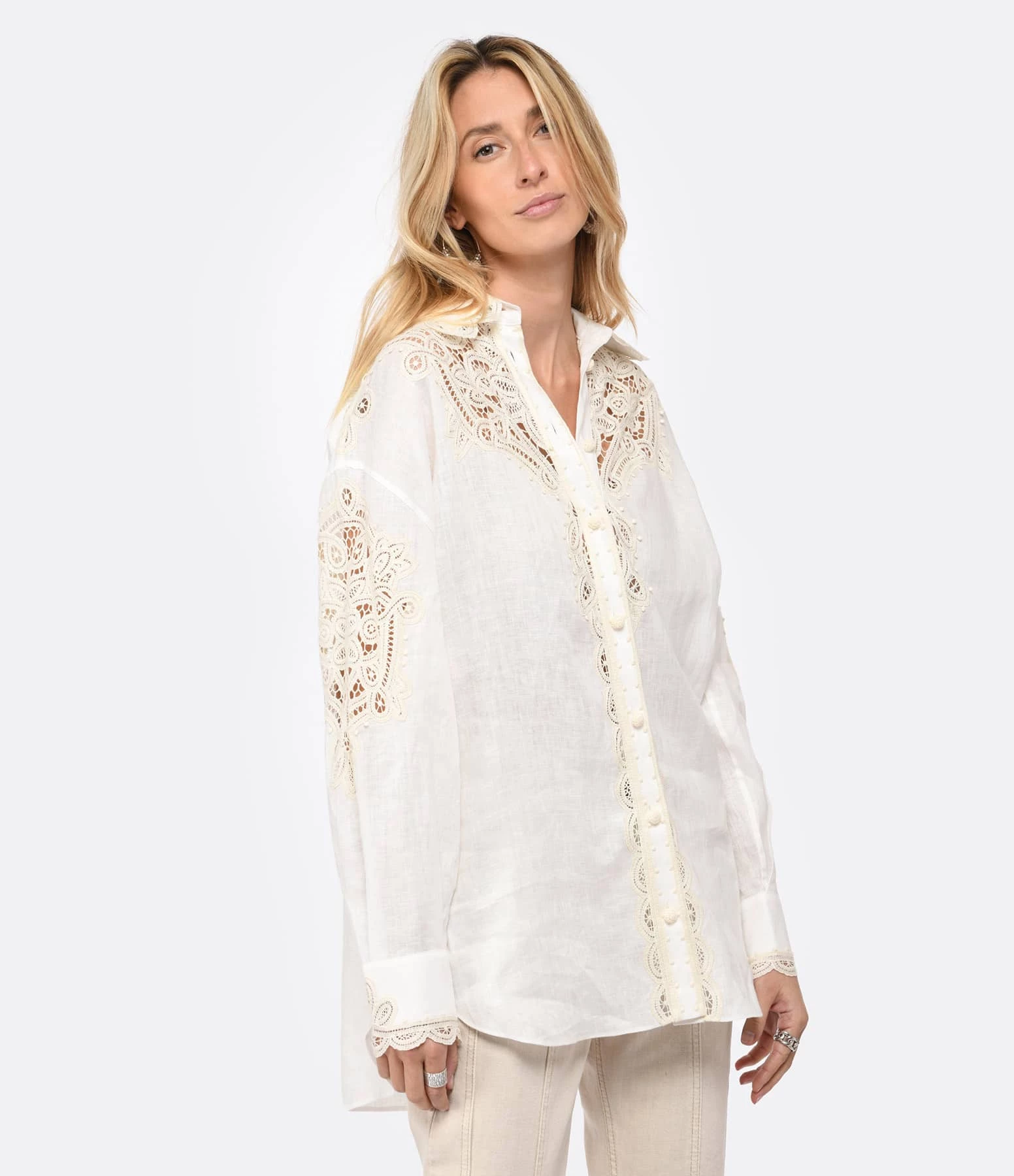 Chemise en lin ivoire avec détails de dentelle. Fermeture sur le devant par boutons. Col chemisier à bords dentelés. Manches longues avec boutons aux poignets. Coupe droite. Base arrondie.