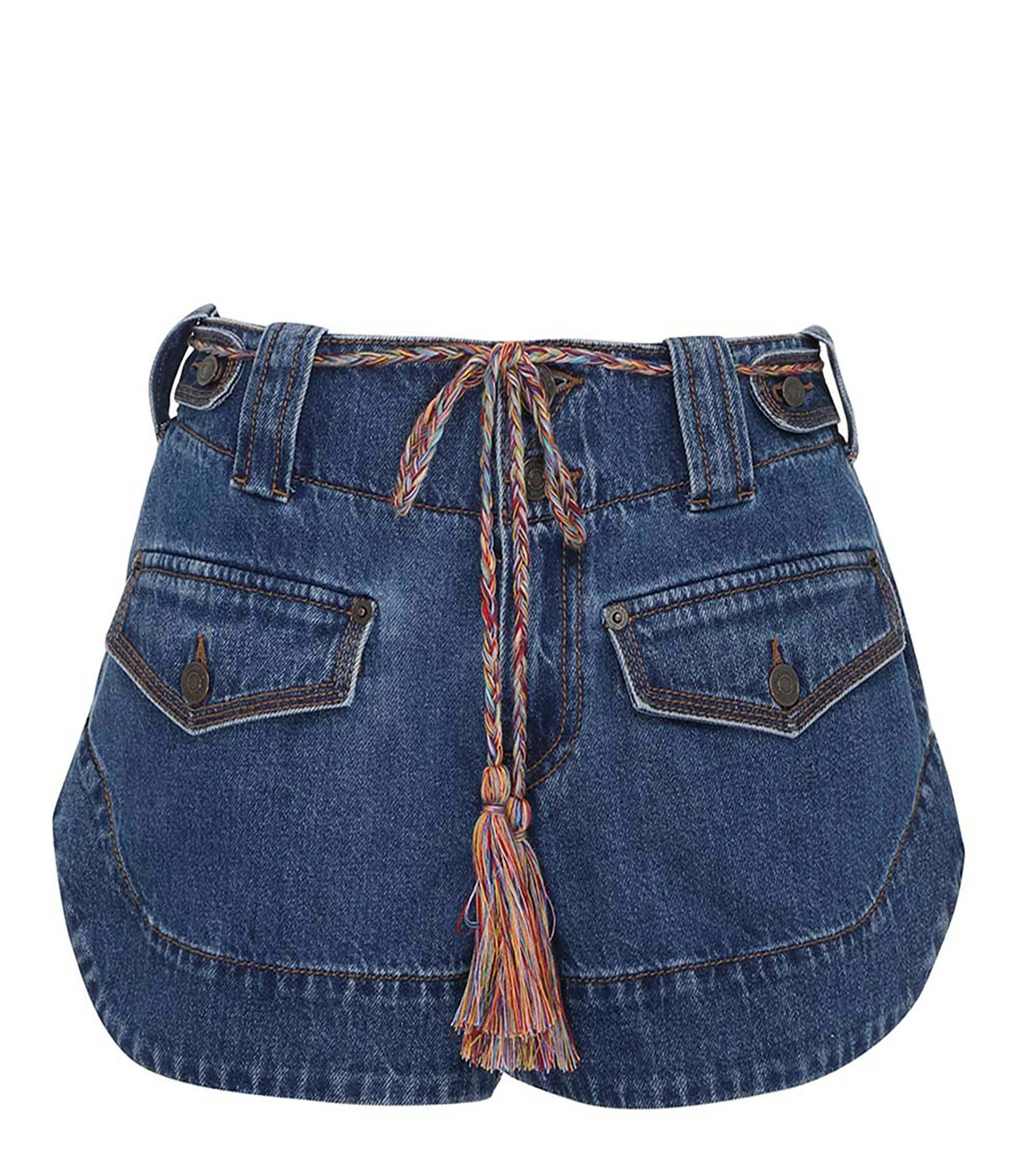Short en denim de coton bleu. Taille haute avec larges passants pour ceinture amovible tressée multicolore à pompons. Pattes de serrage boutonnées à la taille. Braguette zippée et double bouton. Deux fausses poches à rabat boutonné sur le devant. Boutons métalliques bronze. Deux poches plaquées dans le dos. Soleil brodée sur la poche droite arrière. Coupe droite. Base arrondie.