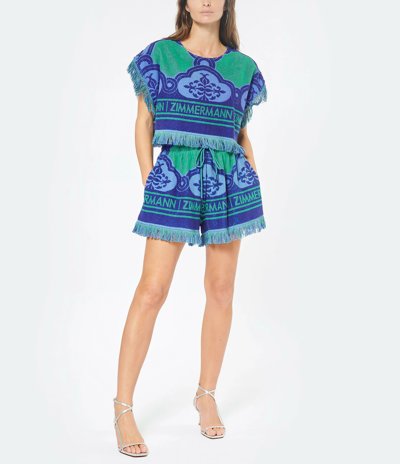 Crop top en coton éponge orné de motifs floraux et d’une bande estampillée Zimmerman vert et bleu. Col rond. Manches courtes dolmans avec bords frangés. Coupe ample. Longueur raccourcie. Base droite avec bords frangés.